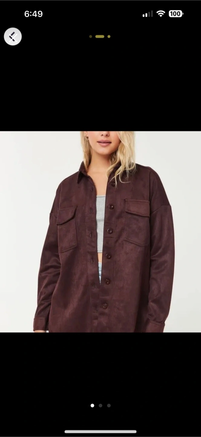 Long sleeve button up shirt jacket. Features chest pockets. Burgundy colour. Oversized fit.