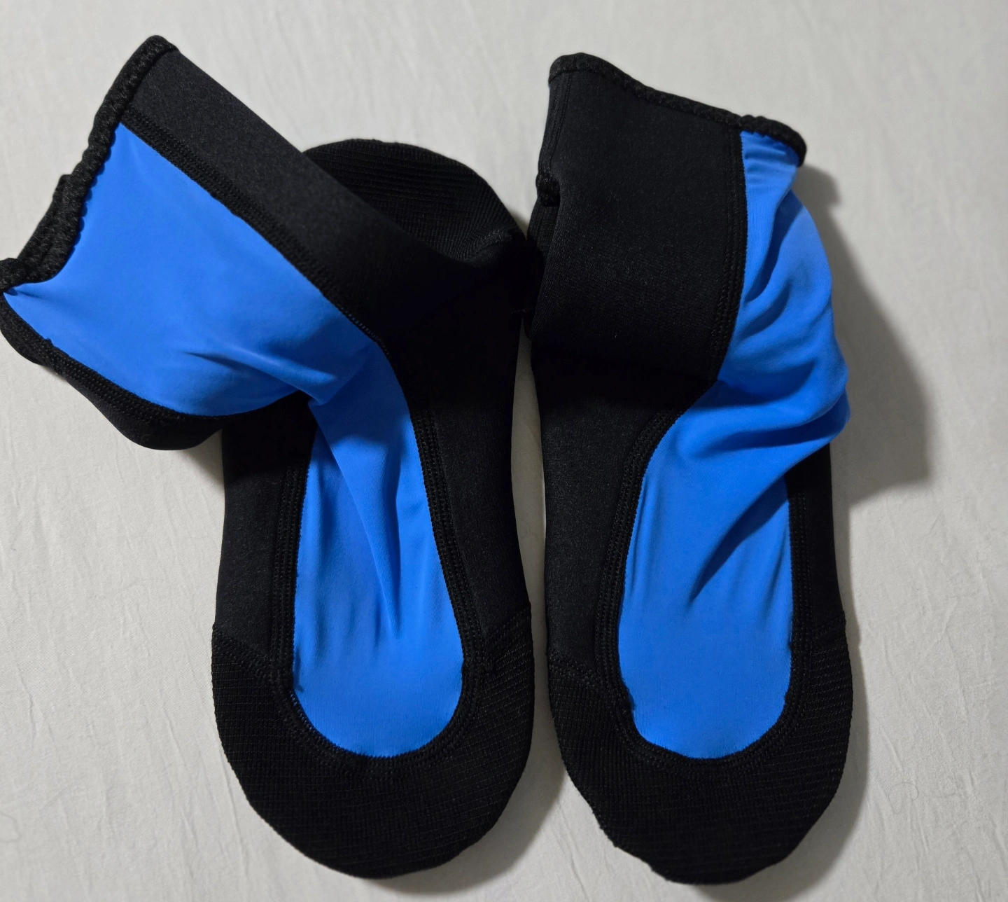 Pair of Xuker brand neoprene socks. Black and blue. Anti-slip sole. Breathable and skin friendly. Great for water sports.