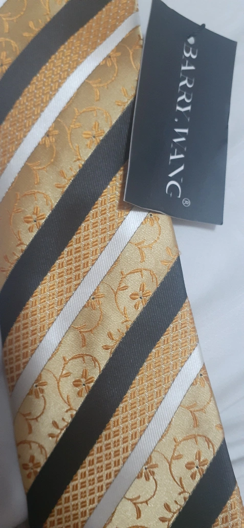 Elegant men's tie. Features gold, black and white diagonal stripes. Subtle pattern woven into the gold fabric. New with tags. Cash payment please. Sorry no e-transfers. Pickup in Etobicoke near Eglinton Ave West