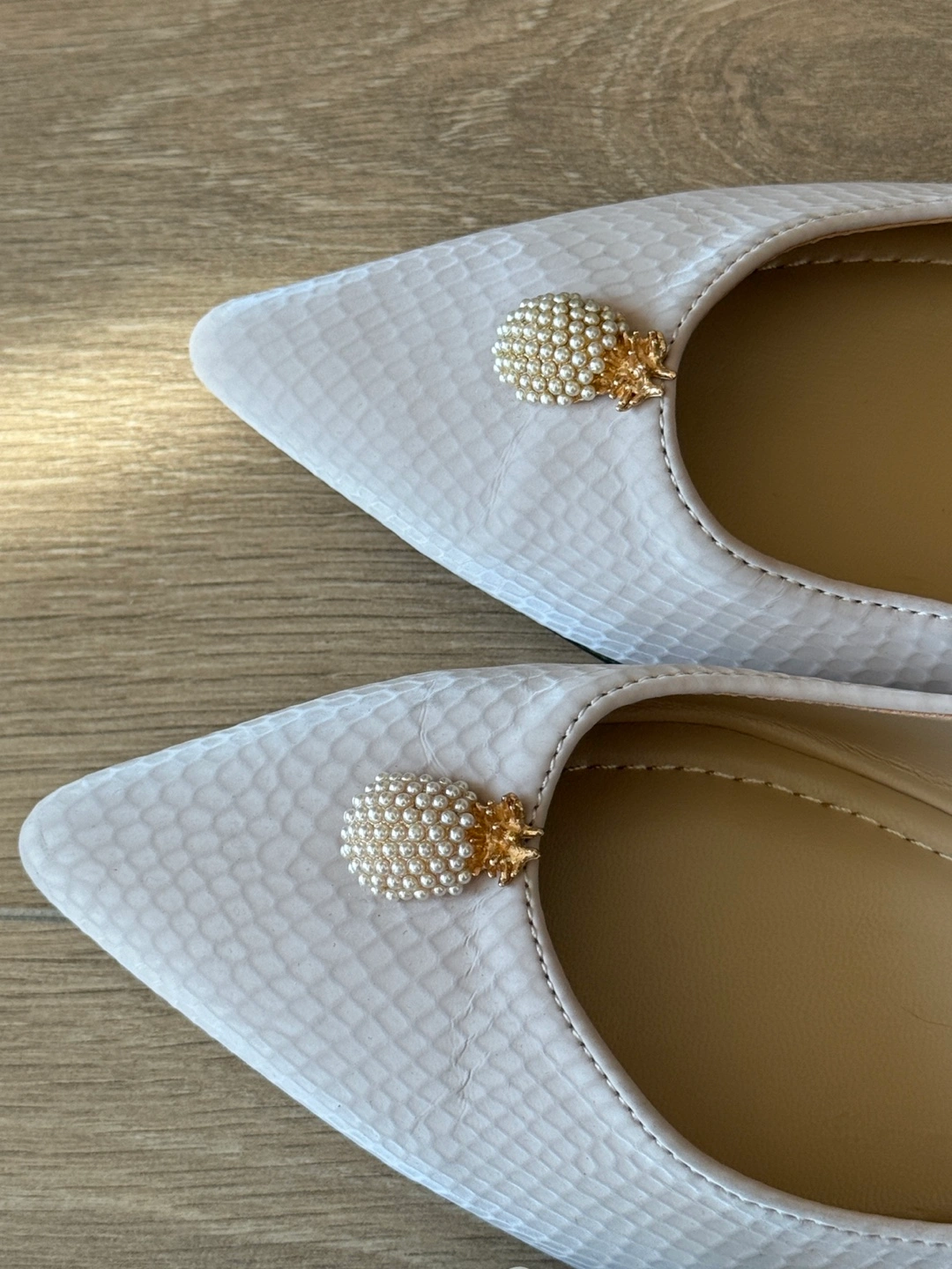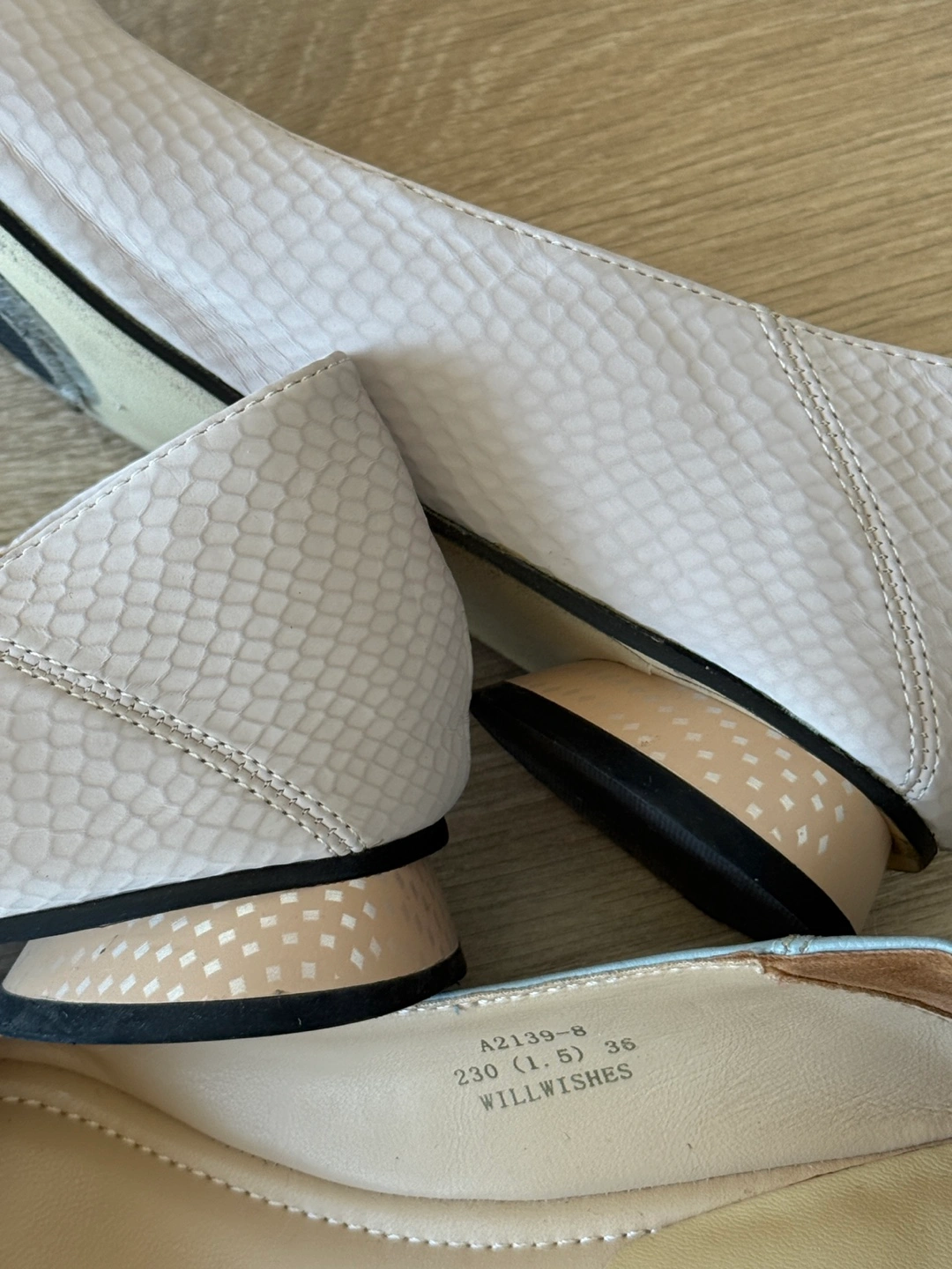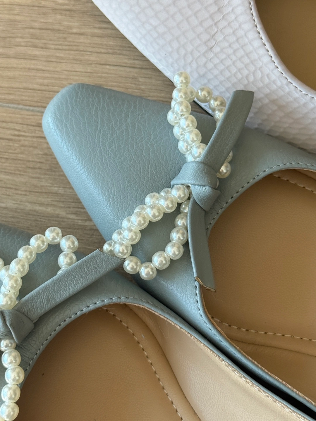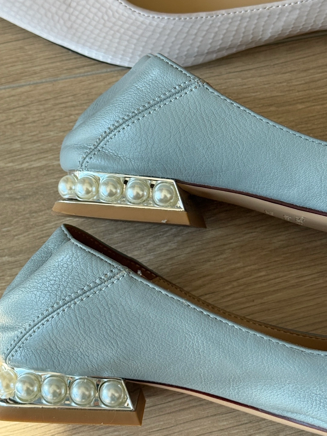 Two pairs of women's flats. One pair light grey snakeskin with pearl embellishment. The other pair light blue with pearl bow detail. The heel can be stepped on without rubbing the foot. Size 36. $15 each DT Queen st pickup