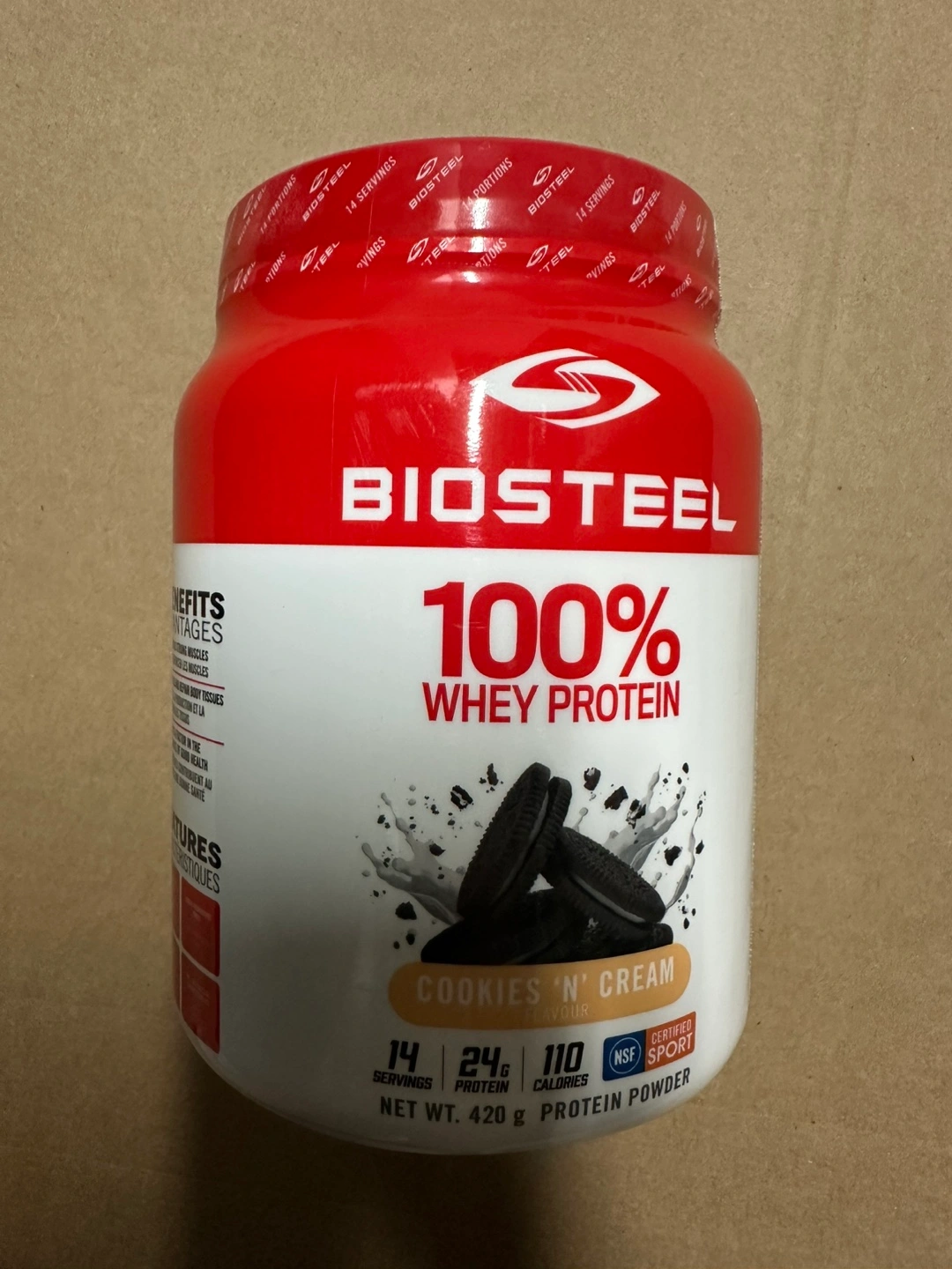 420g container of Biosteel 100% whey protein powder. Cookies 'n Cream flavour. 14 servings. Expires January 2026.