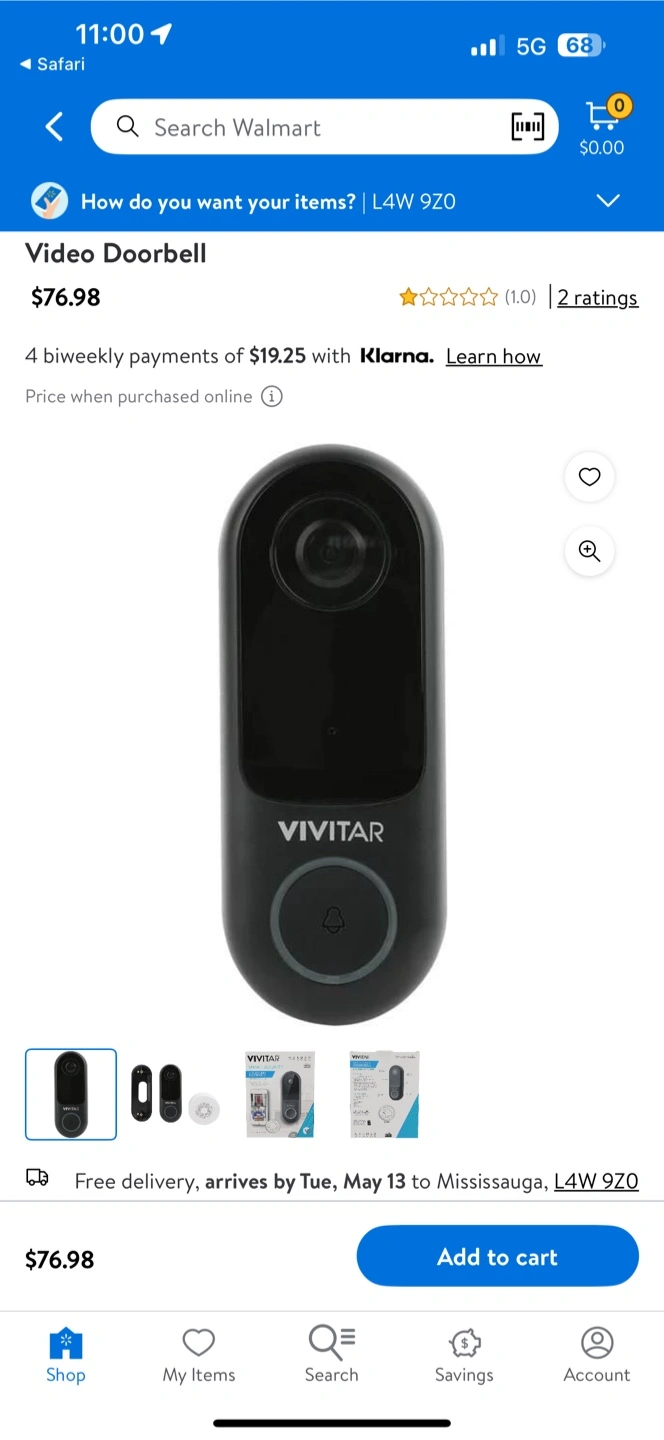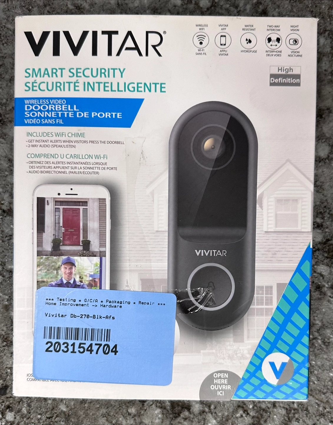 Wireless video doorbell. Includes Wi-Fi chime. Two-way audio. High definition. Night vision. Water resistant.