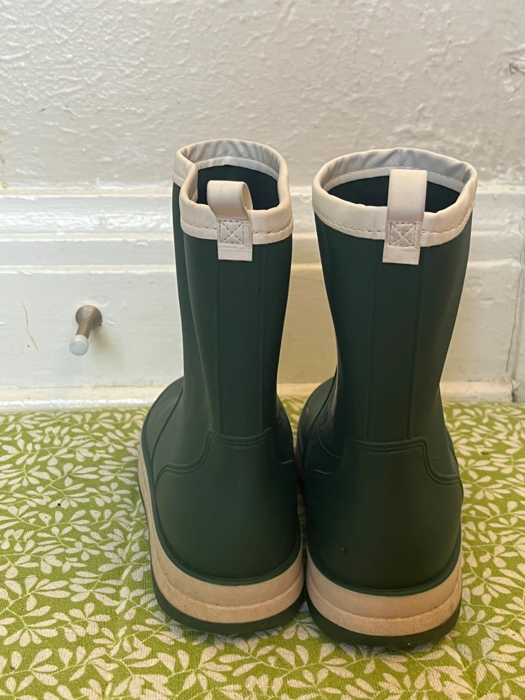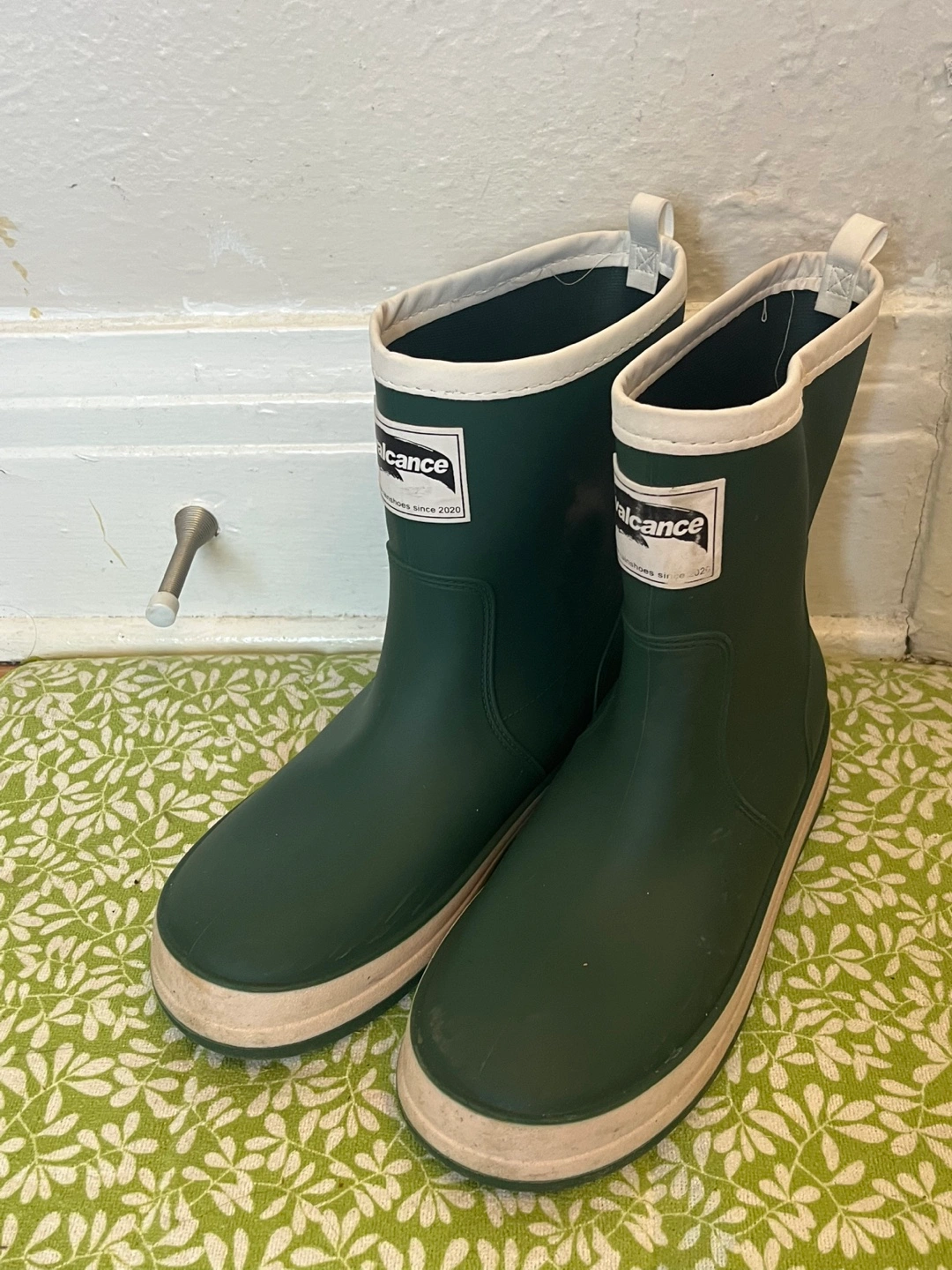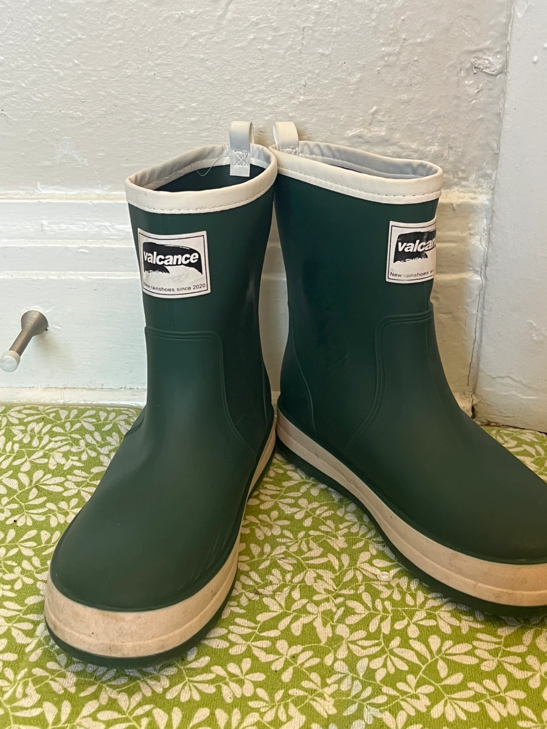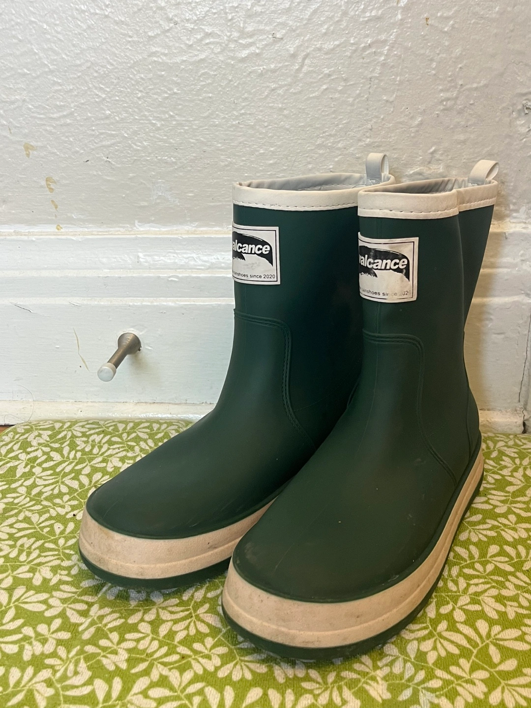 Pair of dark green rain boots. Features a cream-coloured sole and inner cuff. Good for rainy weather.