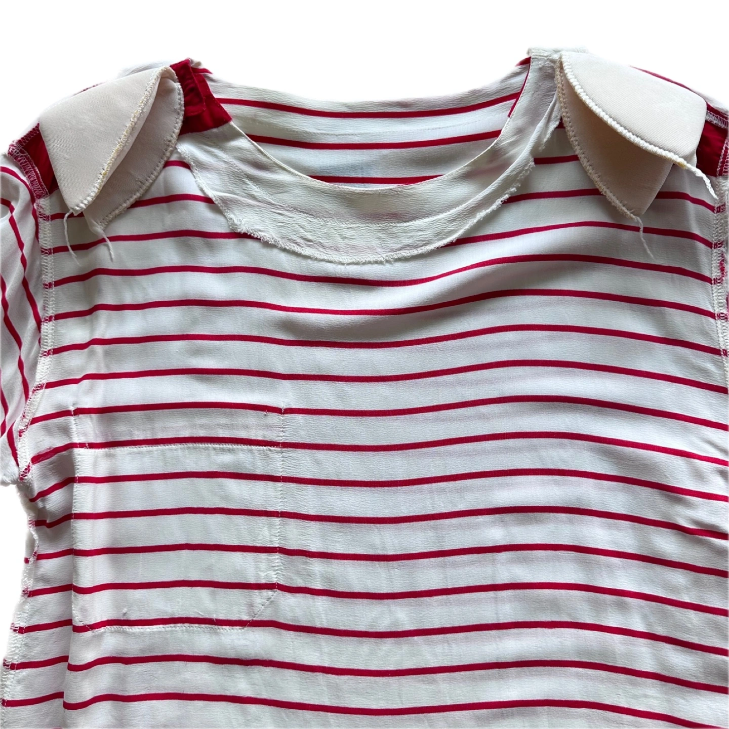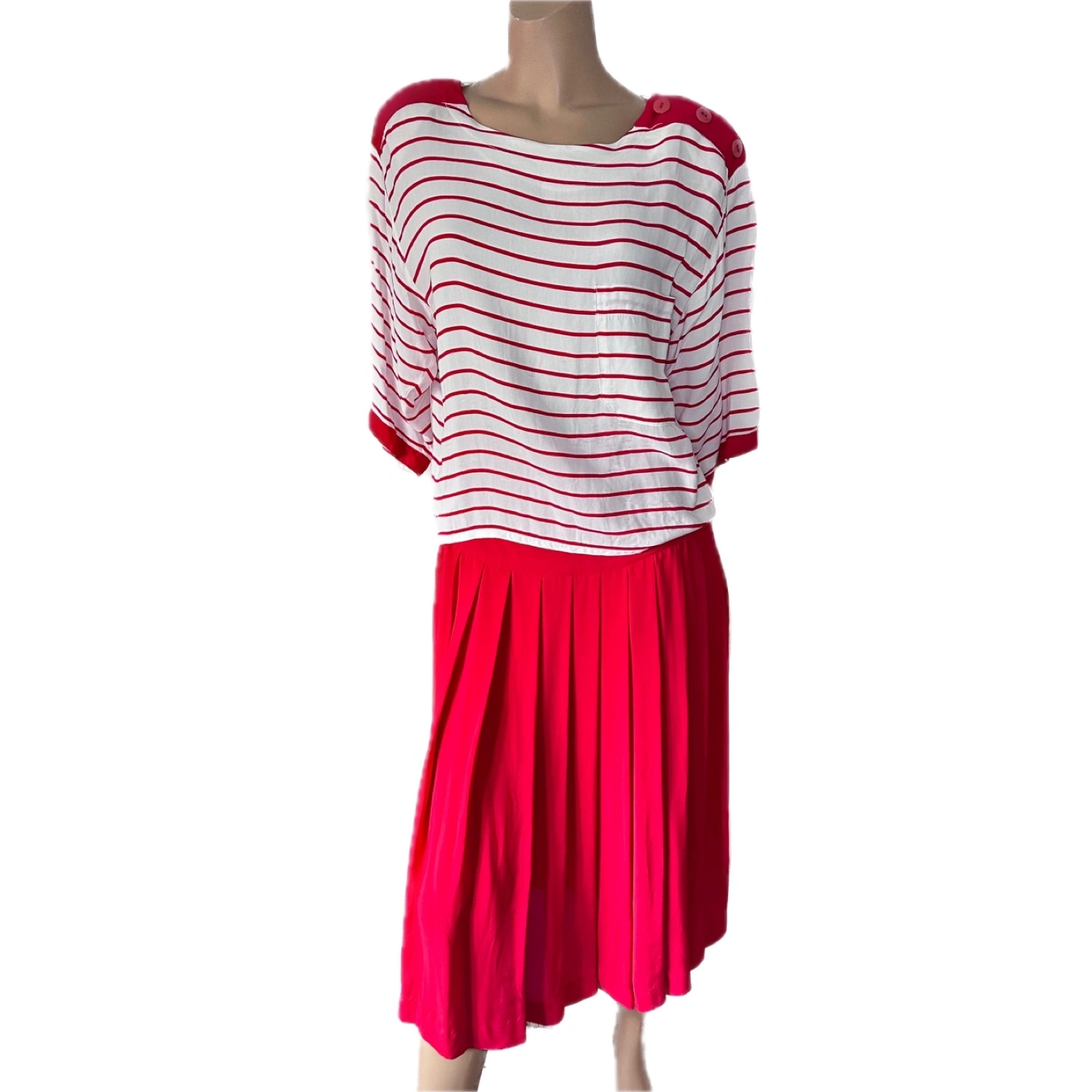 Vintage 80s Arpeges Red and white striped crop blouse with a pleated red midi skirt. Short sleeves and button accents. Shoulder pads. Midi skirt with yoke. Unique vintage style. Condition : Good. Top button hole on the side of the skirt is slightly stretched. Ideal for vintage fashion enthusiasts with a tailored design. - Brand: Vintage Arpeges - Material: 100% Viscose - Blouse: Chest 39", Shoulder 19.5", Length 22.25" - Skirt: Waist 24", Length 32", Hip 36" - Size: US 6 / EU 38