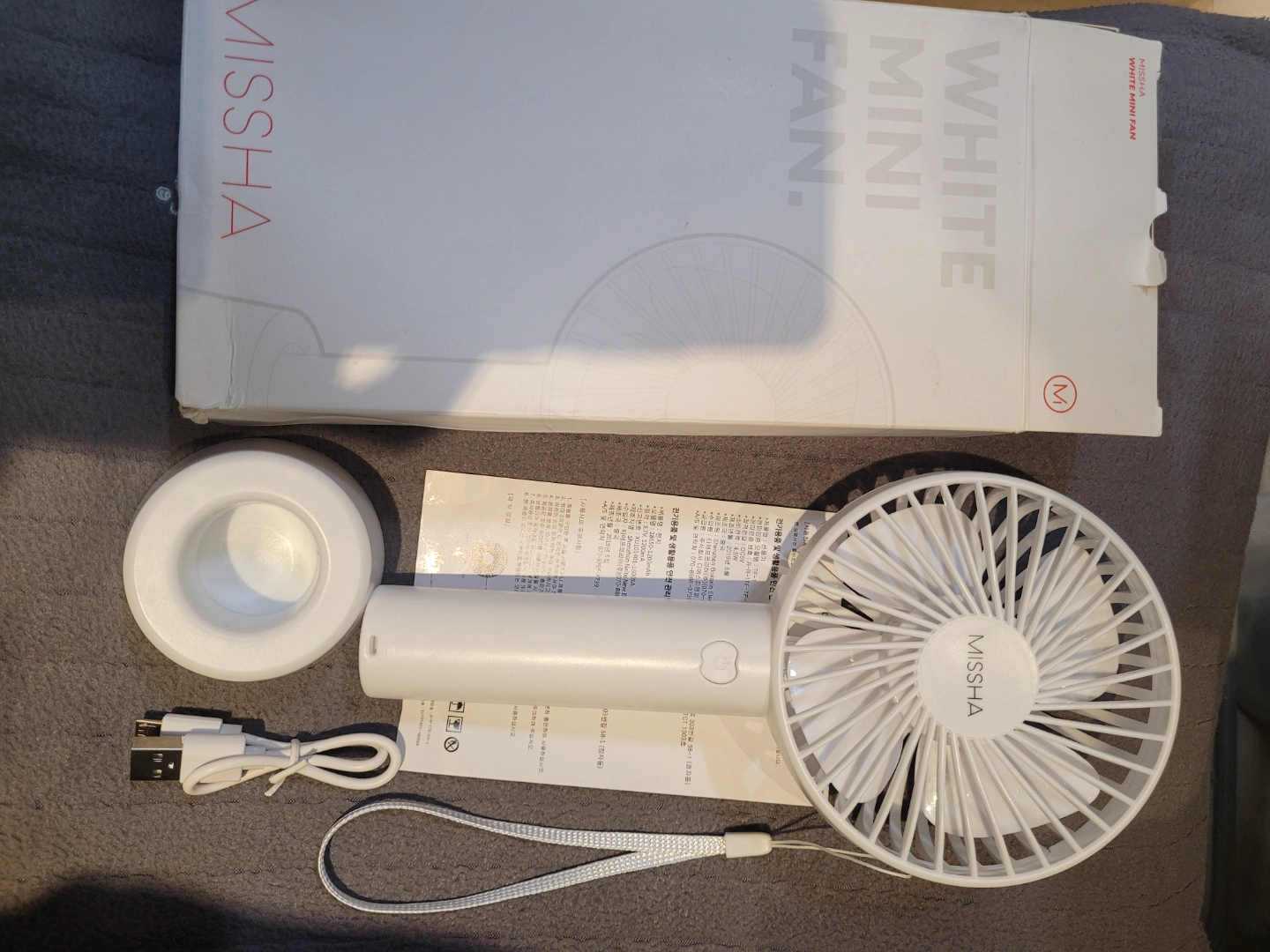 White mini fan. USB rechargeable. Includes stand and carrying strap. Brand new, never used.