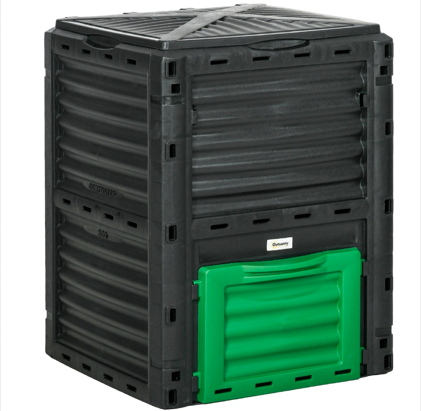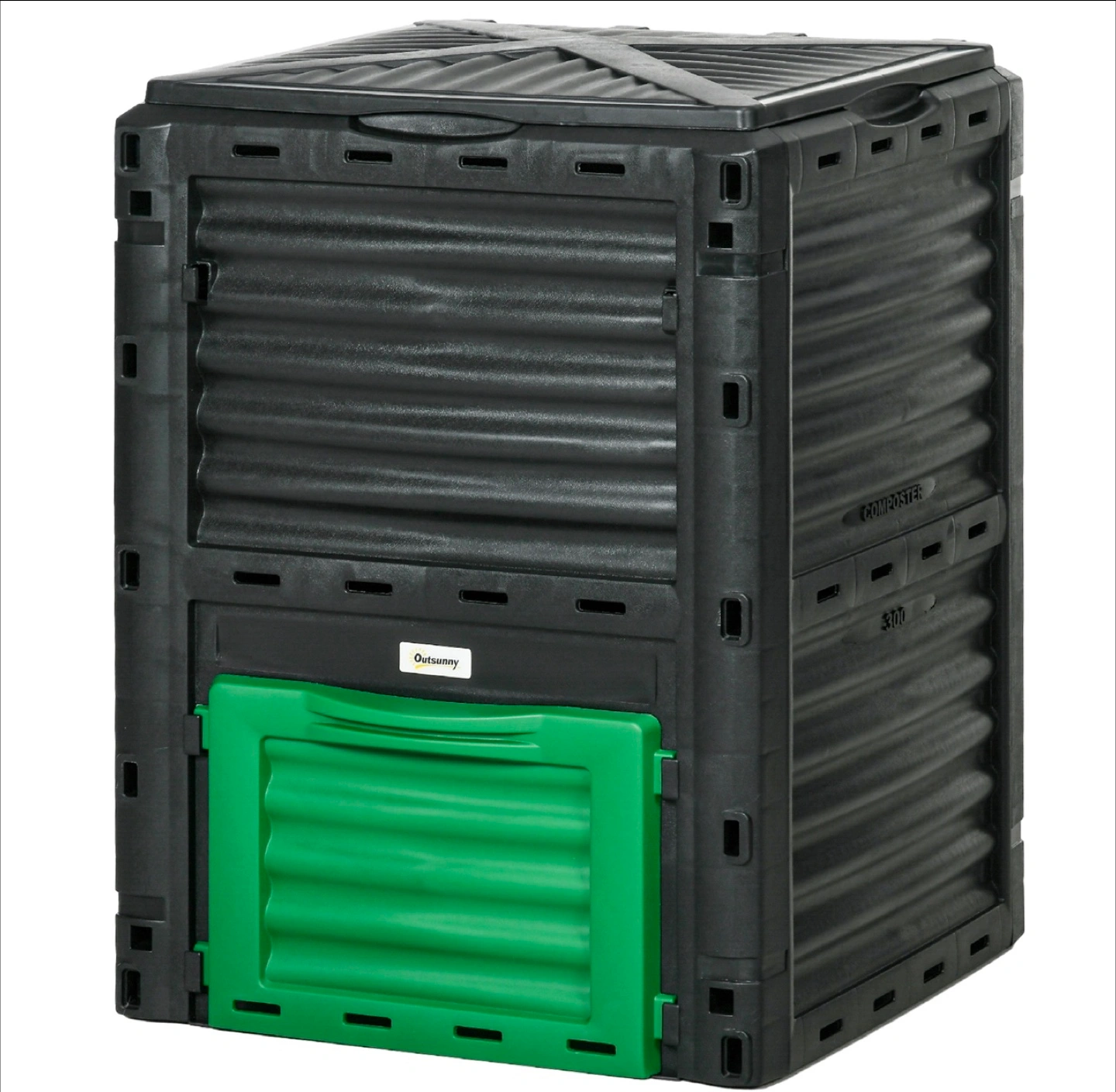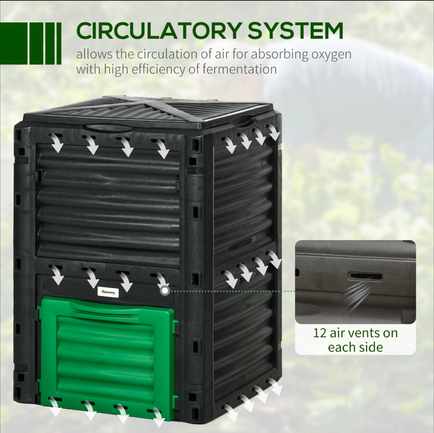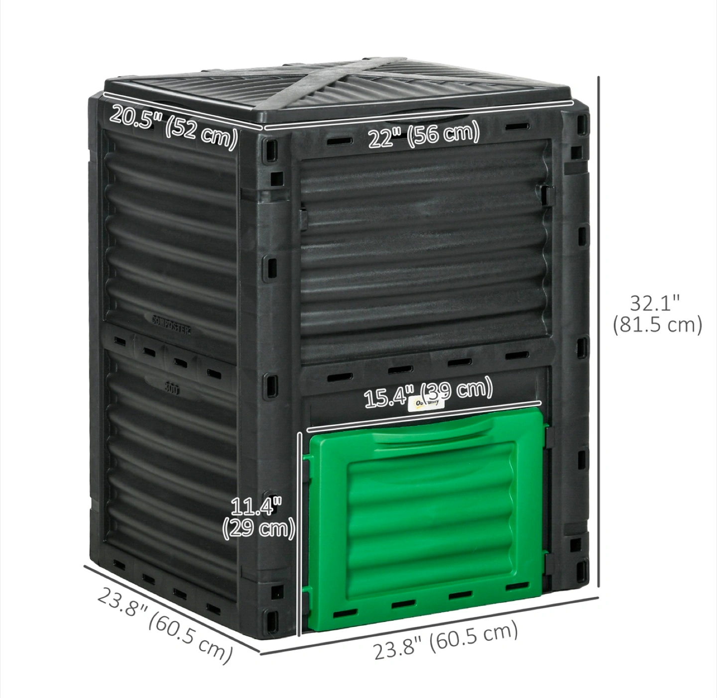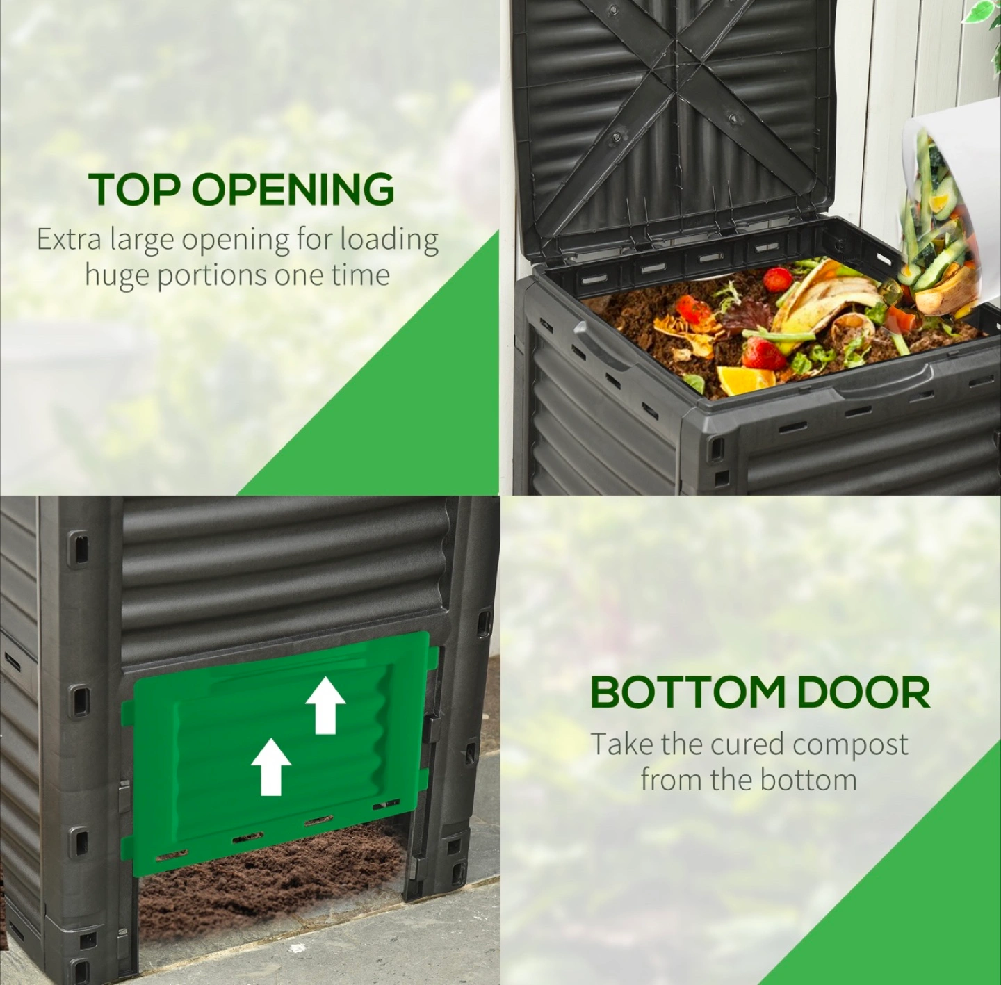 Large capacity composter. Features a large top opening for easy loading and a bottom door for convenient compost removal. Durable plastic construction. Green access door. Perfect for home gardening.