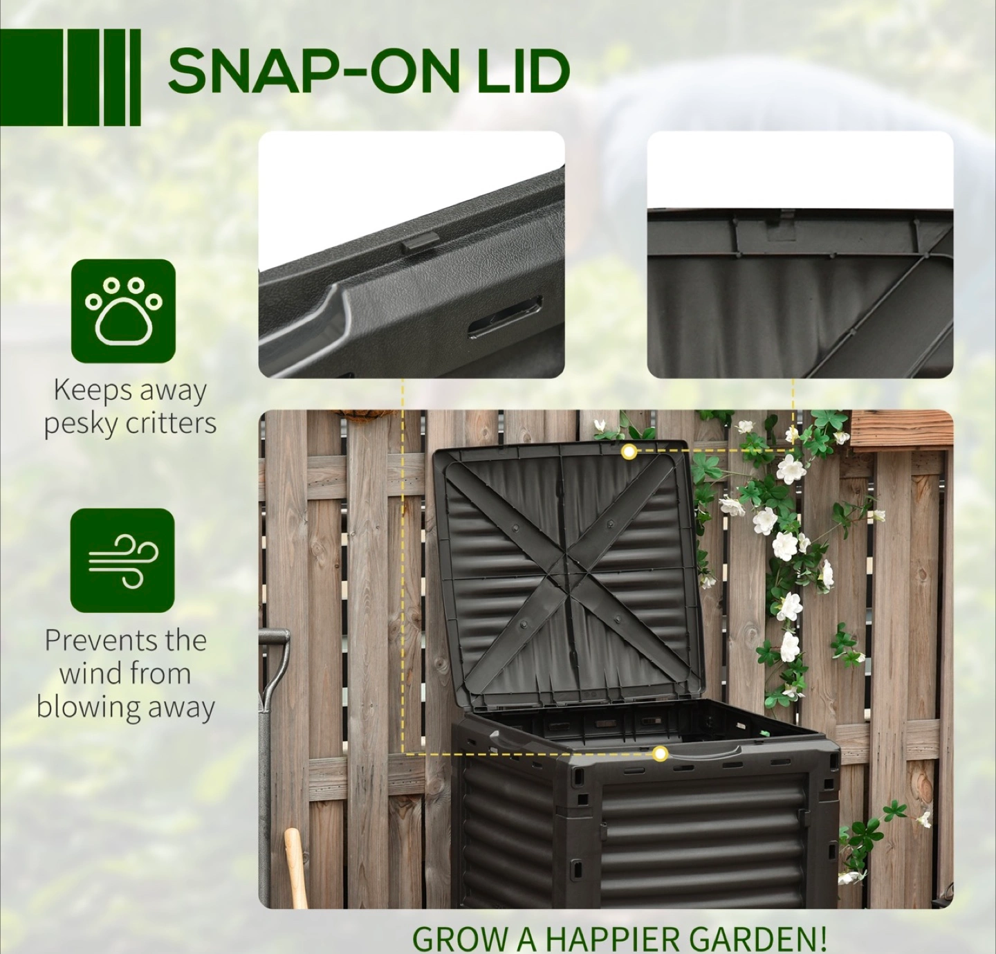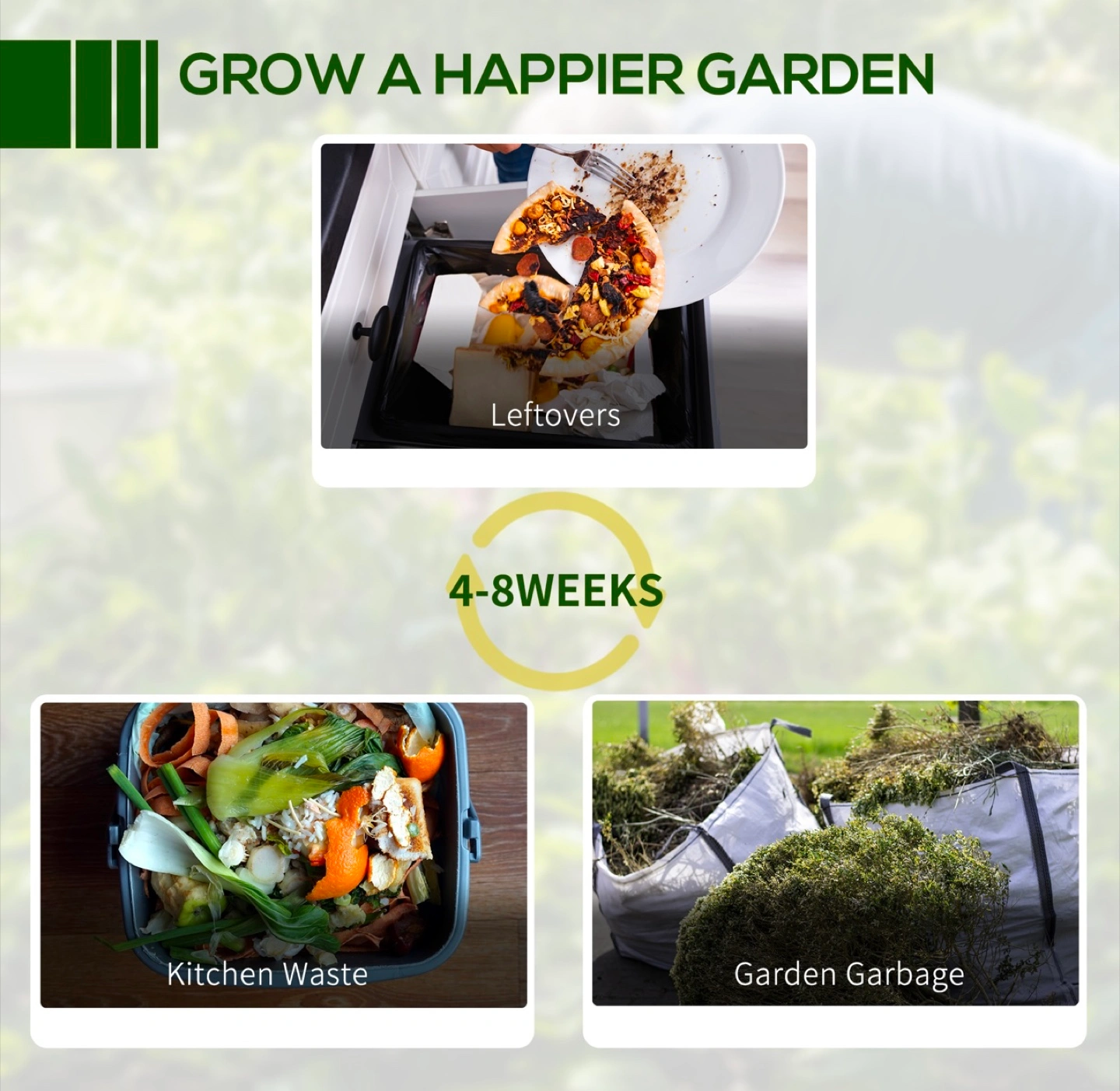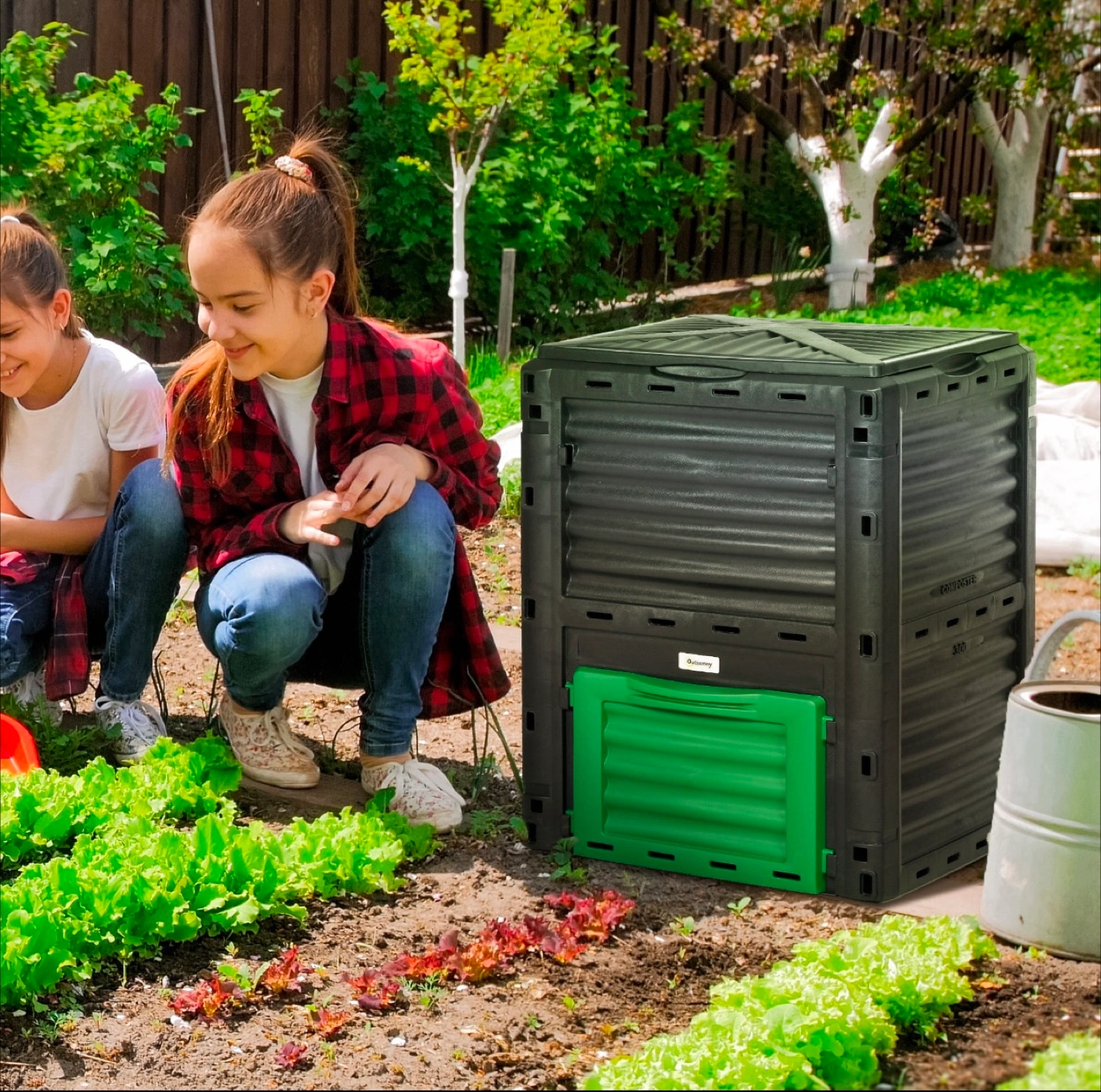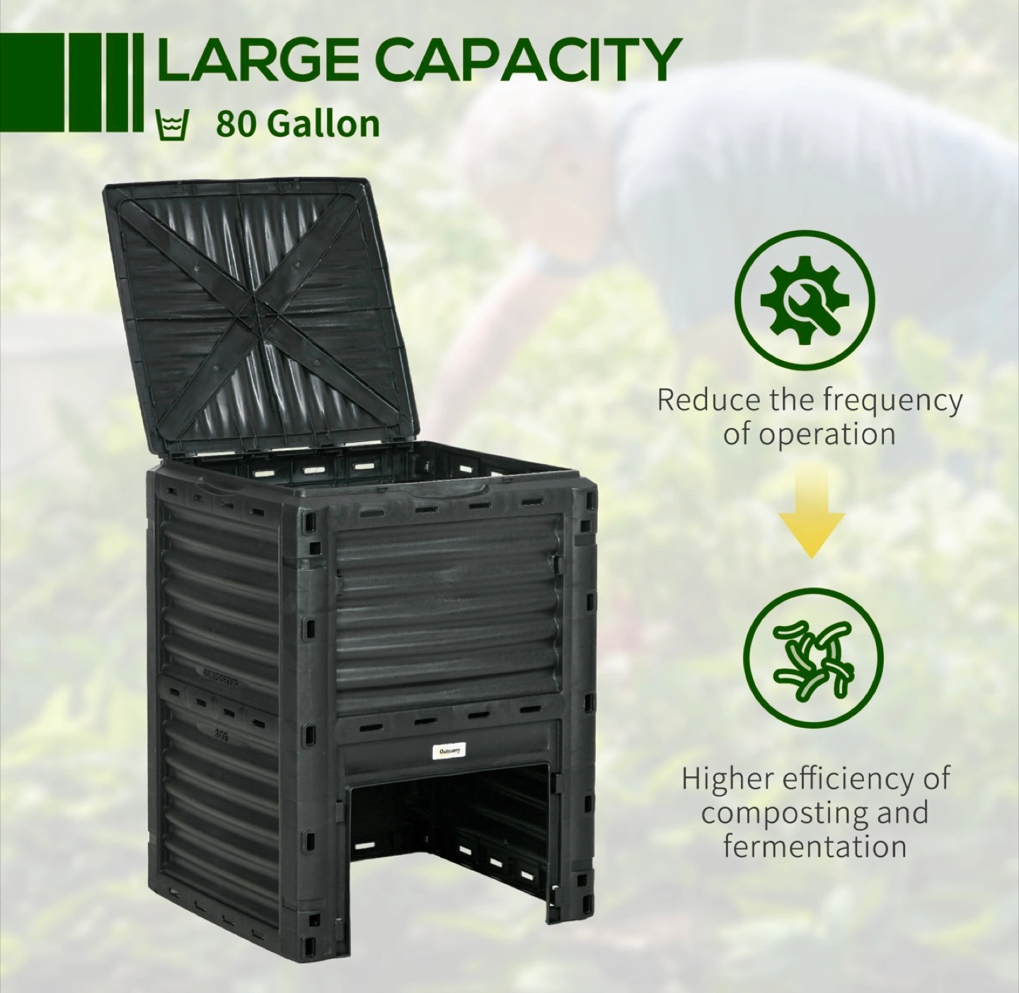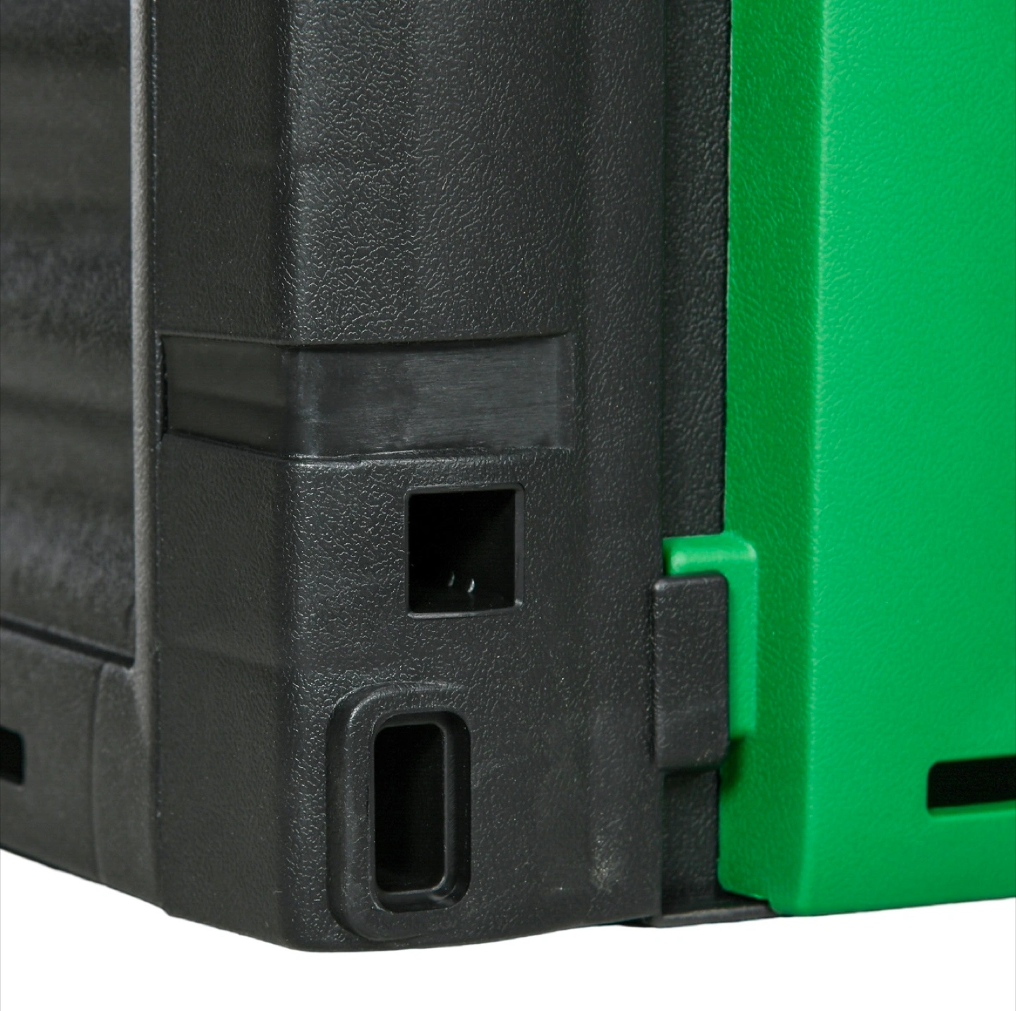 Large capacity composter. Features a large top opening for easy loading and a bottom door for convenient compost removal. Durable plastic construction. Green access door. Perfect for home gardening.