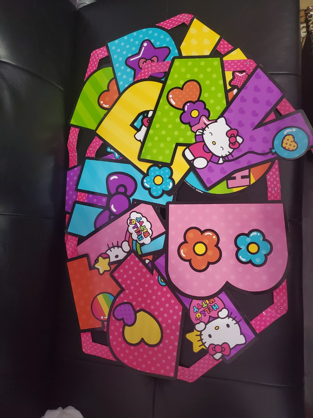 Colorful Hello Kitty birthday banner. Letters spell "Happy 12th Birthday". Features Hello Kitty images, bows, hearts, stars, and flowers. Great for a child's birthday party.
