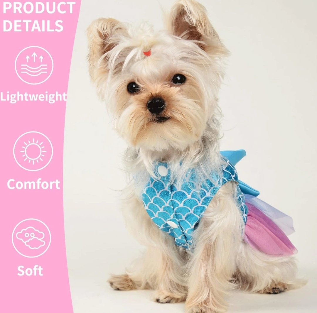 Pet apparel, small dog dress. Features a teal mermaid scale pattern, light blue satin bow, and pastel tulle skirt. Includes matching leash. Lightweight, soft, and comfortable.