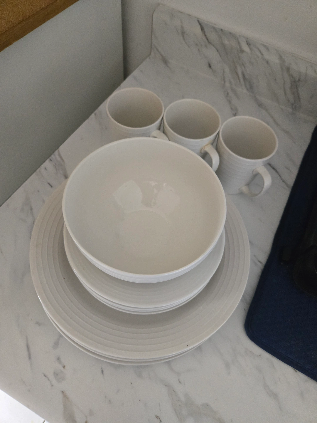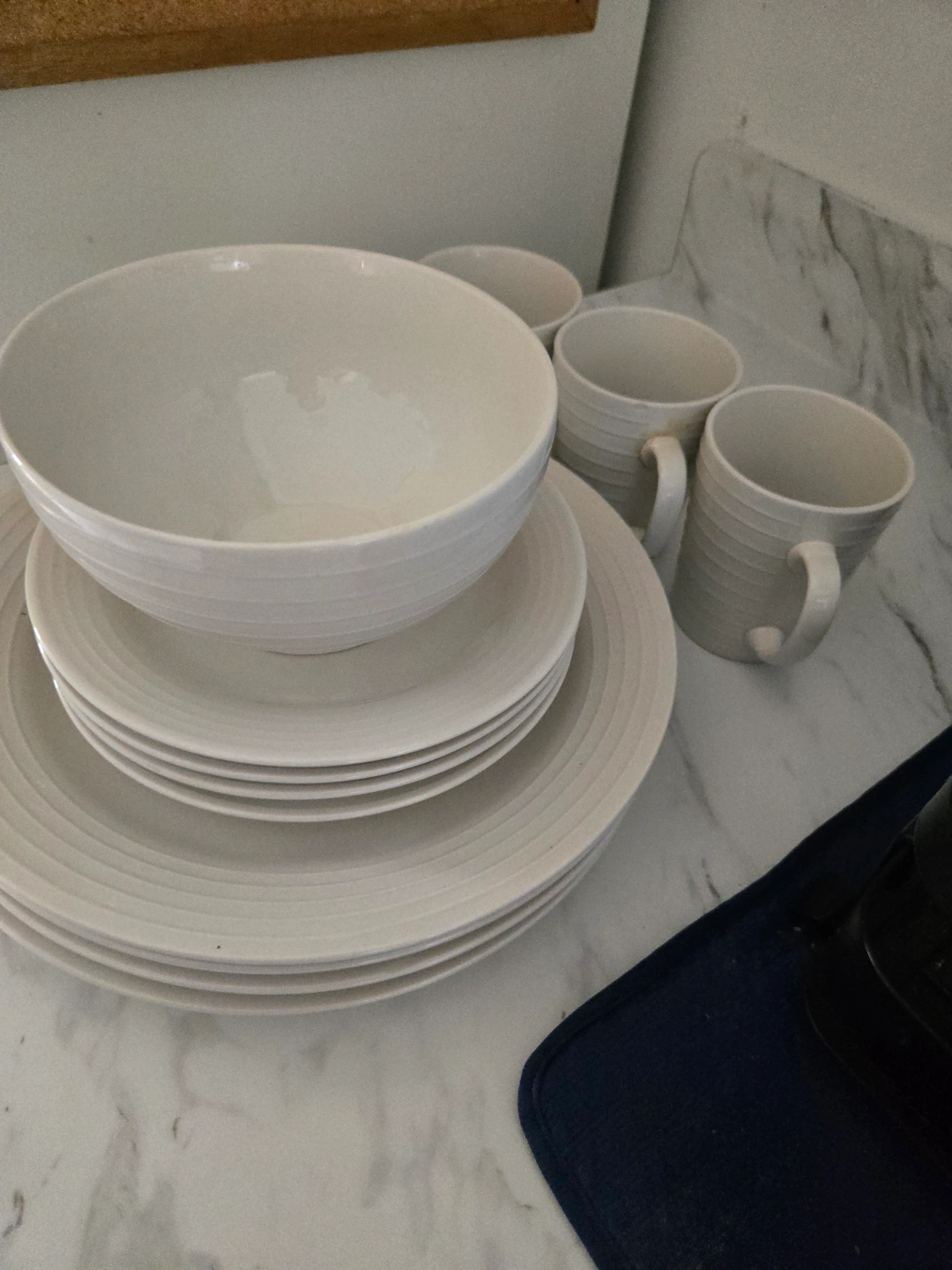 Set of white dinnerware. Includes plates, bowls, and mugs. Simple, modern design. Great for everyday use. pick in north york. 4 big plates 4 small plates one bowl 🥣 and 3 cups . wasn't used many times.