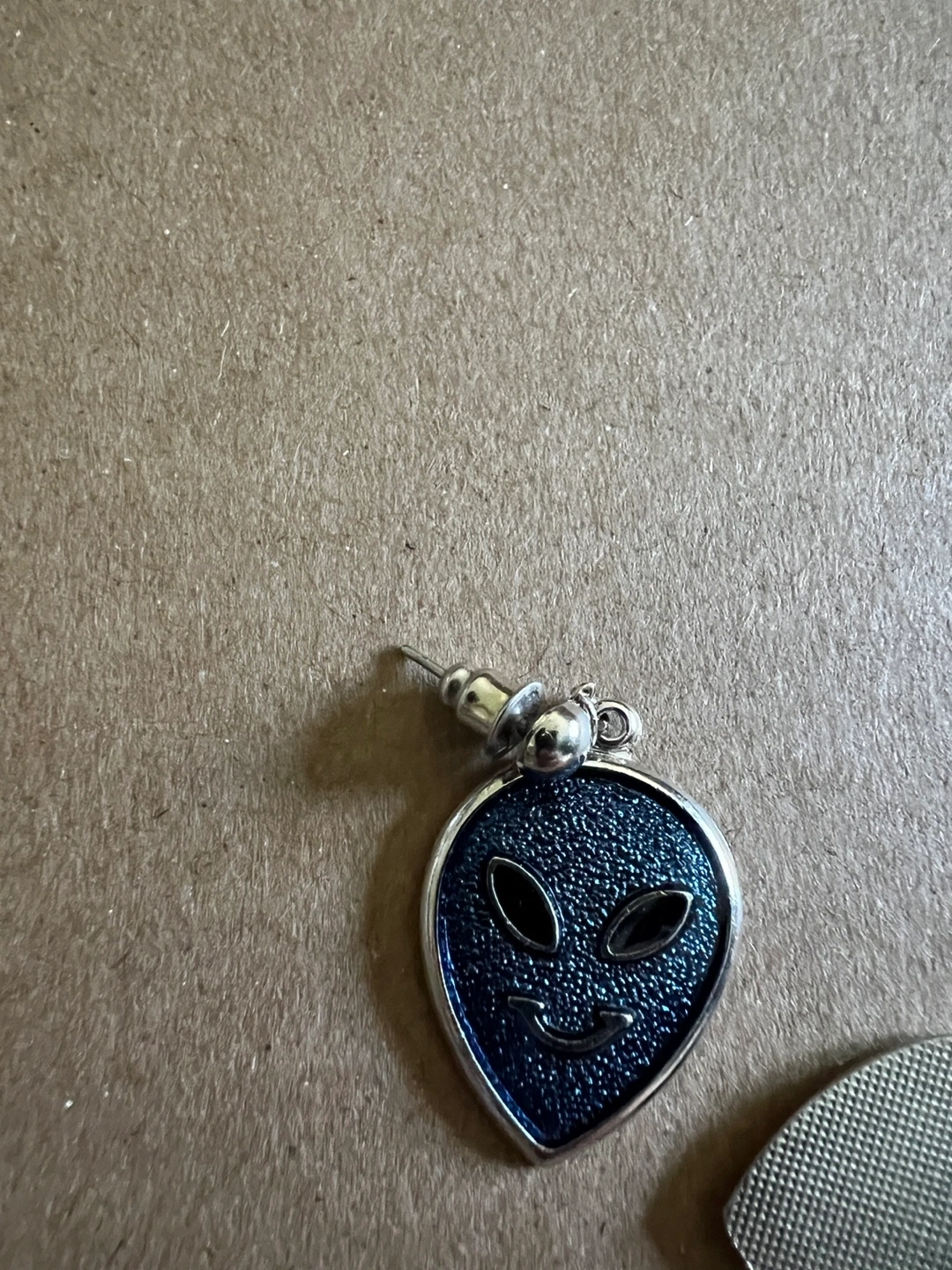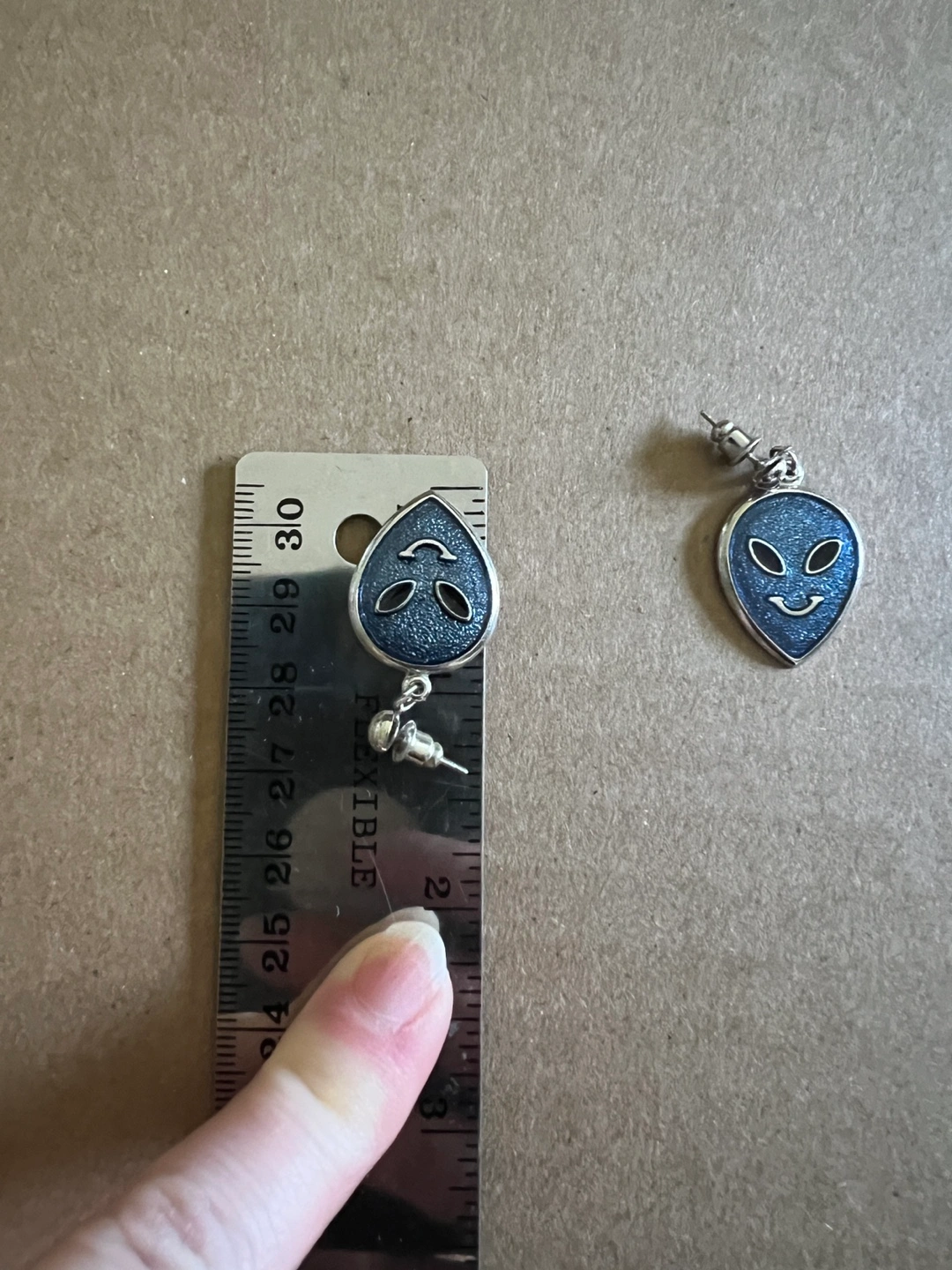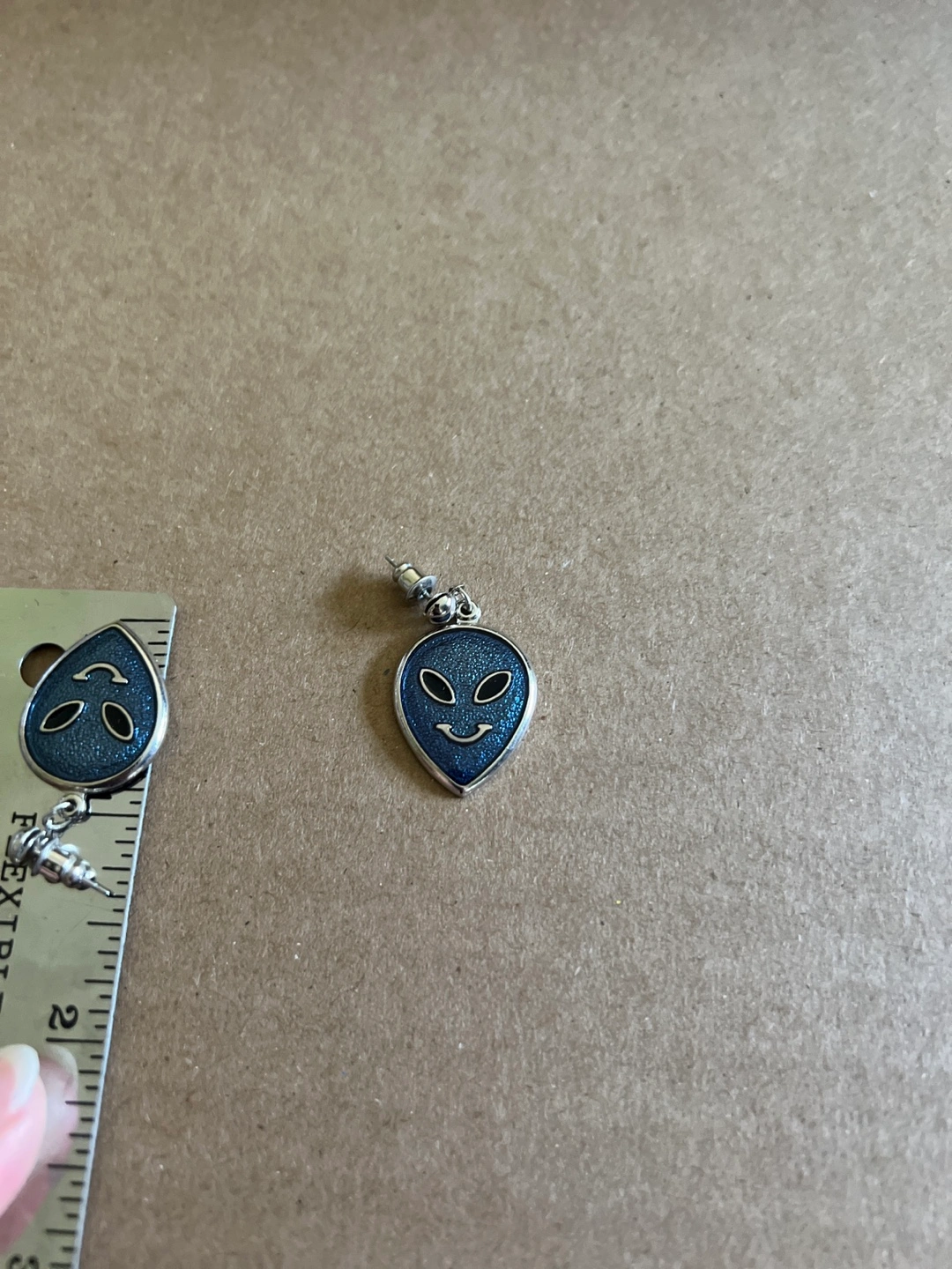 Pair of silver tone alien face dangle earrings. Dark blue alien faces with sparkly texture. Post backings. Lightweight and fun. 3/4” long Smoke free home Pick up near Glenanna Road and Hwy 2