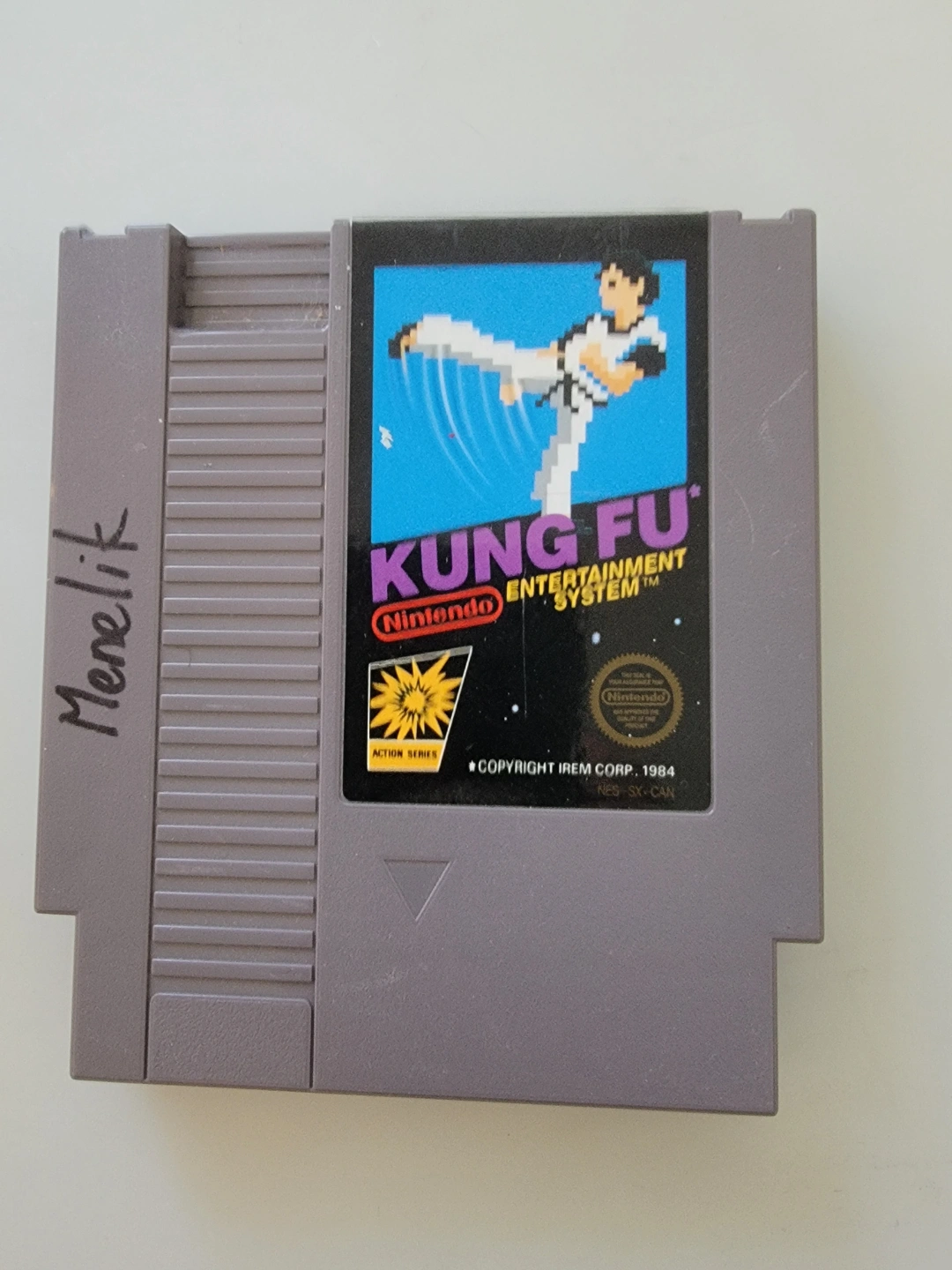 Vintage Nintendo Entertainment System game cartridge. Kung Fu action game. Shows some wear.