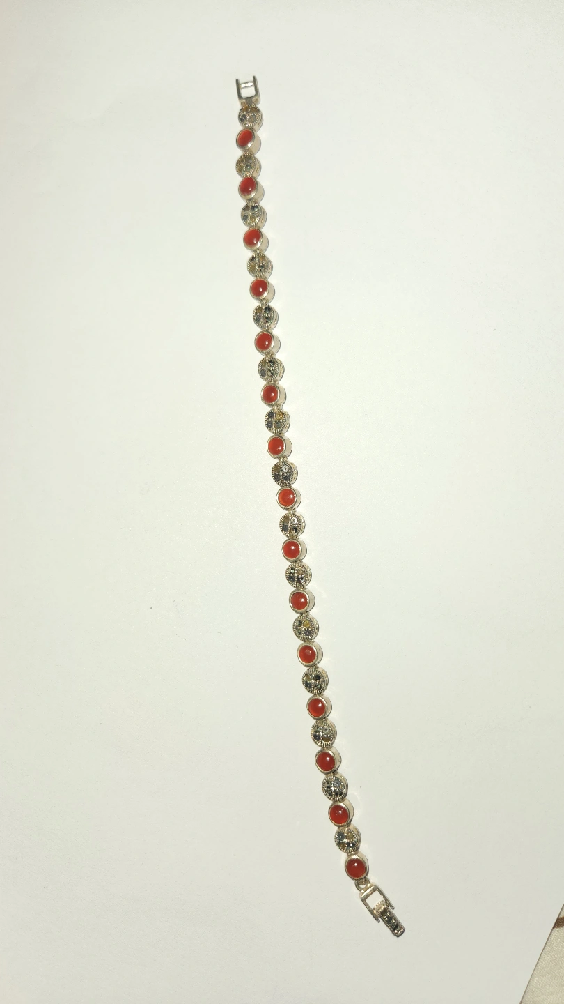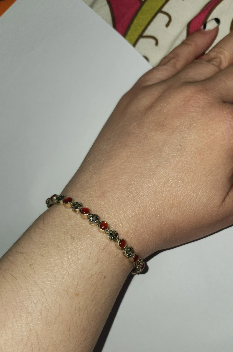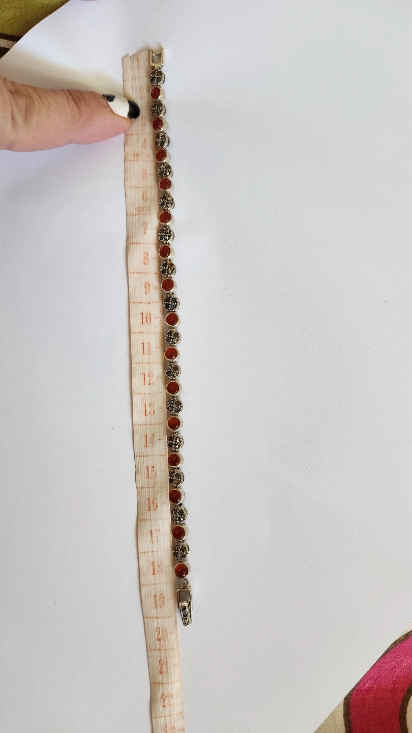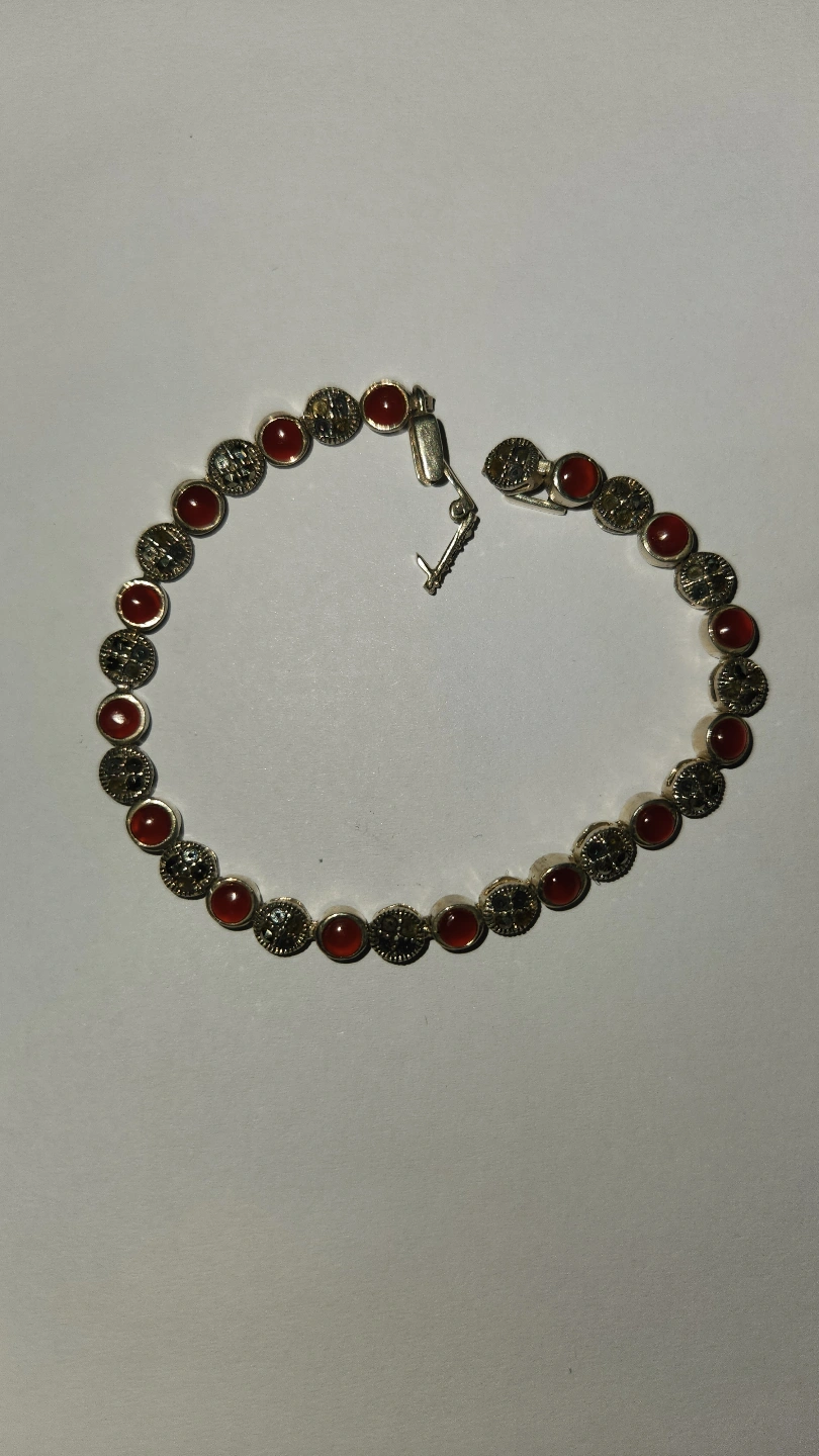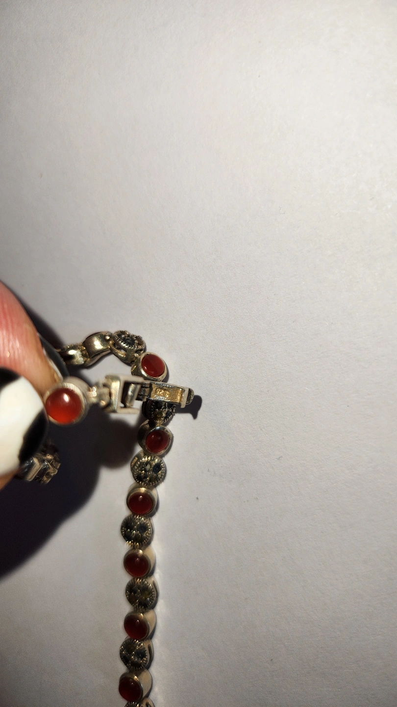 Beautiful Sterling Silver (925) bracelet from Istanbul, Turkey, featuring rich red carnelian and sparkling marcasite. Approximately 7 inches with clasp closure. A touch of Turkish elegance.