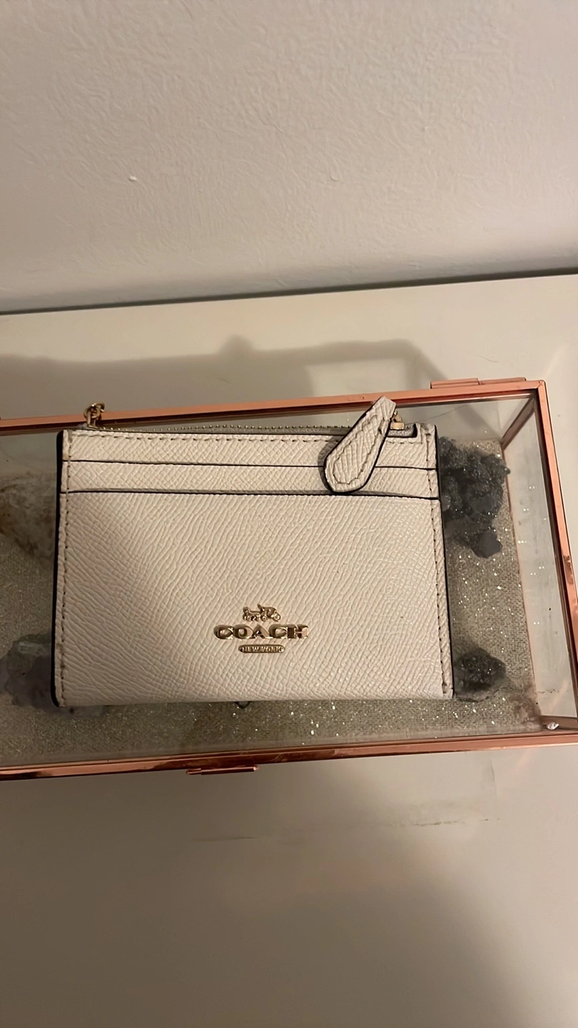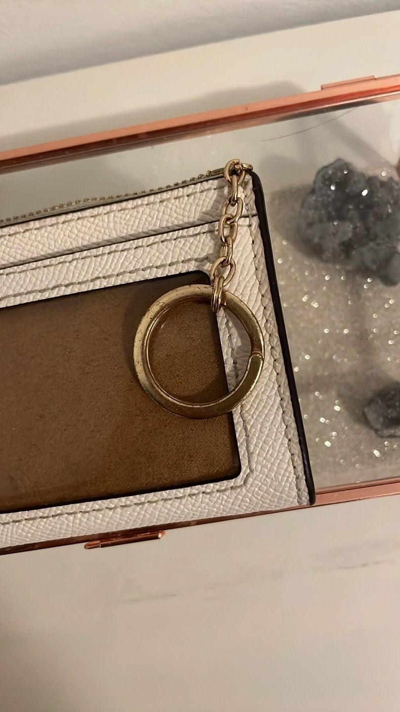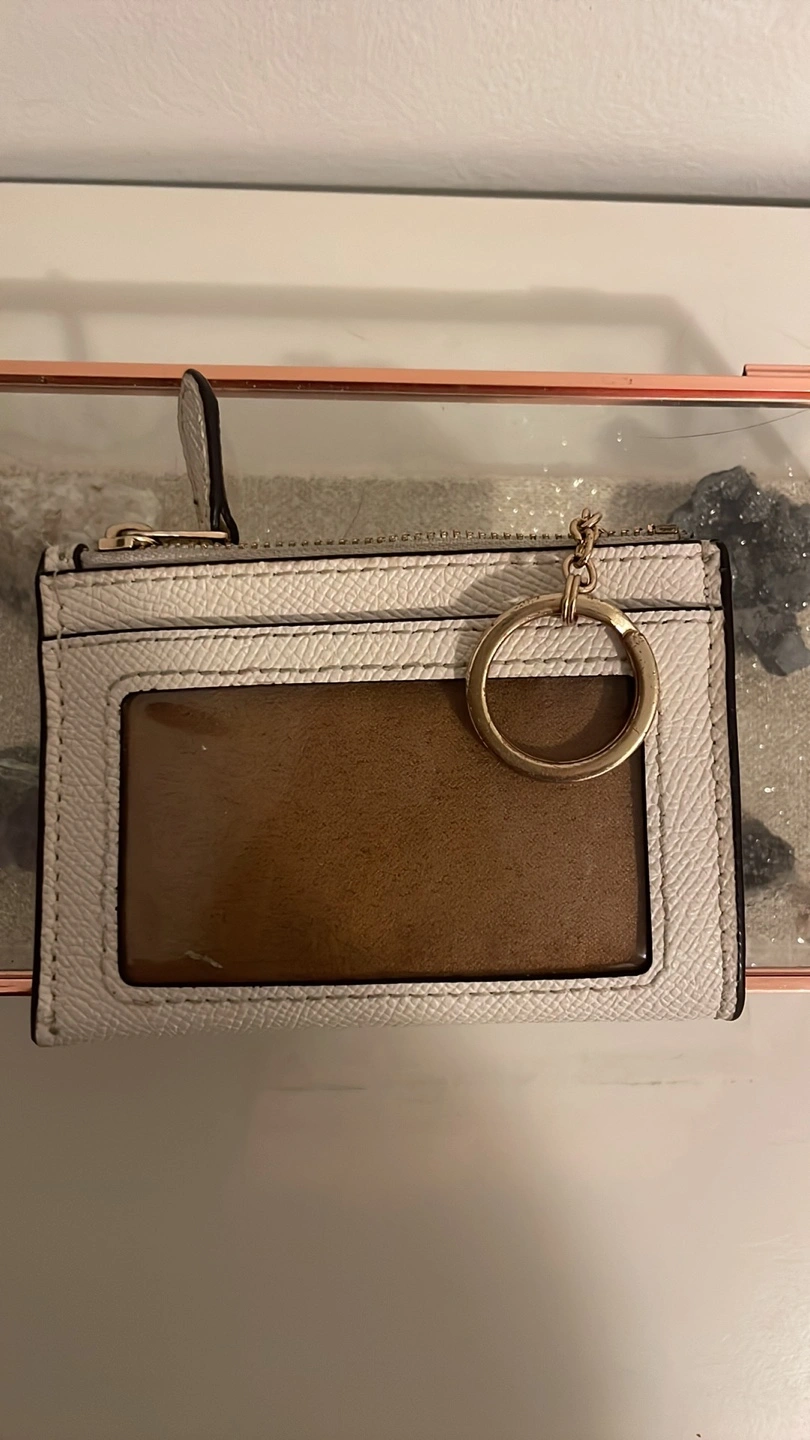 Compact card holder, zipper closure. Features a clear ID window and a gold-toned keychain. Off-white leatherette.
