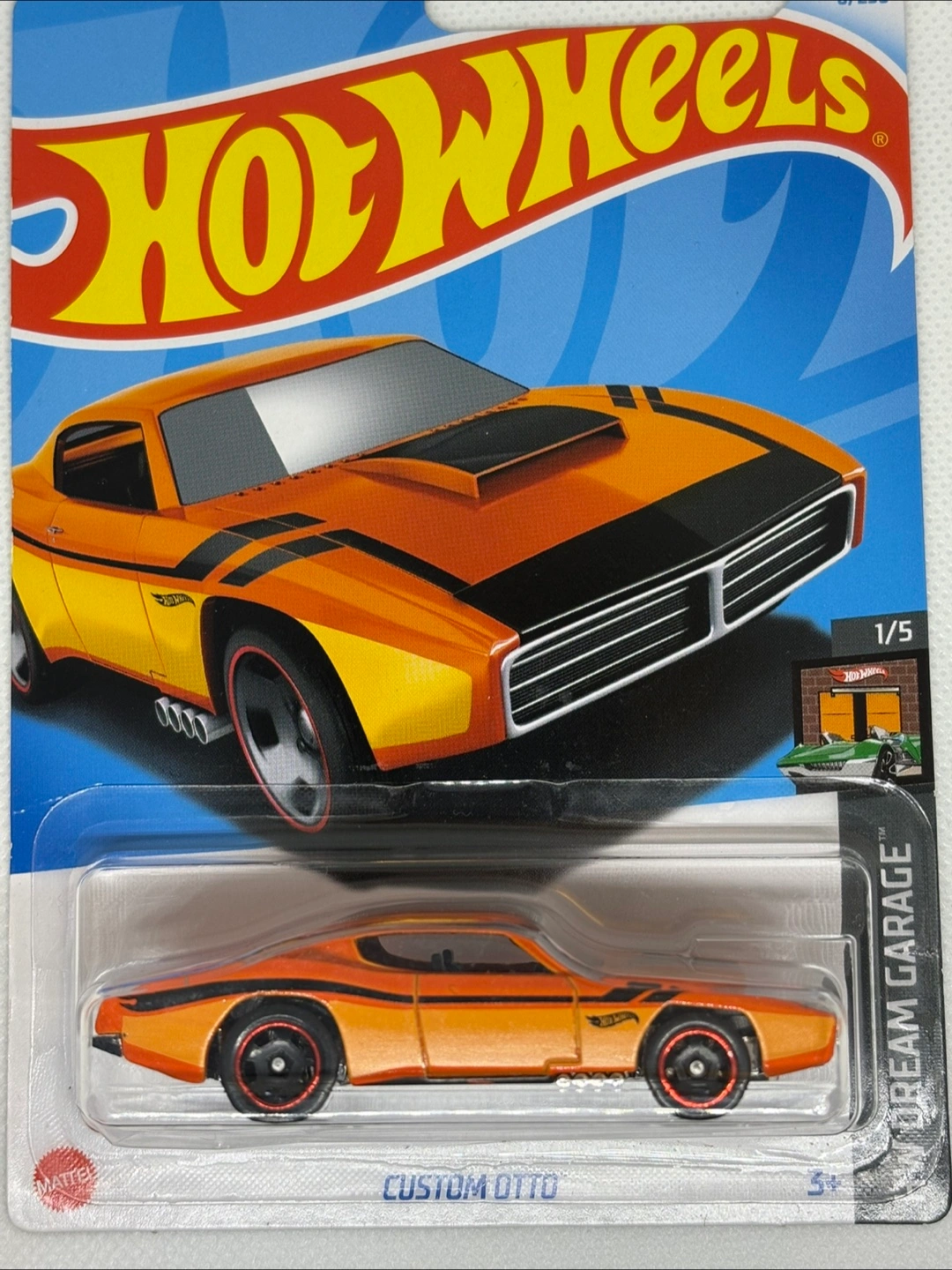 Orange Hot Wheels car. Part of the Dream Garage series. Collectible die-cast model. In package.