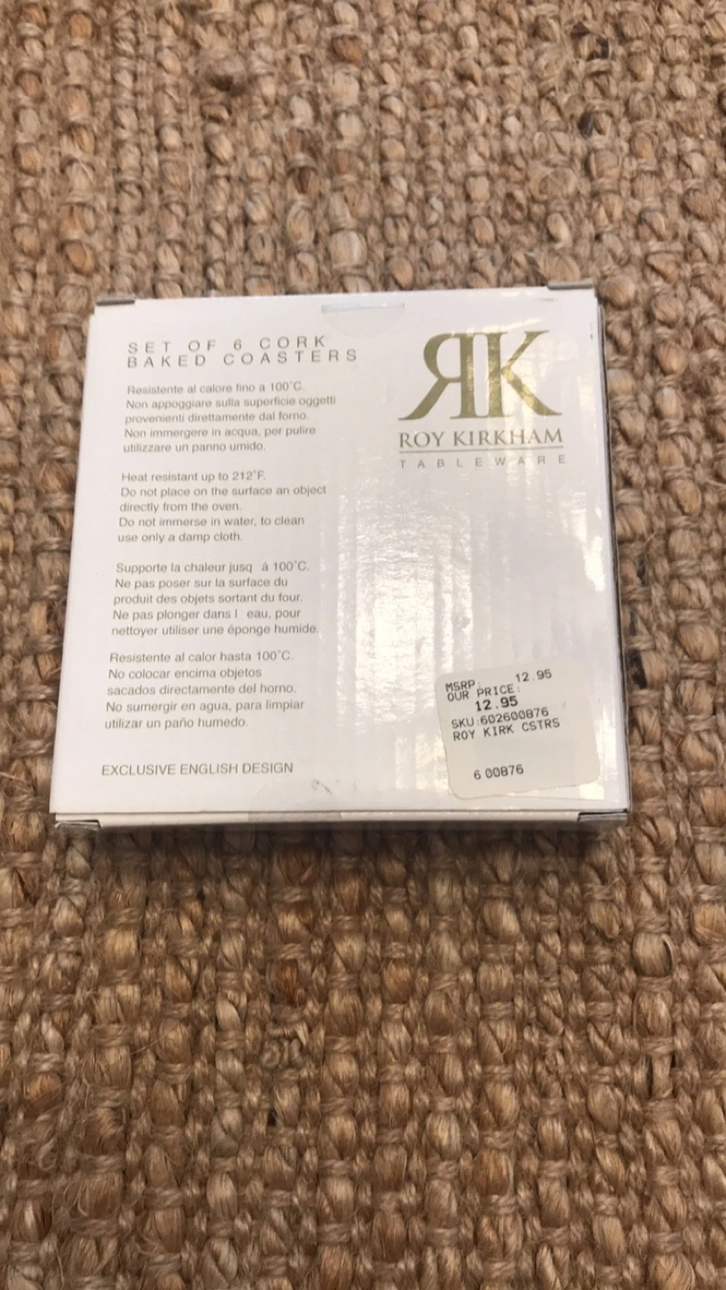 Set of six square coasters. Features a strawberry design. Exclusive English design. Baked cork coasters. New in box.