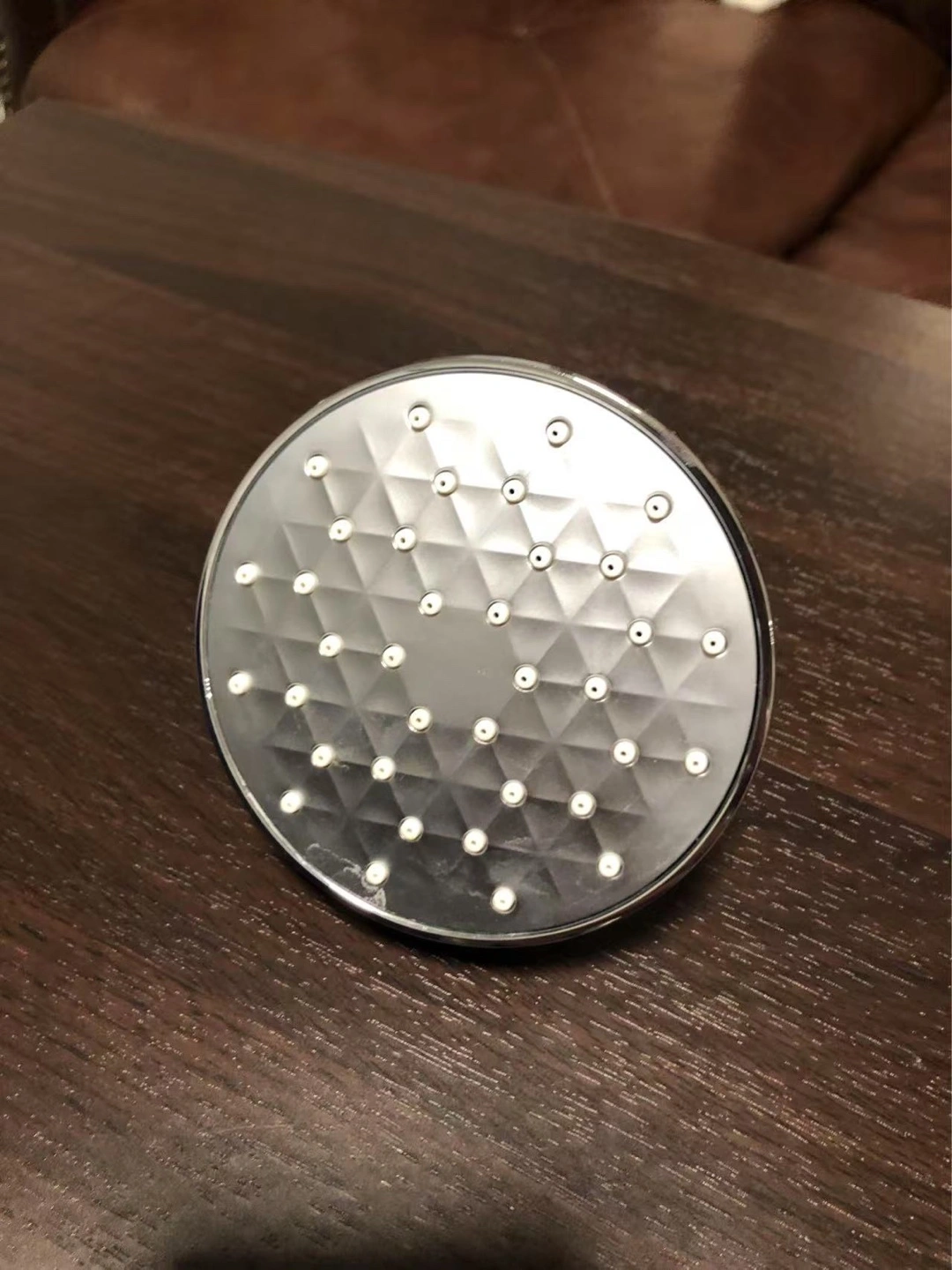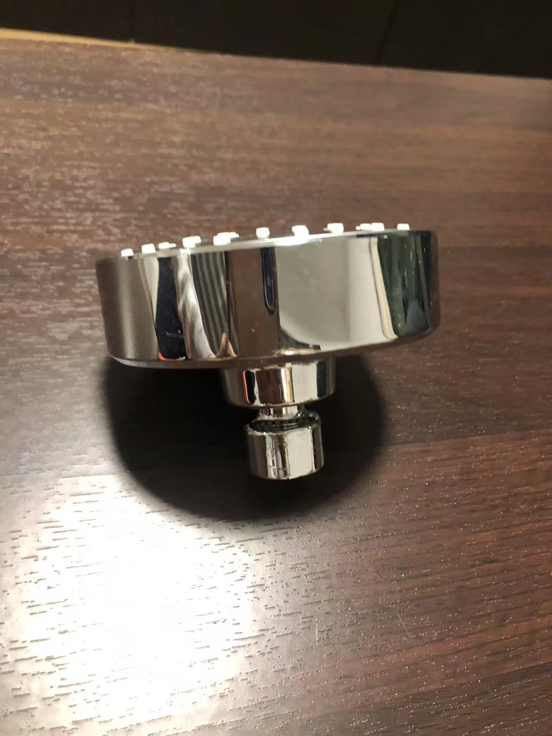Round shower head, chrome finish. Multiple spray settings. Standard size fitting.
