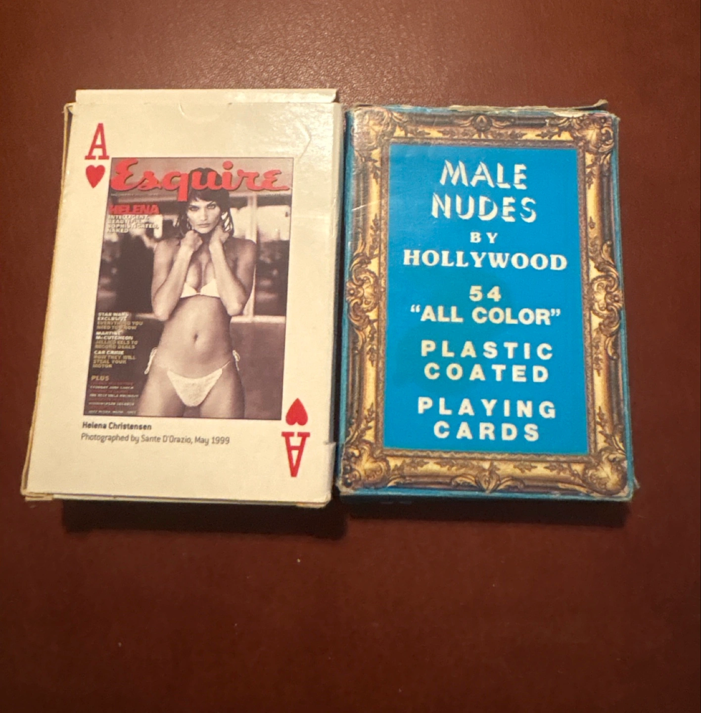 Collectible playing cards. One deck features an Esquire magazine cover featuring Helena Christensen. The other deck showcases male nudes by Hollywood. Plastic coated cards 1970’s Pet and smoke free home Available by appt for pick up keele and Bloor just south 1 set of lights on Parkside