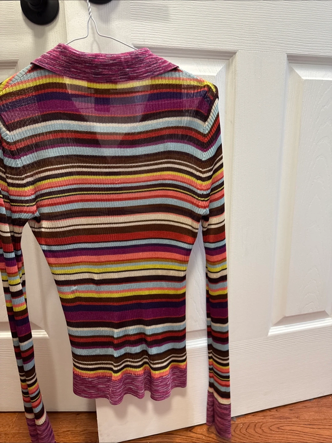 Multicoloured striped long-sleeved knit polo shirt. Features a collared neckline and button placket. Size small.