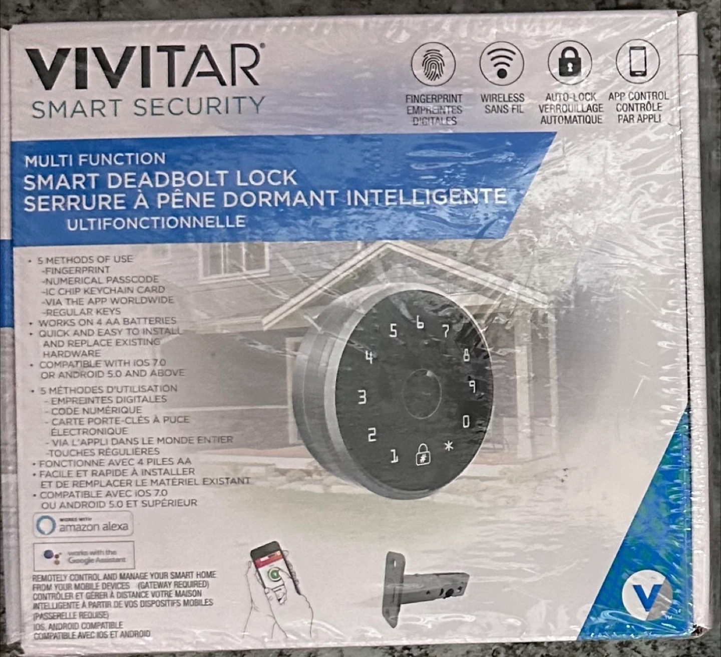 New Vivitar smart deadbolt lock. Multi-function smart security. Features fingerprint, numerical passcode, and key access. Works on 4 AA batteries. Quick and easy to install. Compatible with iOS and Android. Remotely control and manage your home.