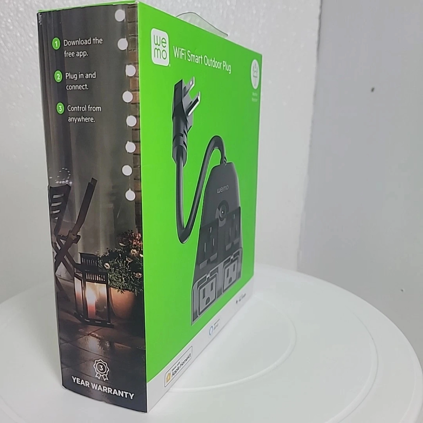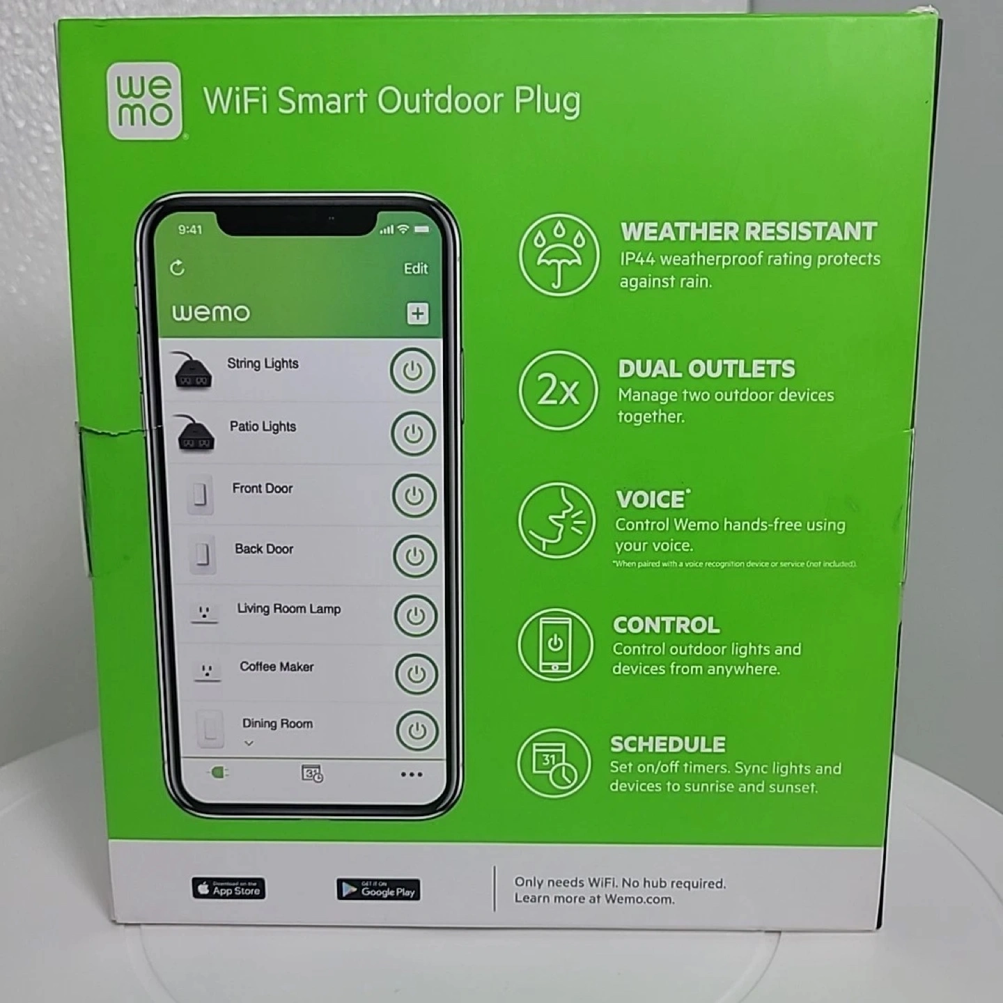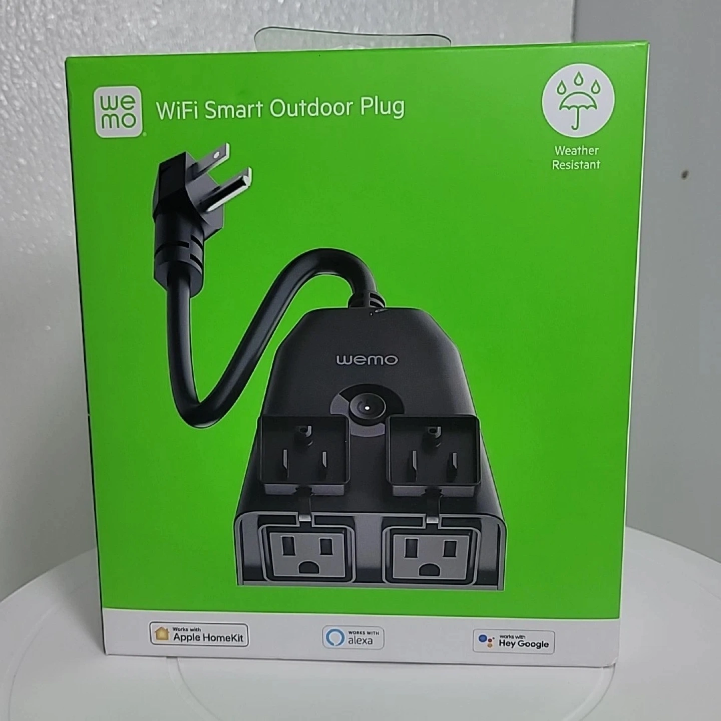 Weather resistant smart plug. Two outlets. Control from anywhere using the app. Works with Apple HomeKit, Alexa, and Google Assistant. 3-year warranty.