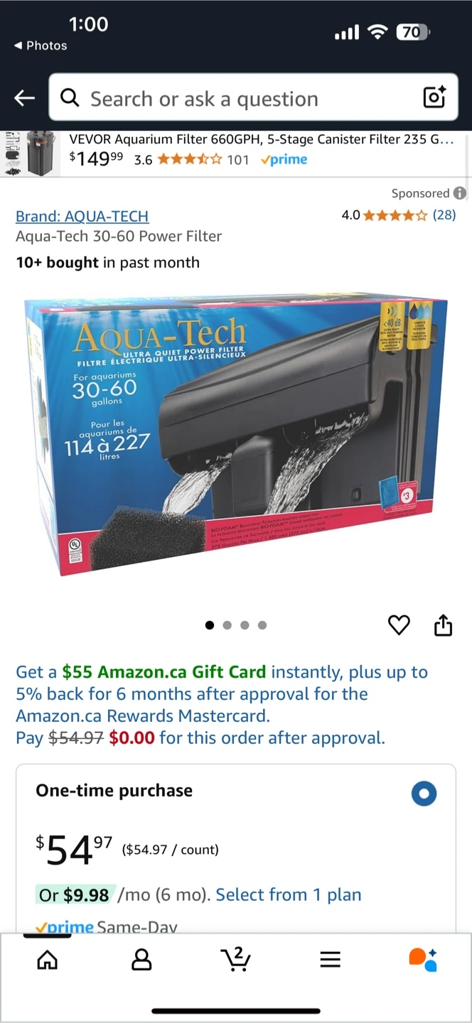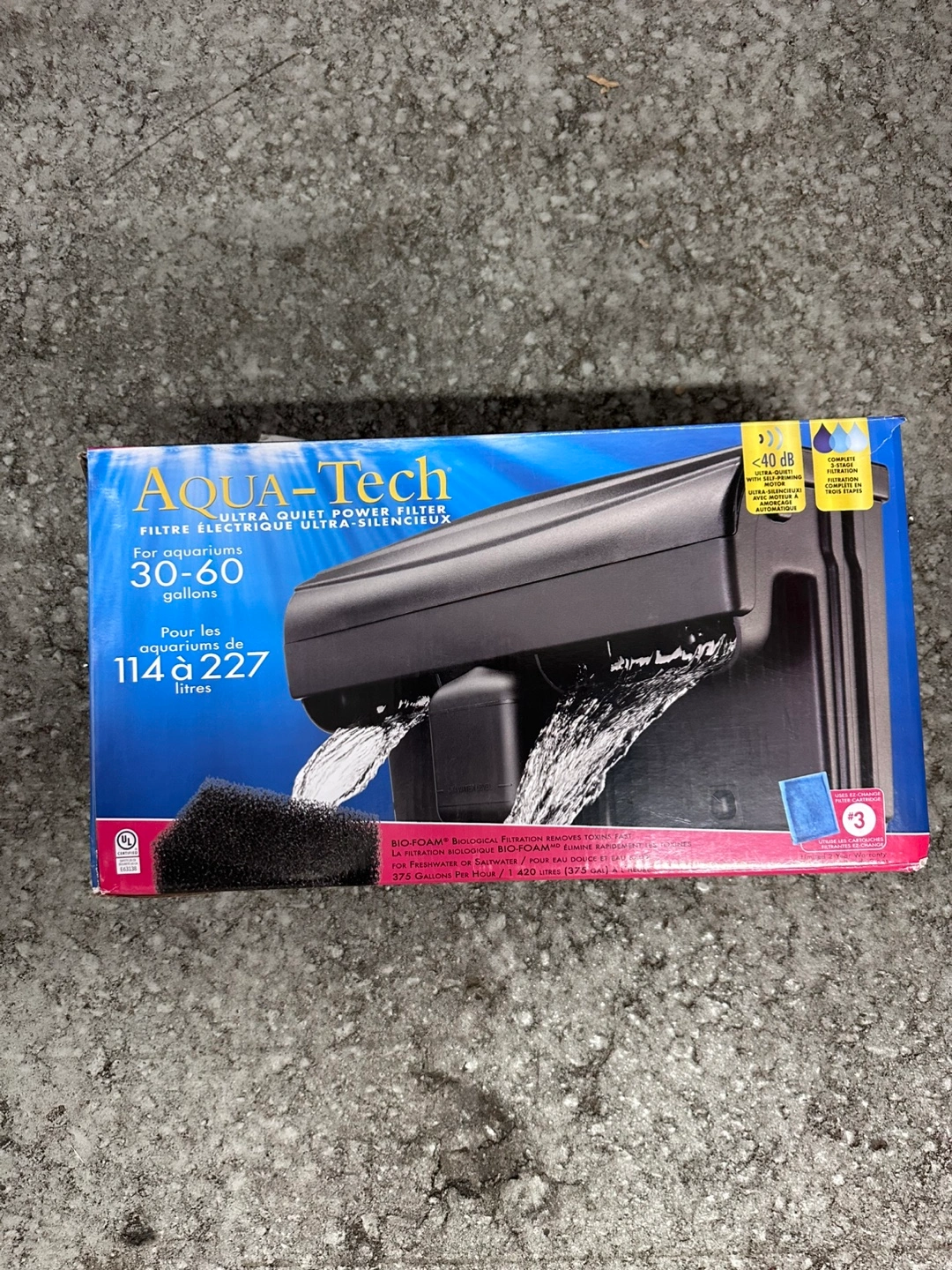 Used I great condition in box Aqua-Tech 3060 power filter. Quiet operation. Suitable for aquariums 30-60 gallons (114-227 litres). Includes filter media.