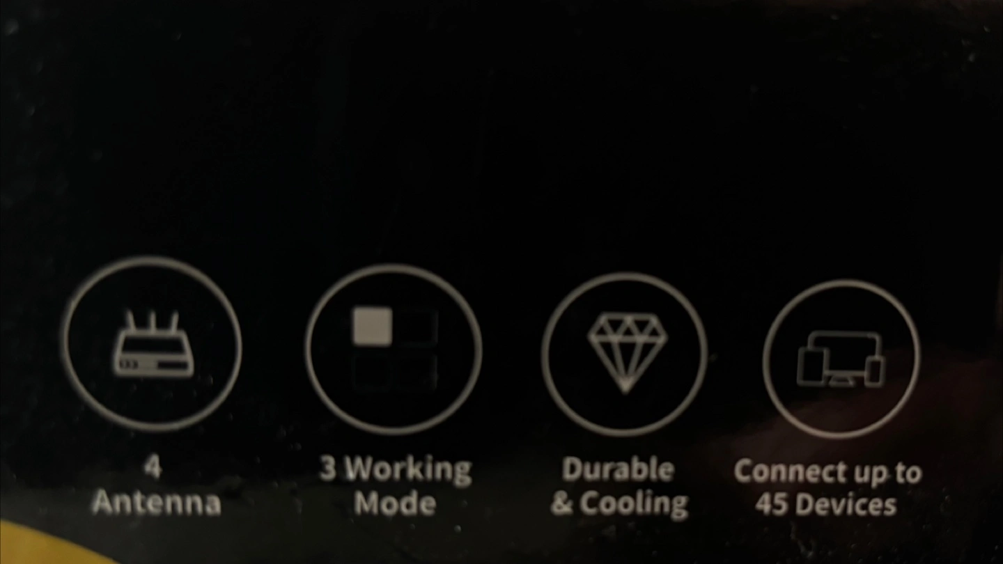 Extends your WiFi signal. Dual band. Four antennas. Three working modes. Connects up to 45 devices. Durable and has good cooling.