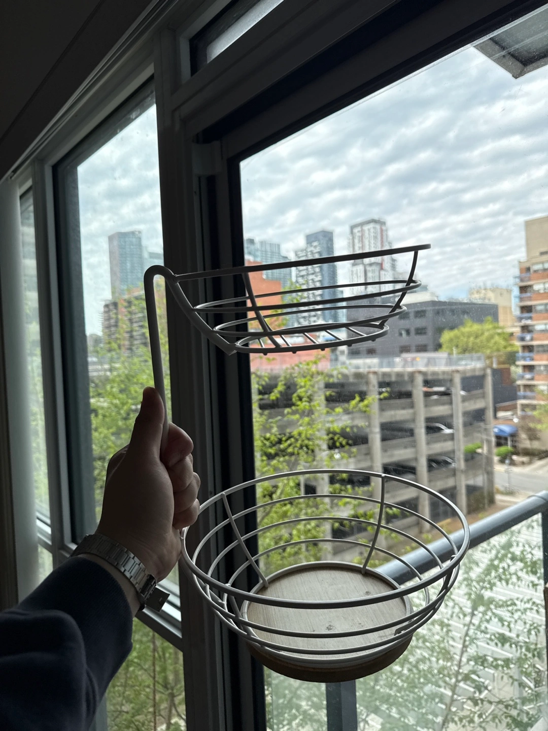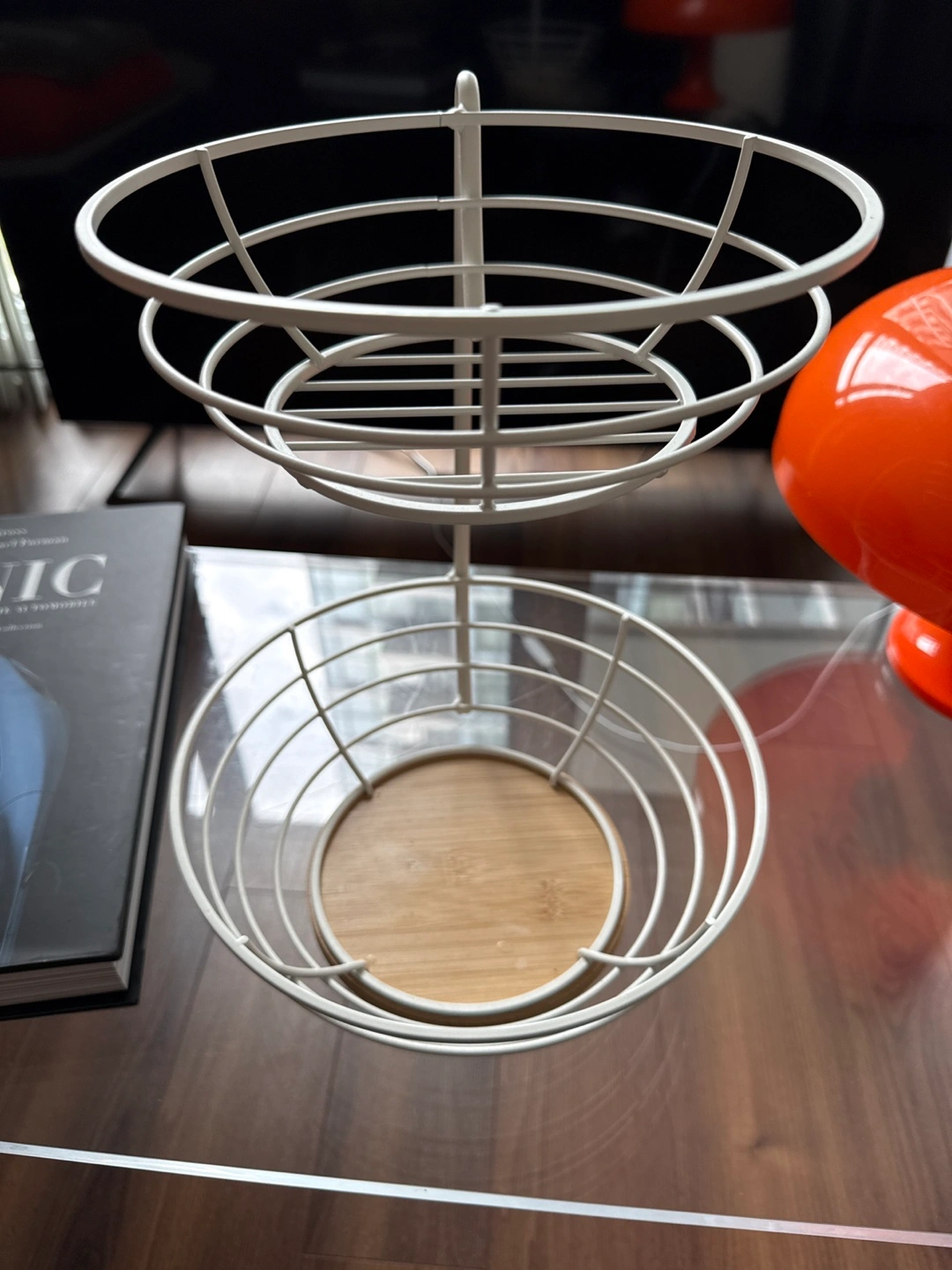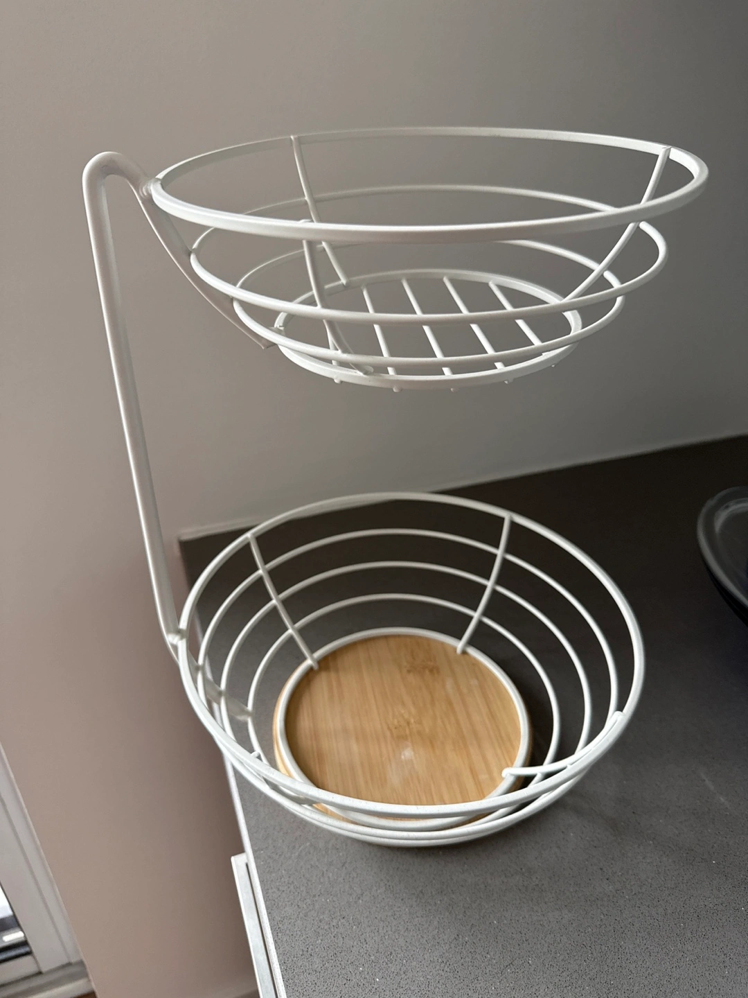 Stylish two-tiered fruit basket. White wire construction. Features a lower bowl with a bamboo base. Perfect for kitchen counter organization.
