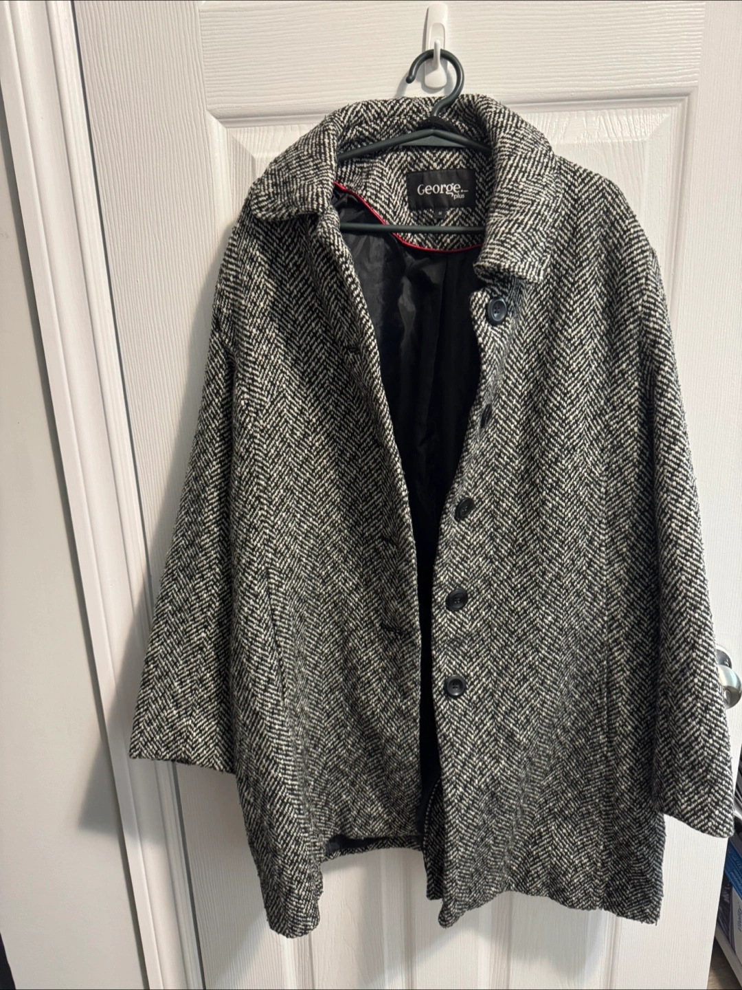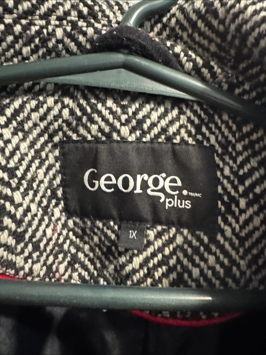 Women's black and white herringbone coat. Size 1X. Classic style, button closure. Great for fall or winter.