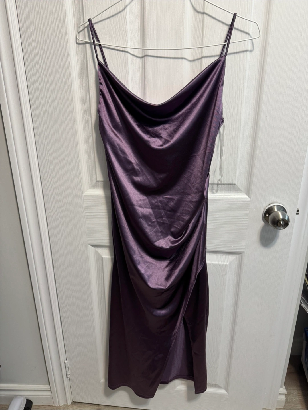 Gorgeous purple satin midi dress. Cowl neck, thin straps, and a thigh-high slit. Perfect for a special occasion. Used only once