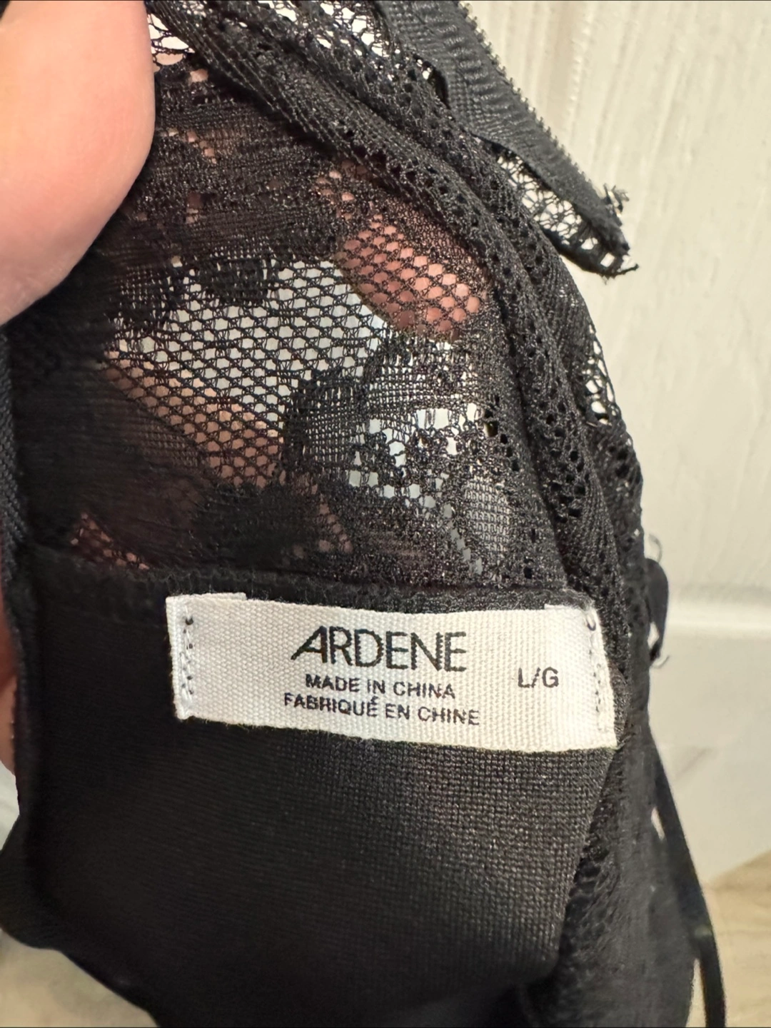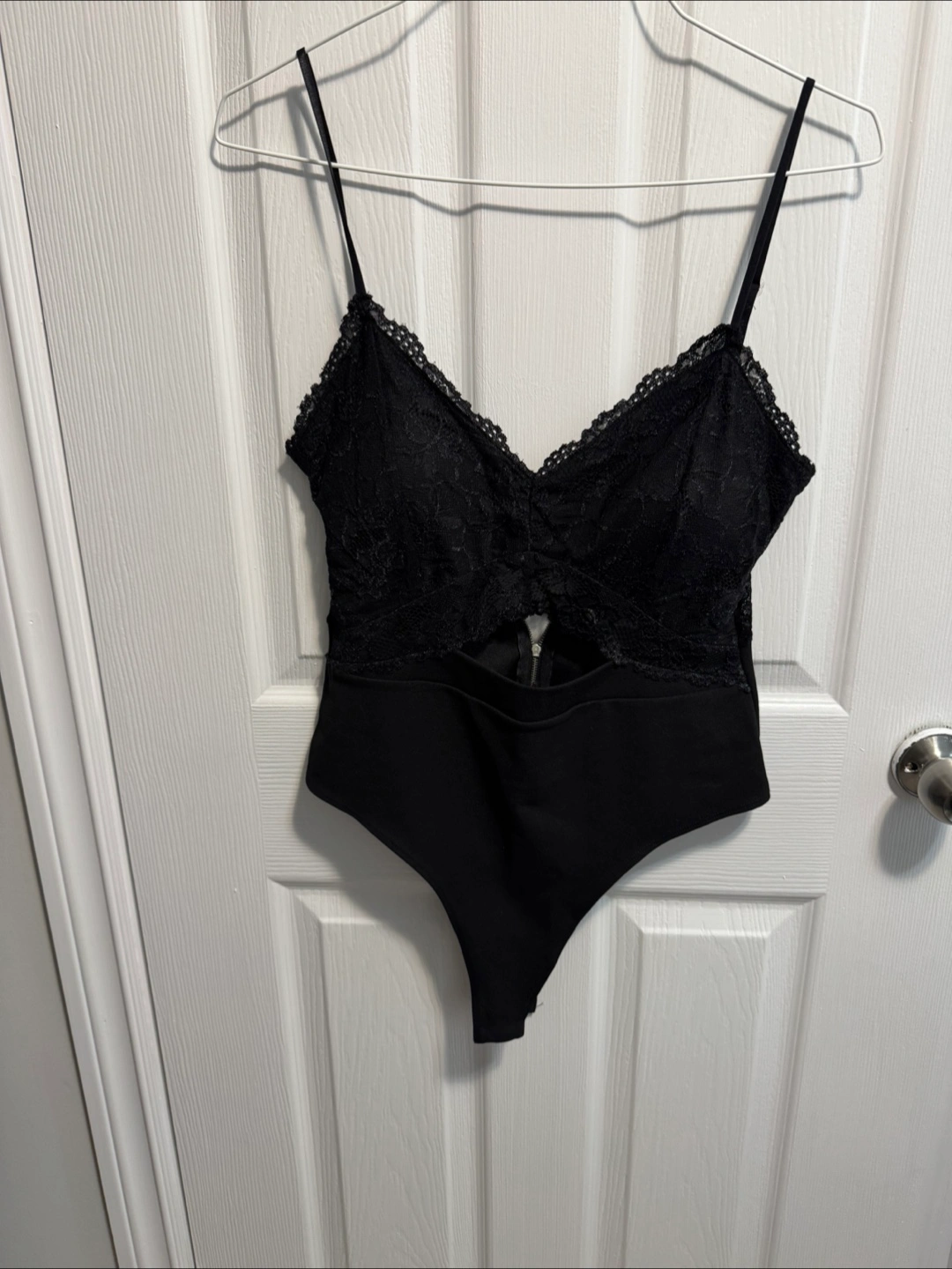 Black lace bodysuit. Features a keyhole cutout and spaghetti straps. Size large/grande.