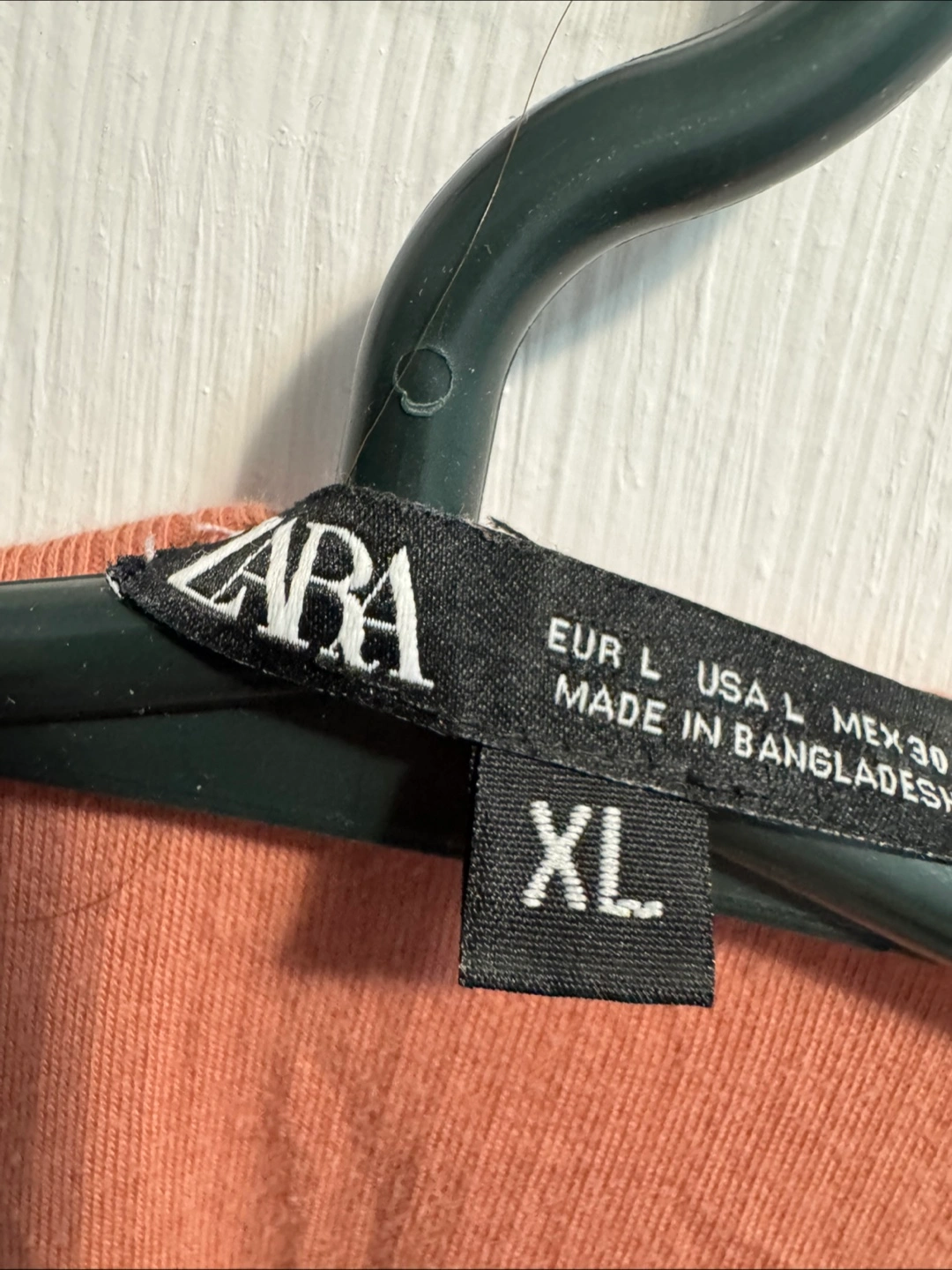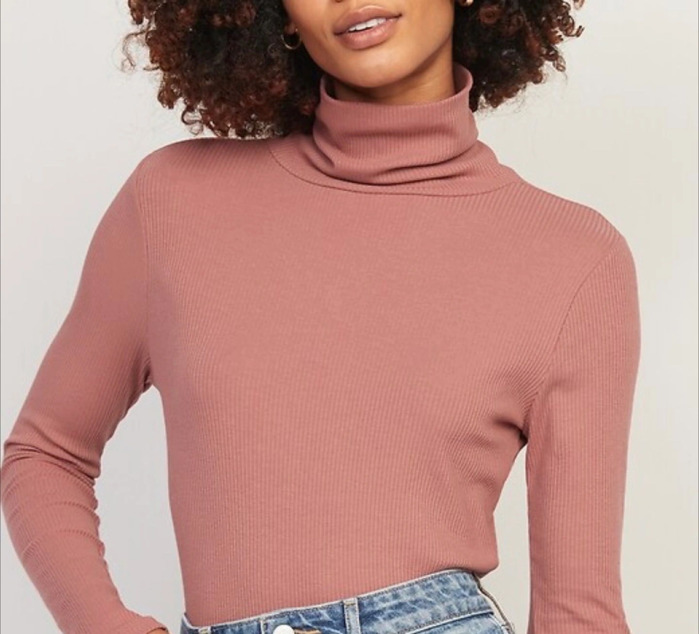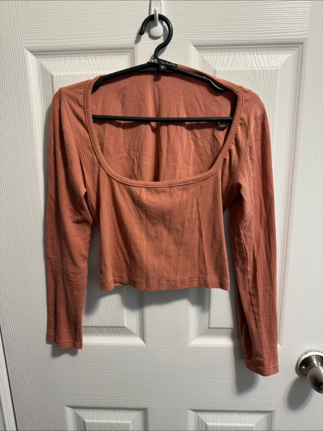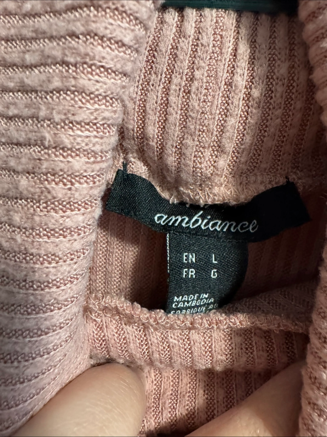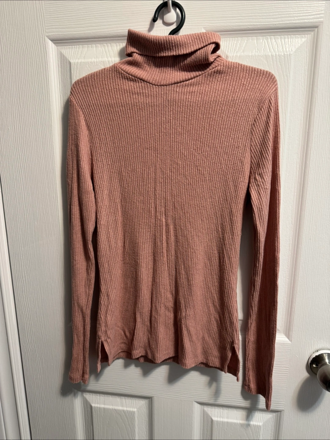 Dusty rose coloured long sleeve top. Features ribbed fabric. Offered in size large. Close-fitting and cropped. 2 for 5$
