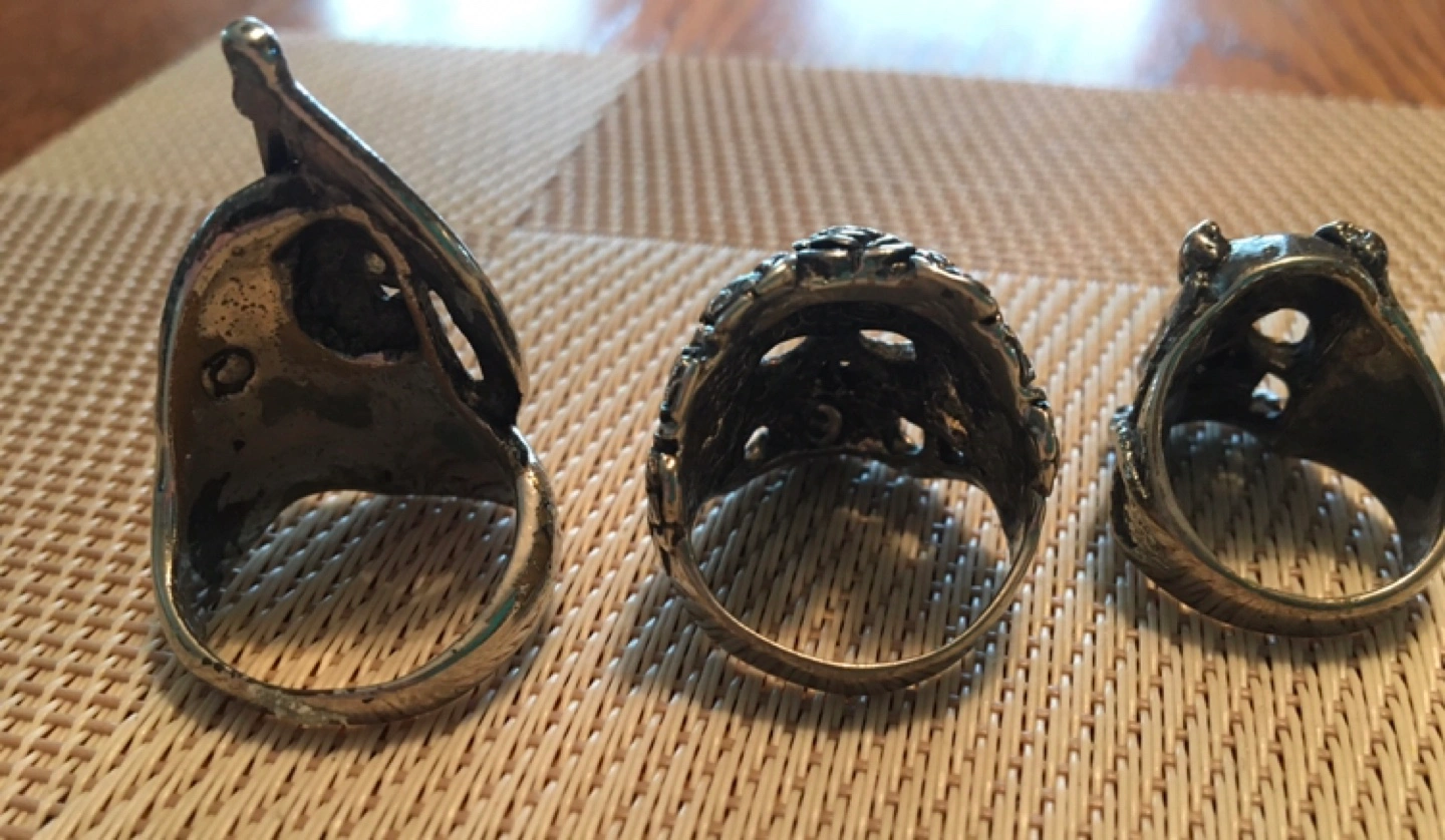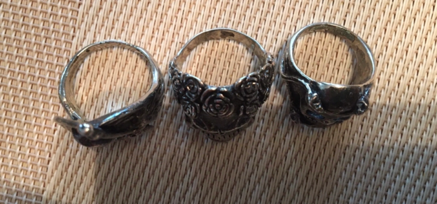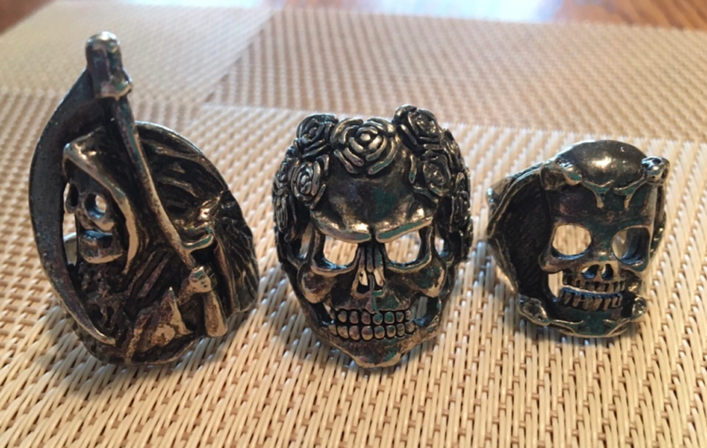I'm selling a set of three vintage biker skull rings, each with a unique design, perfect for adding an edgy touch to your style. These rings feature detailed skull motifs, including a Grim Reaper, a skull surrounded by roses, and another skull with distinct facial features. If the ad is up, the rings are available. Don't be haunted by the thought of missing out!