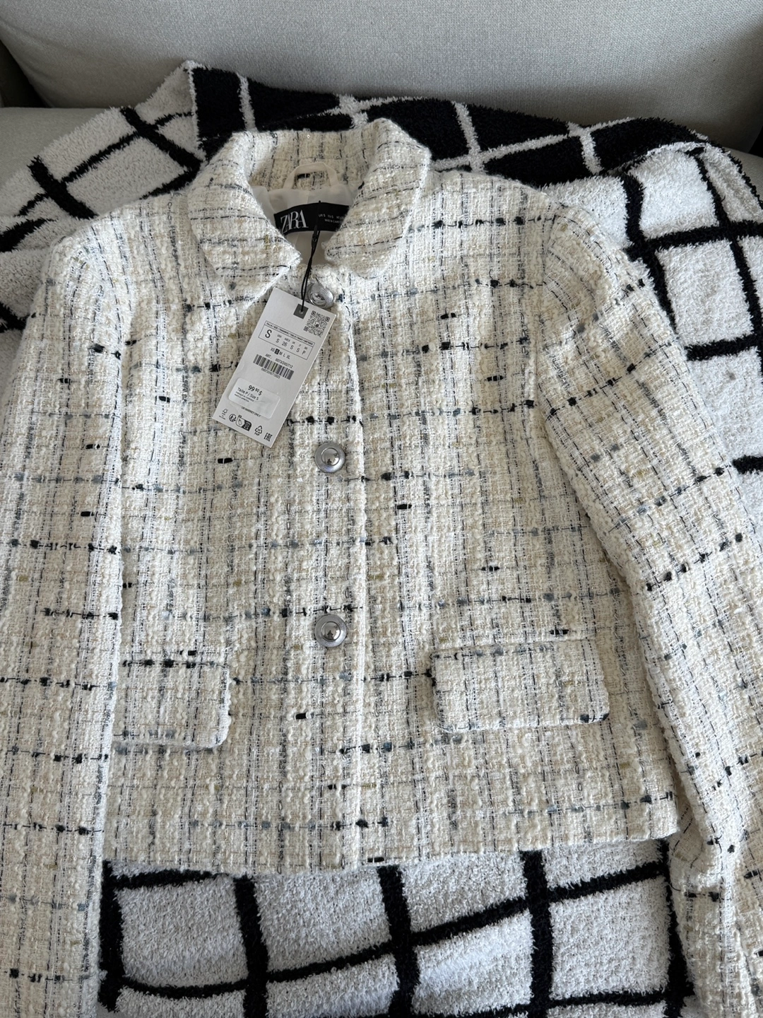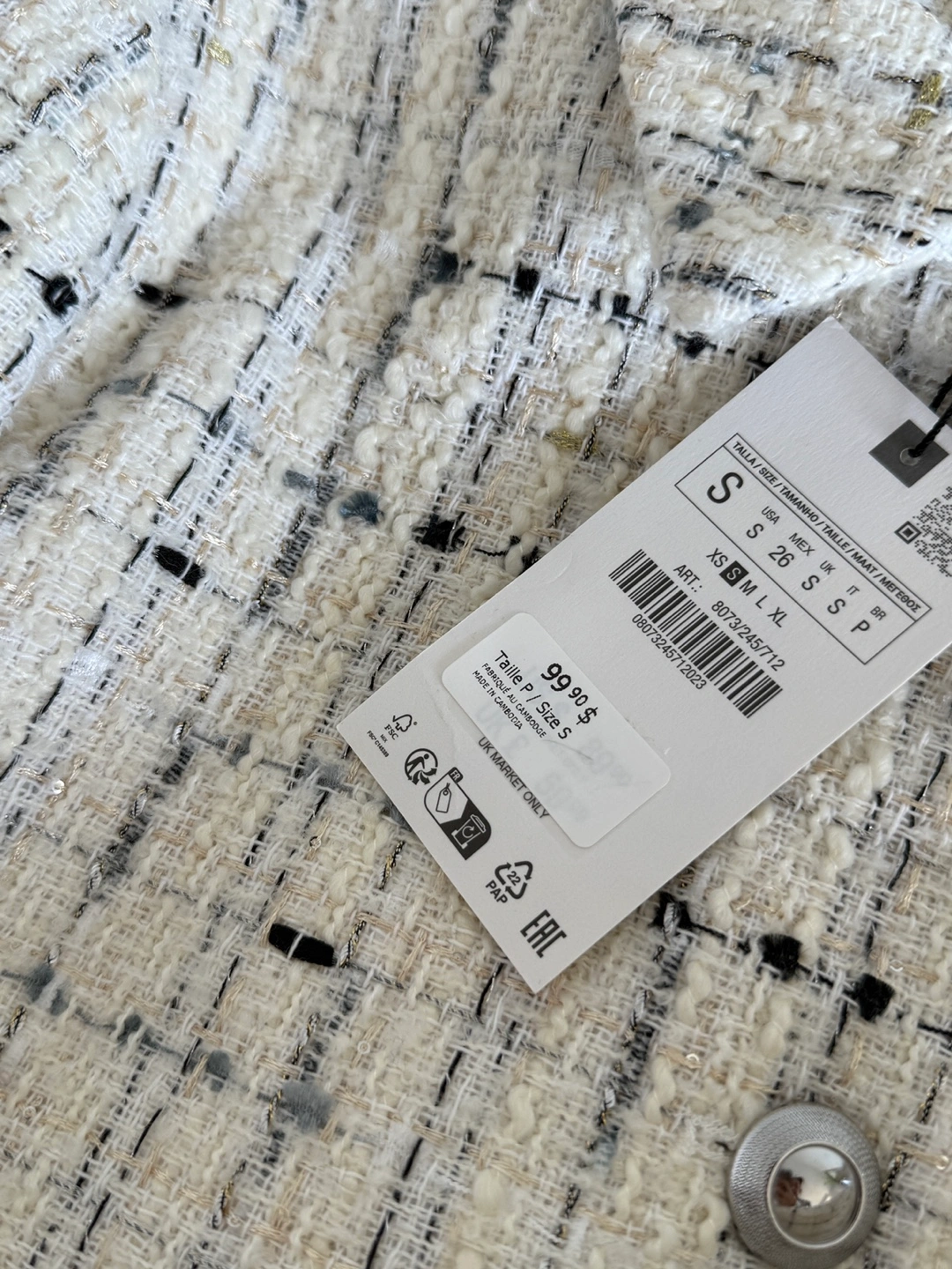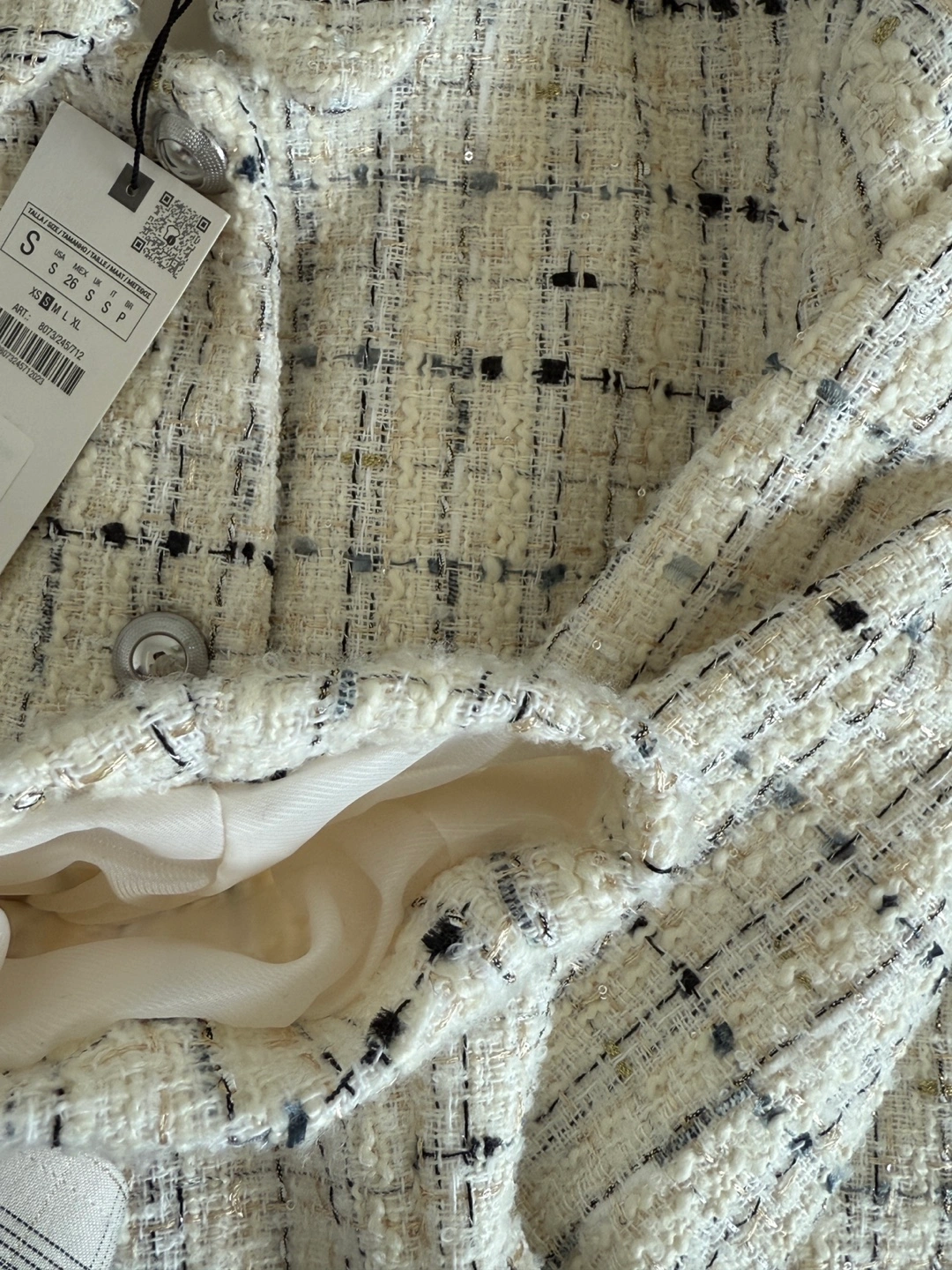 Cream coloured tweed jacket. Small size. Features a collared neckline and button closure. Flap pockets. DT pickup