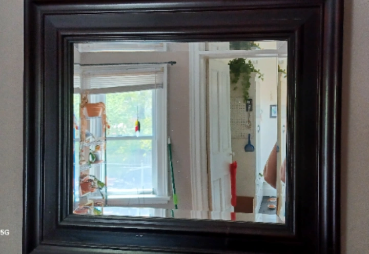 Large rectangular mirror. Dark brown wooden frame. Great for a bedroom or hallway.