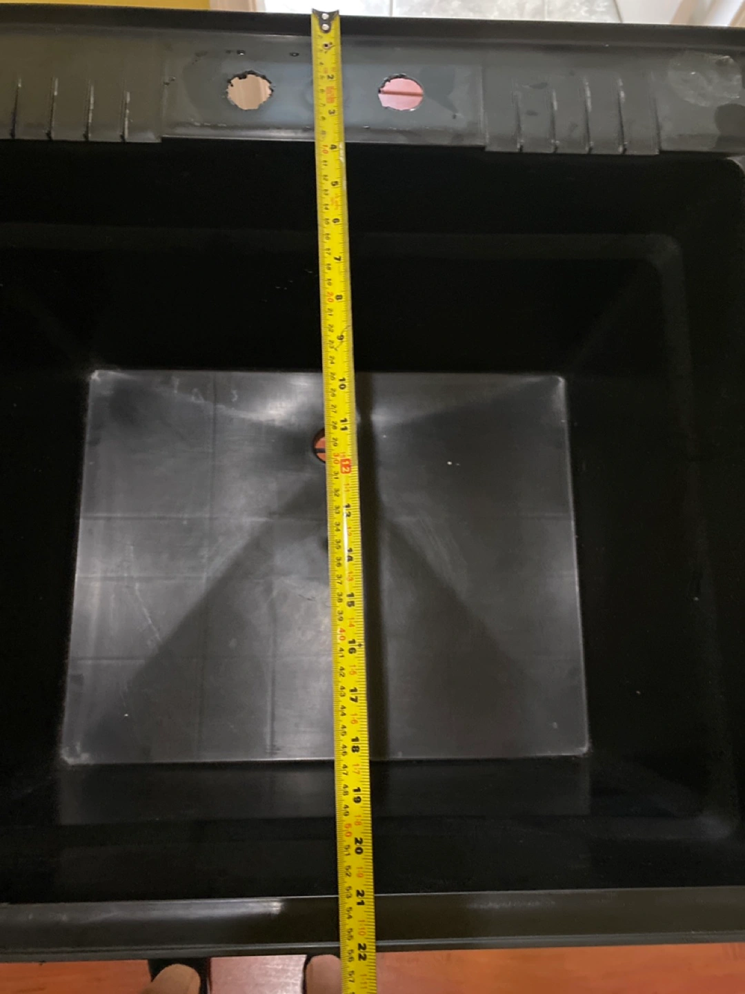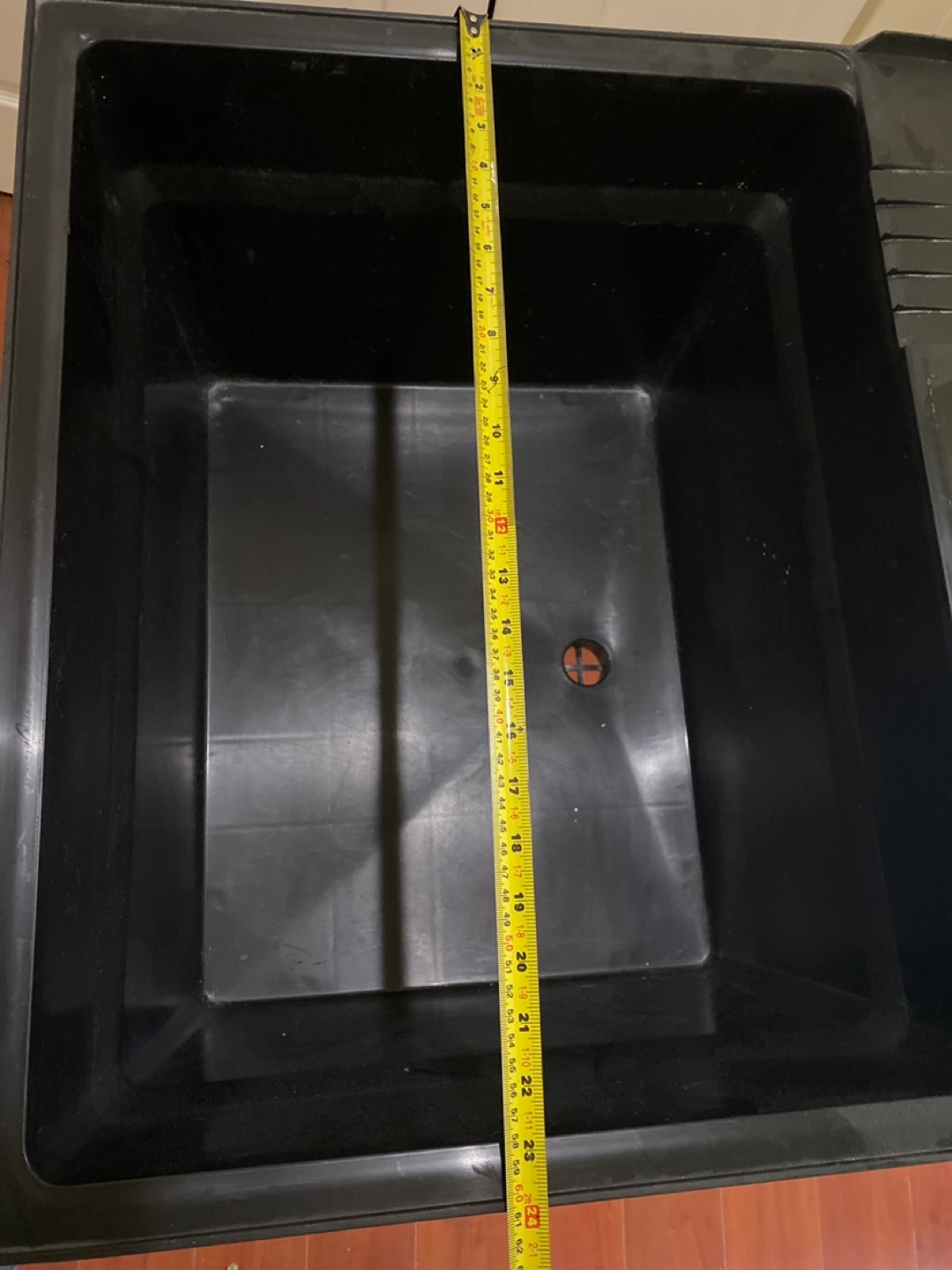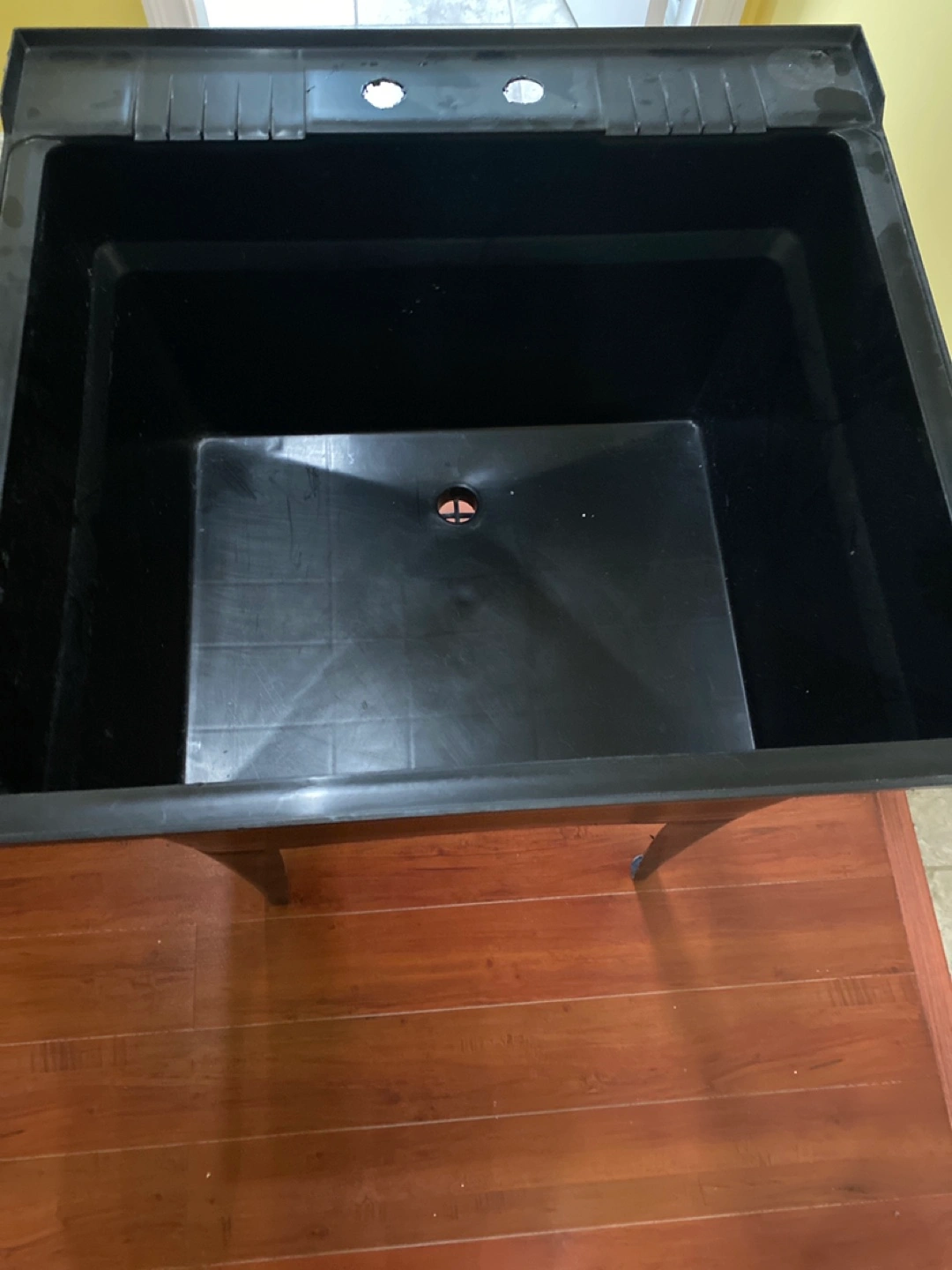 Large black plastic utility sink. Features a stand and drain. Approximately 24 inches deep. Great for laundry or other uses.
