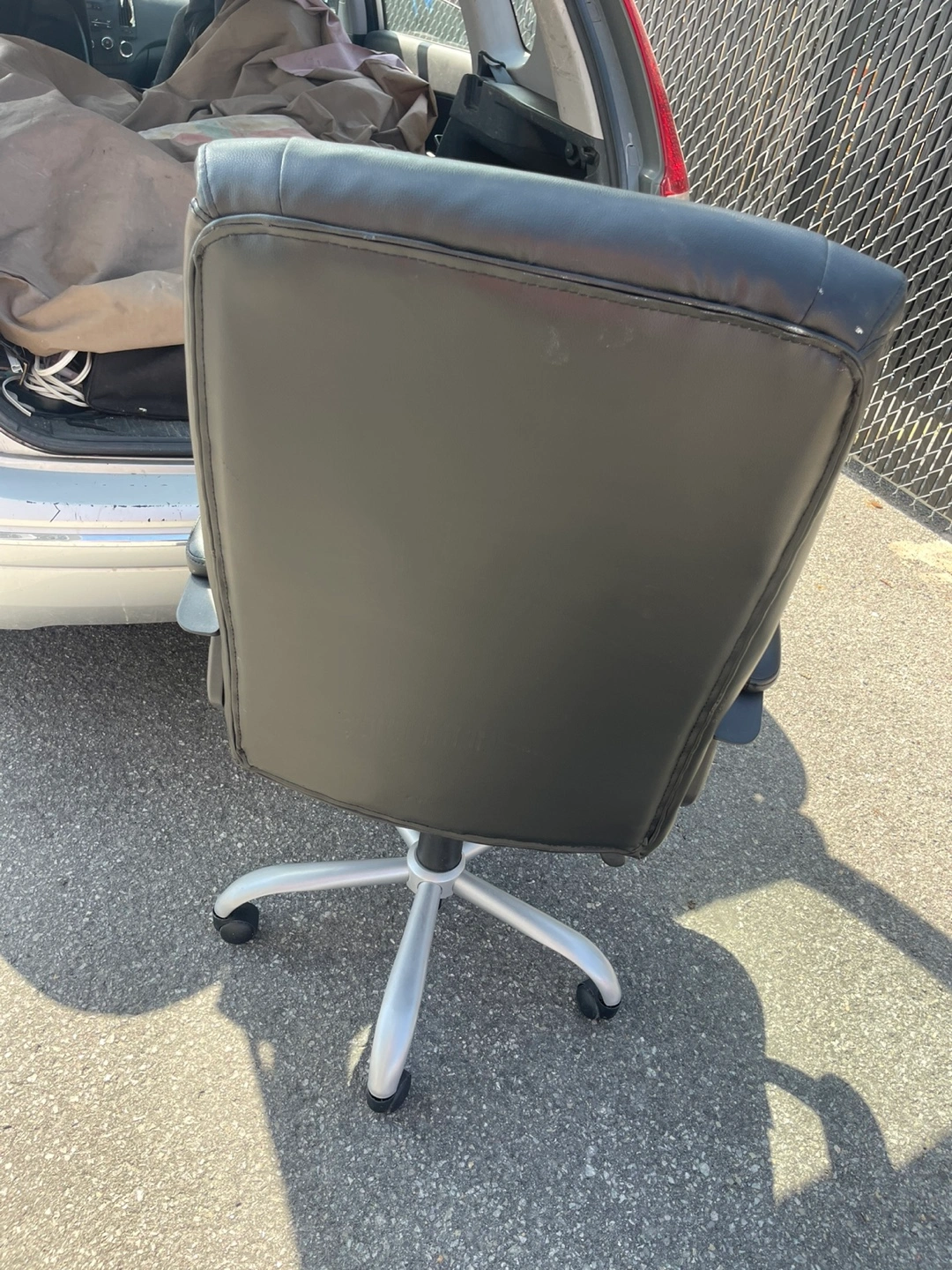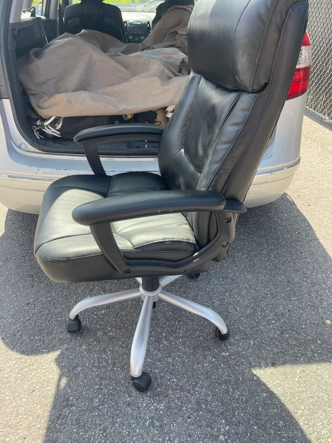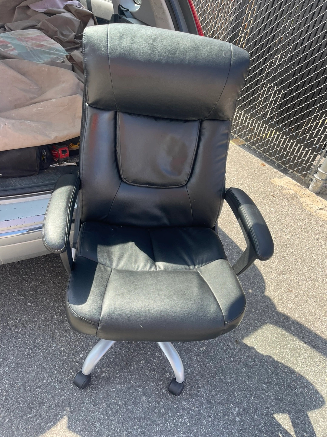 Comfortable office chair, black leather, adjustable. Silver base, five wheels. Used, good condition.