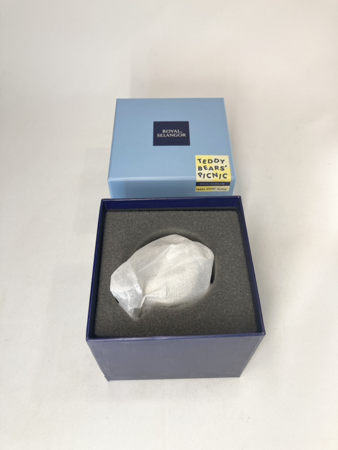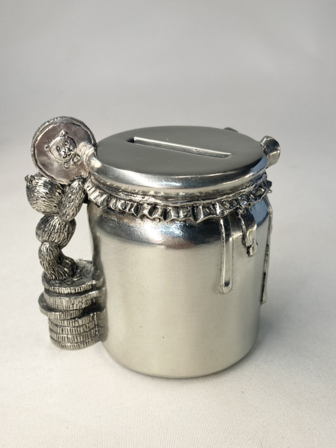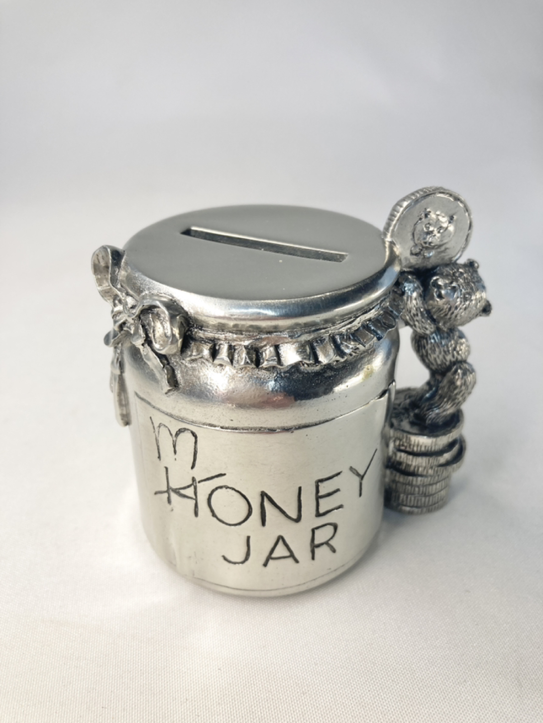 New in box. Perfect for a first birthday, baby shower, or just as a gift! Solid pewter coin box in the shape of a honey pot with a cute little bear. Original packaging included. No nicks or scuffs. Currently $160 on Amazon and more other places. Let them think you paid more!