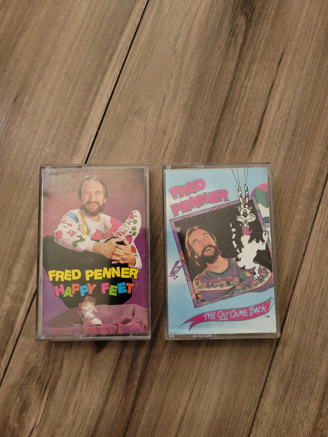 Two vintage Fred Penner cassette tapes. Includes Happy Feet and The Cat Came Back. Great condition for their age. Includes song lyrics booklets.