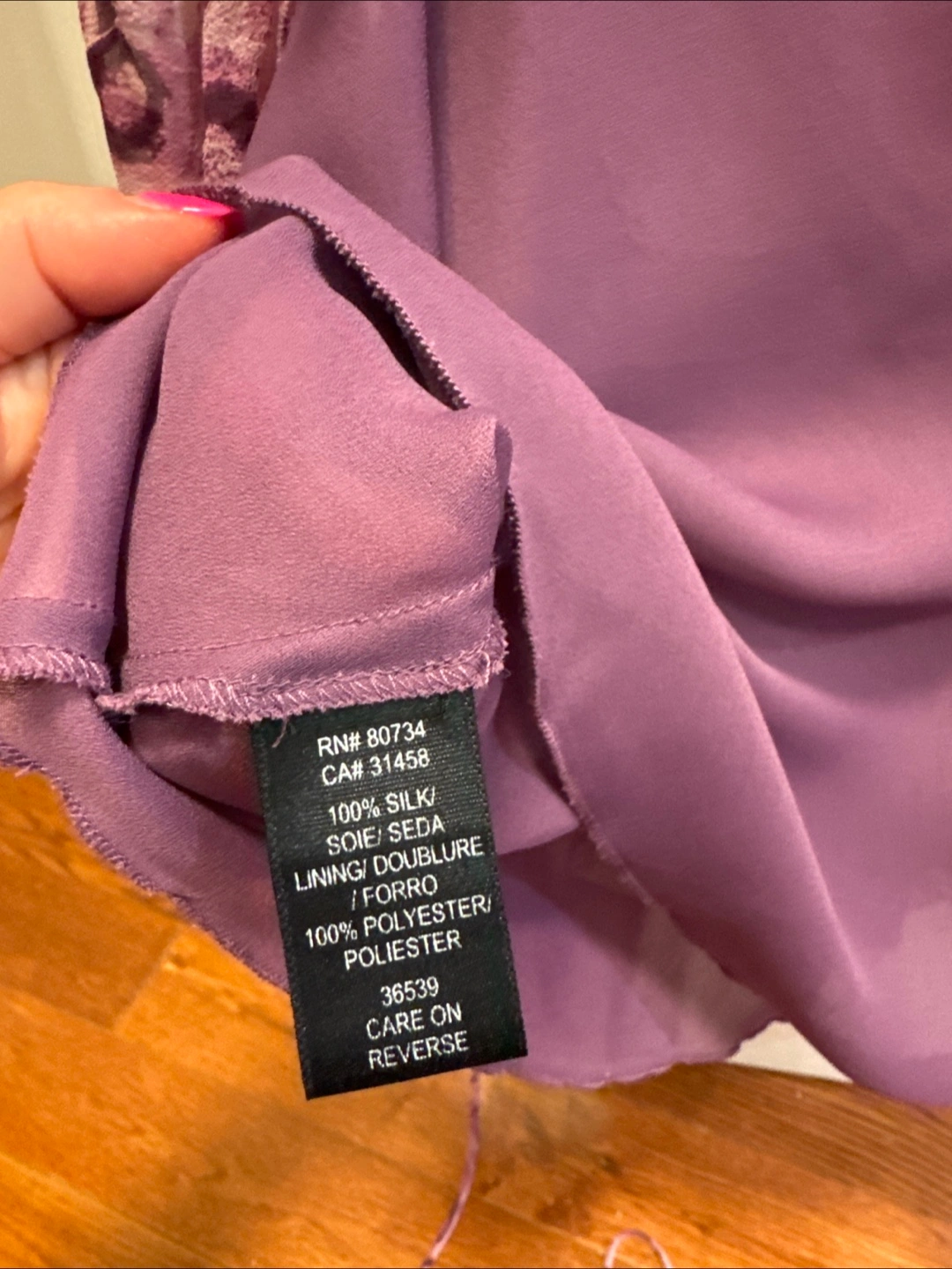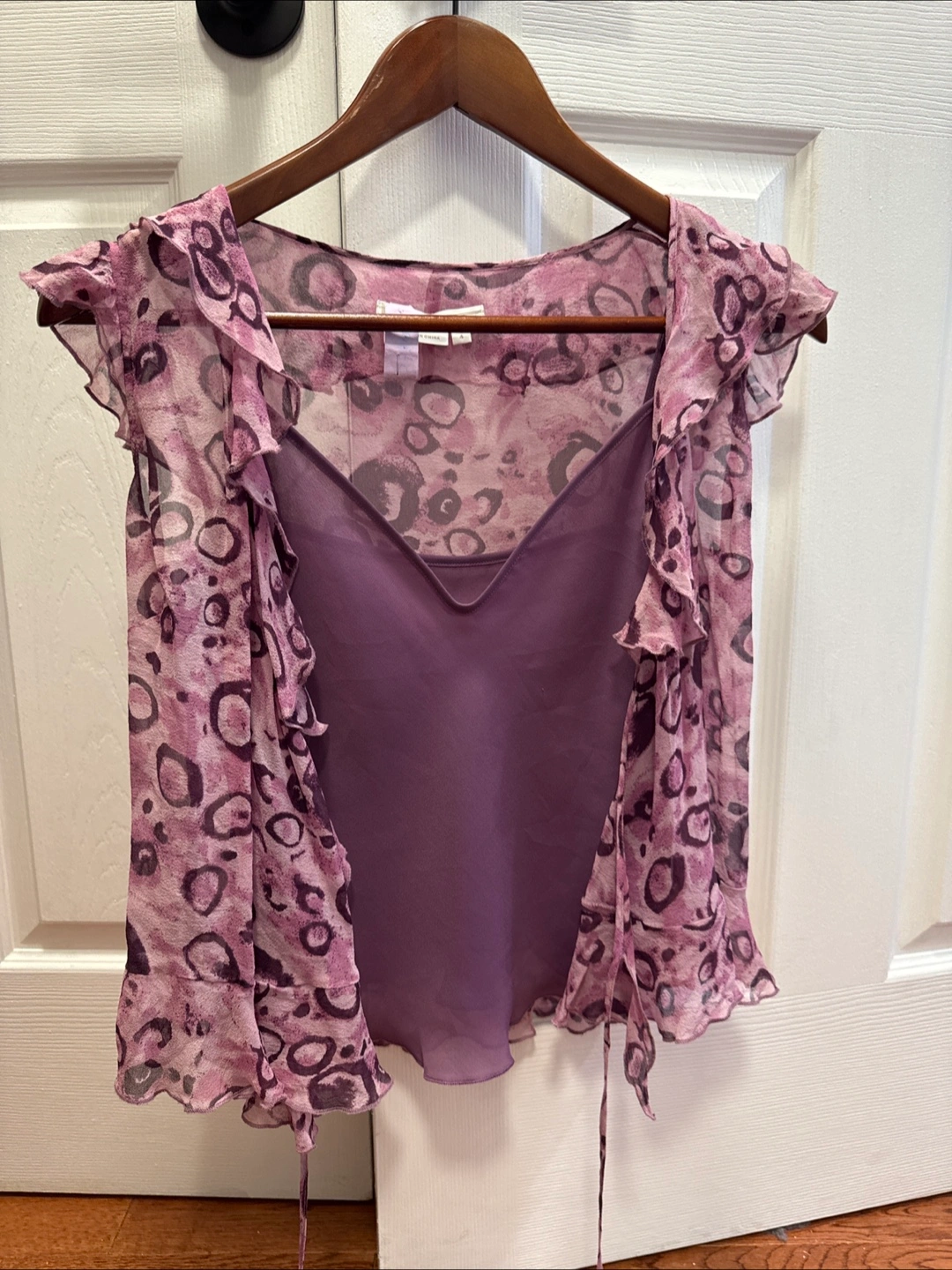 Beautiful two-piece set. Purple silk camisole and sheer cardigan. Size 4. Made in China. 100% silk camisole, polyester lining. Fresh for the cleaners.