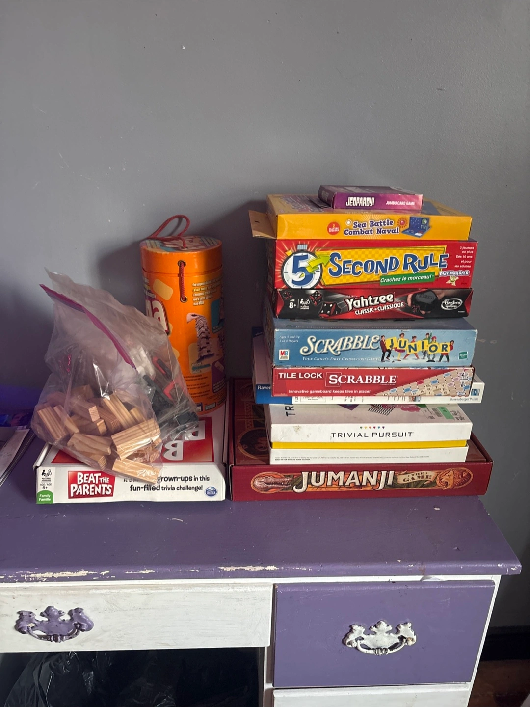 Large collection of board games. Includes classics like Scrabble, Yahtzee, and Trivial Pursuit. Also features newer games. Great for family game night. Some games are in their original boxes.