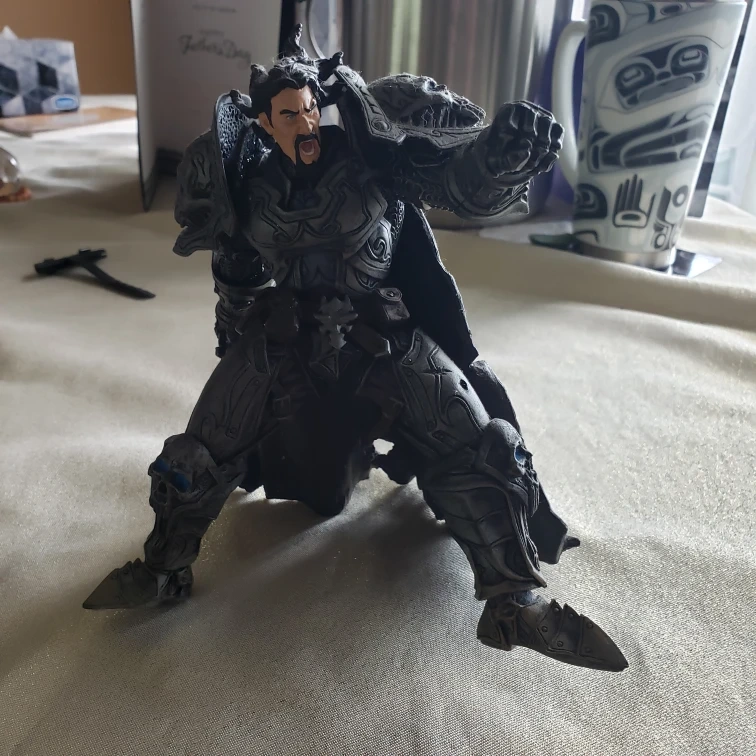 Detailed Arthas figure. Dark armour. Long cape. Collectible. hands twist.