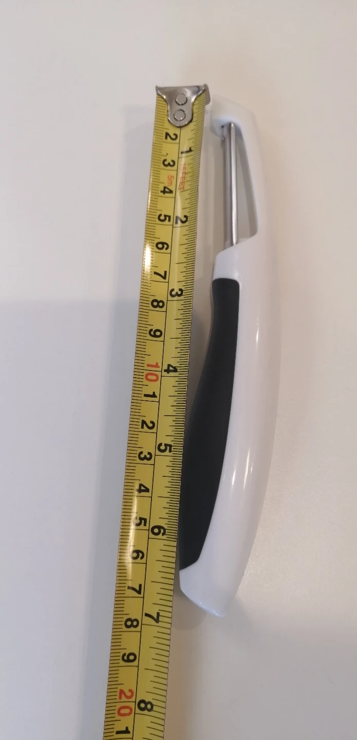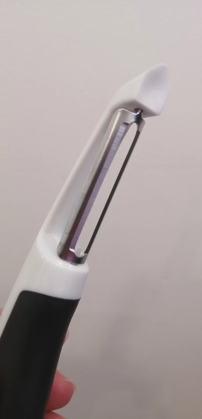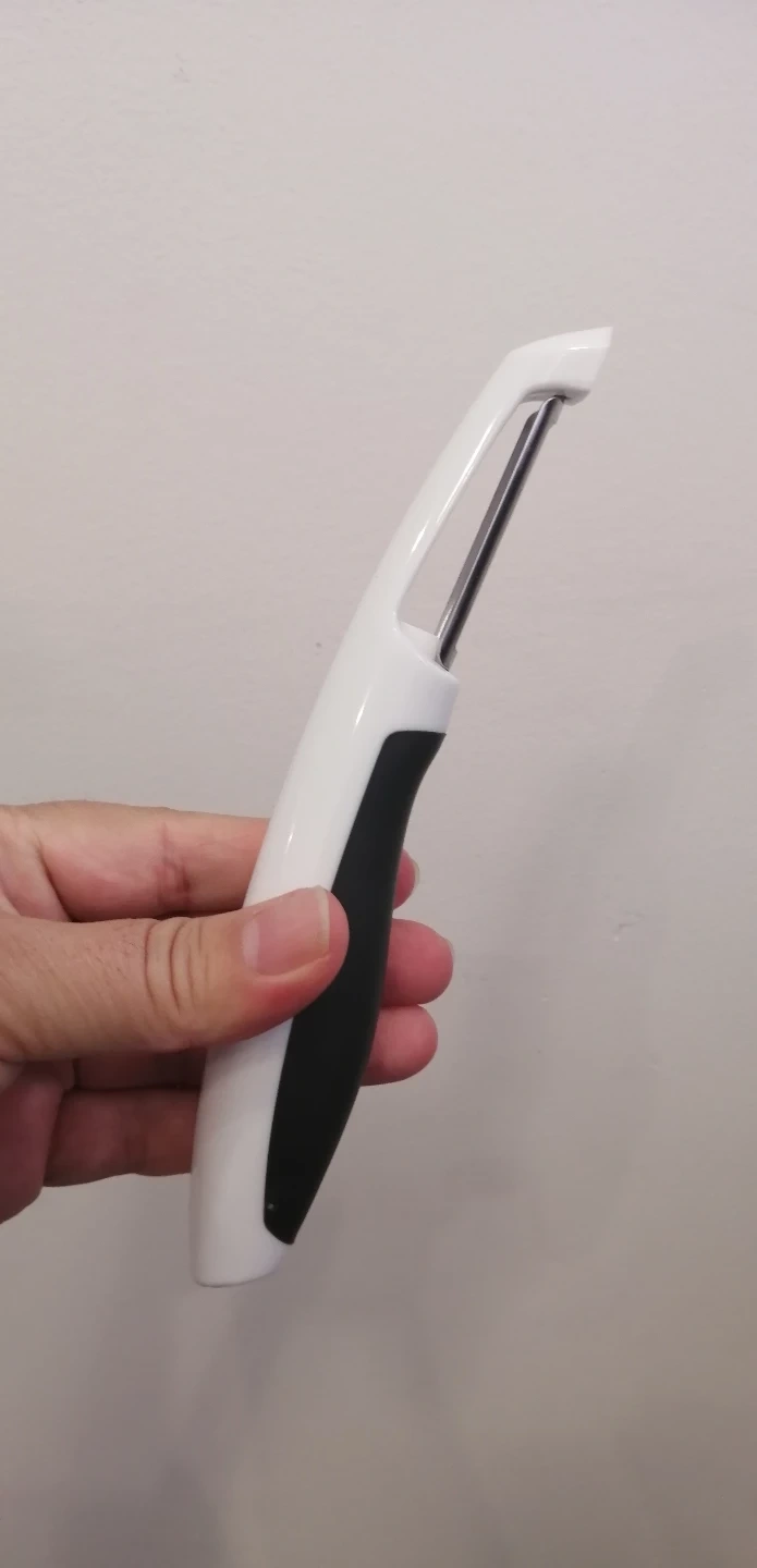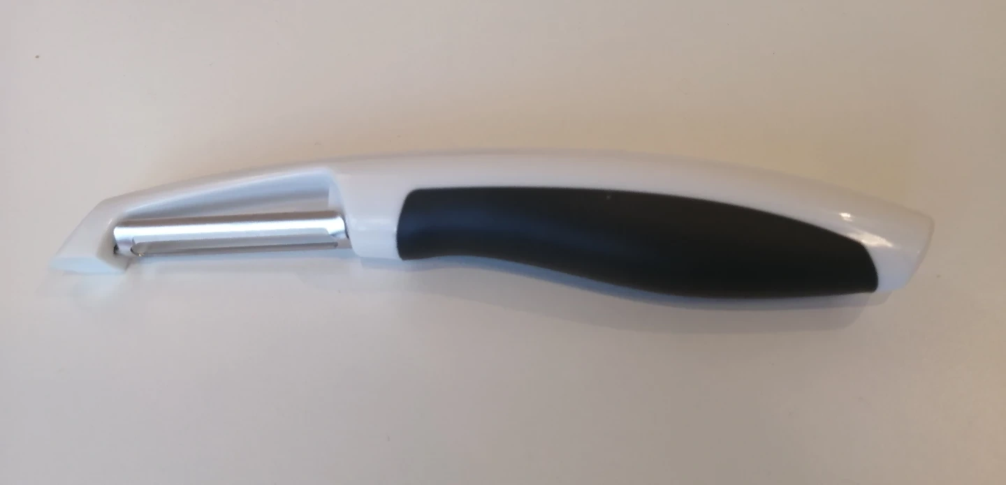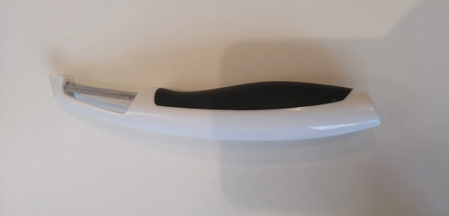 White and black vegetable peeler. Ergonomic handle. Stainless steel blade. Compact design. From smoke and pet-free home About 7" long