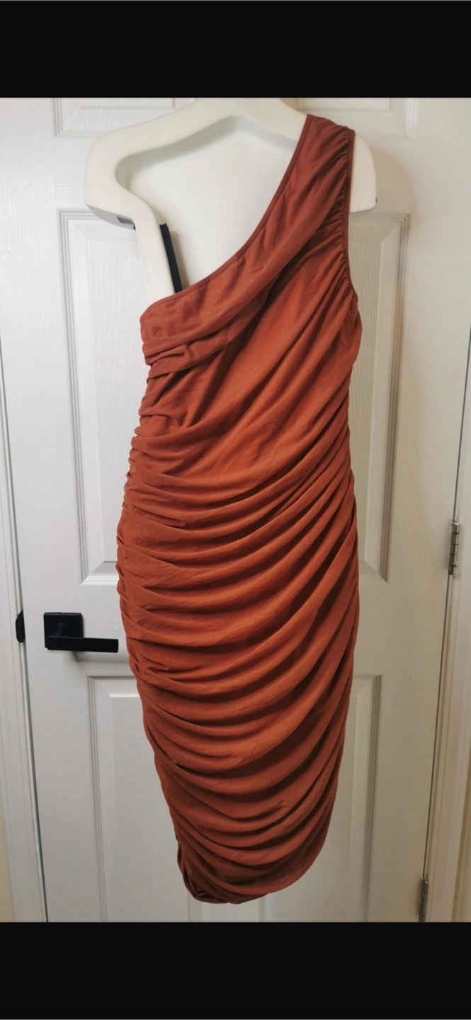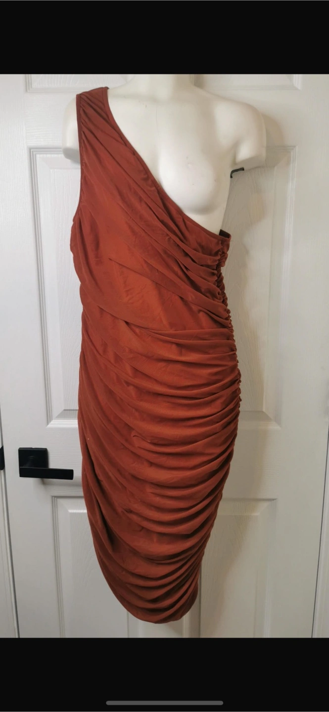 New! Retails for $65. Gorgeous rust-coloured midi dress. One-shoulder design. Ruched fabric. Perfect for a night out or special occasion. Lightweight and stretchy material. UNIQUE DESIGN: One Shoulder Bodycon Dress/Ruched Dress For Women/Sleeveless Midi Dress For Women/Irregular Hem Pencil Dress For Women/Solid Color Fitted Dress For Women/Summer Dress For Women/Cocktail Dress For Women/Party Dress For Women/Beach Dress For Women/Homecoming Dress For Women STYLISH FEATURES: Women Midi Pencil Dress With Trendy One Shoulder Design, Shows Off Your Classy And Chic. The Sleeveless Bodycon Dress More Lightweight To Wear, Perfect For Summer. The Ruched Dress Never Out Fashion, Highlights Your Feminine Charm. Ladies Fitted Dress Shows Your Sexy Curve, Outline Your Beauty. Asymmetrical Hem Style Accentuates Your Legs More Slender. SEXY RUCHED BODYCON DRESS ! The Fitted Dress Comes With Following Colors To Chose: White Pencil Sheath Dress/Pink Hoco Midi Dresses/Khaki Ruched Dress For Teens/Black Night Out Dresses/Wine Red Asymmetrical Bodycon Dress/Dark Green Club Dresses/Light Blue Business Pencil Dress/Army Green One Shoulder Dresses/Caramel Evening Party Dress CHIC MIDI PENCIL DRESSES ! Ladies Pencil Sheath Dress Can Pair With High Heels And Clutch Bag For A Stunning Looks. Women Ruched Bodycon Dress Is A Great Choice For Daily, Party, Dating, Cocktail, Night Out, Dinner, Travel, Holiday, Vacation And So On.