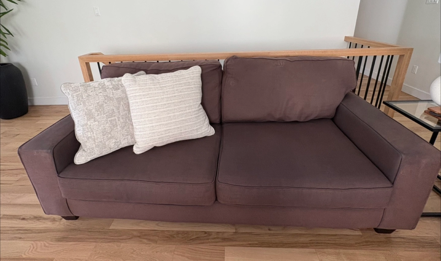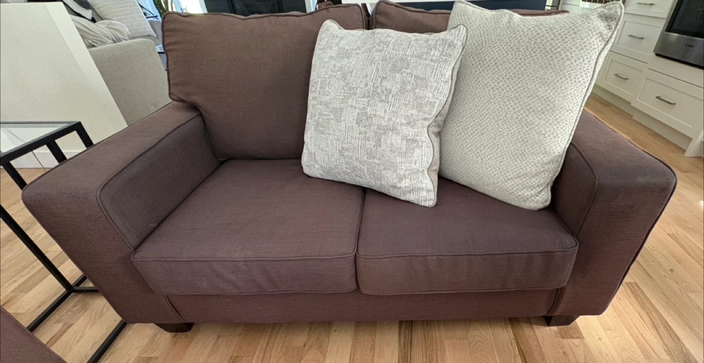 Comfortable loveseat, and couch in good condition. Dark brown fabric slightly faded by the sun. Two throw pillows not included. Measurements: Couch: 83” Wide 38” Deep Love Seat: 63” Wide 38” Deep Please message for any further questions or details. Pickup in Barrhaven by the Vimy Bridge.