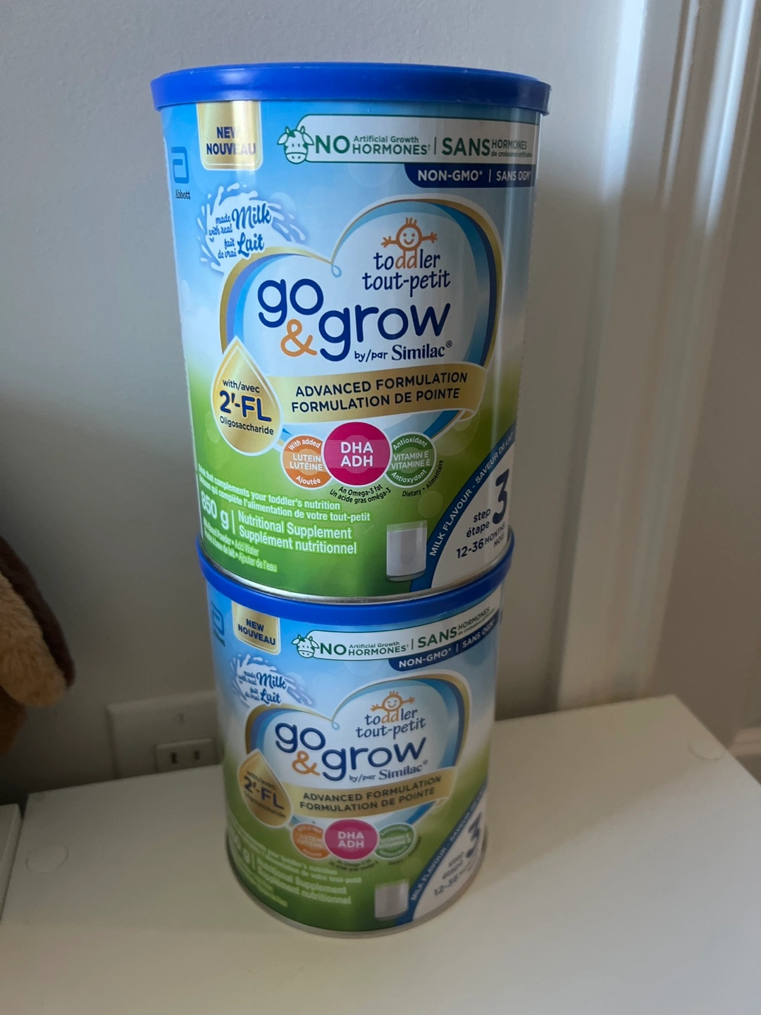 2 cans of Similac Go & Grow toddler formula. Expiry date 2025. Artificial growth hormone-free and non-GMO. Advanced formulation. Contains 2-FL, DHA, ARA, Lutein, and Vitamin D. $25 each