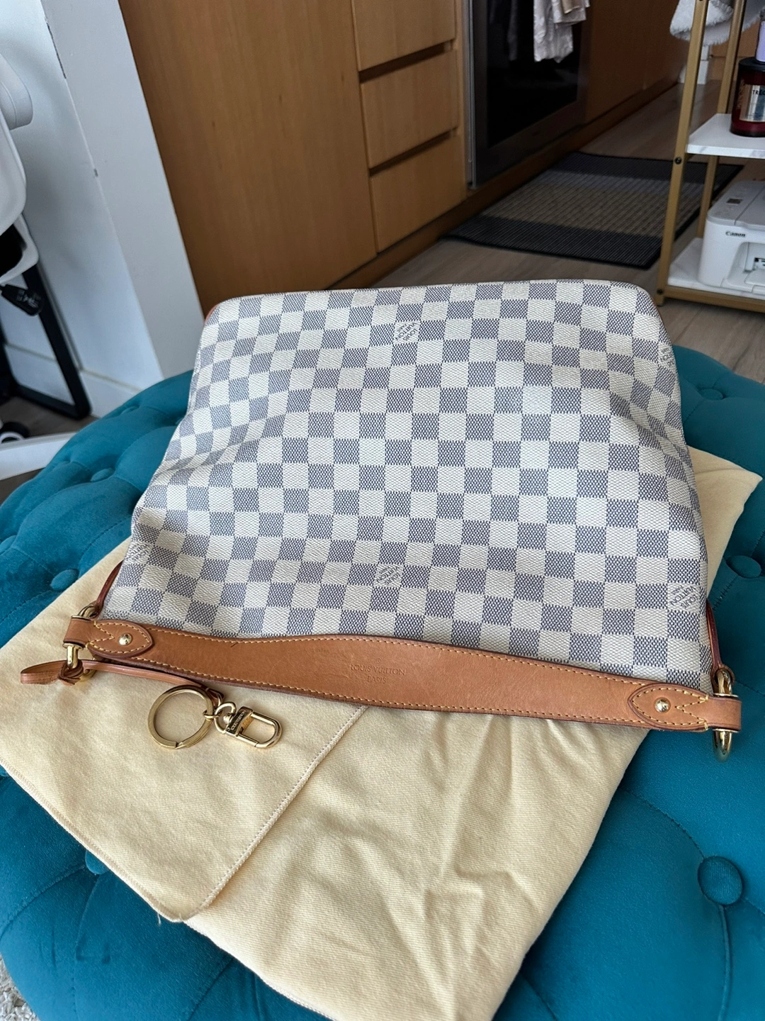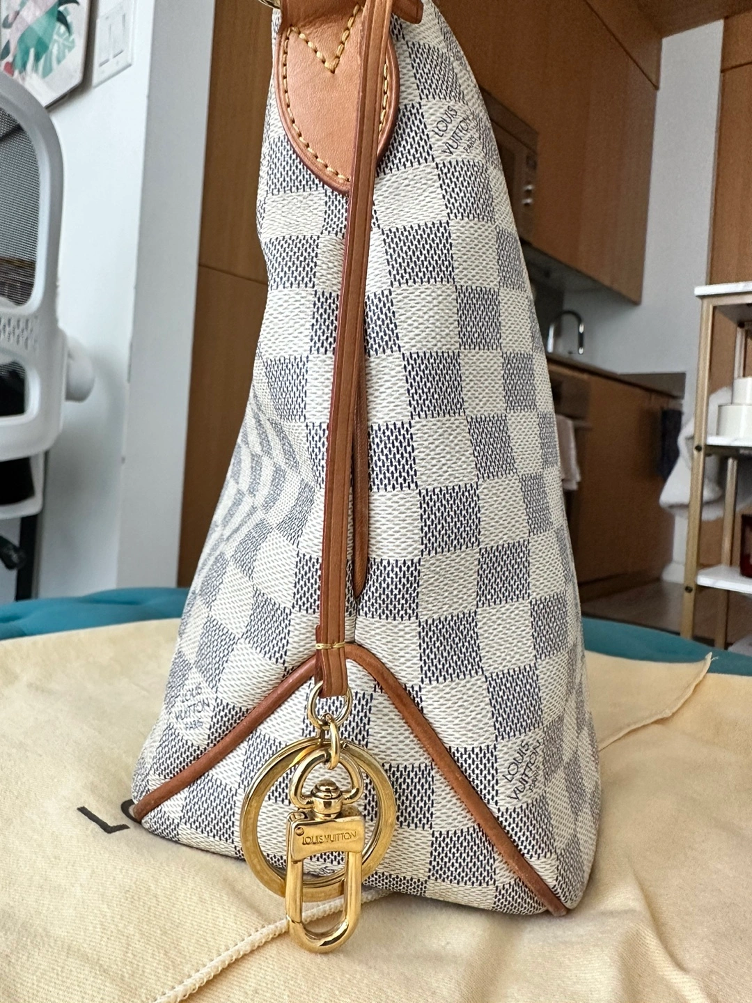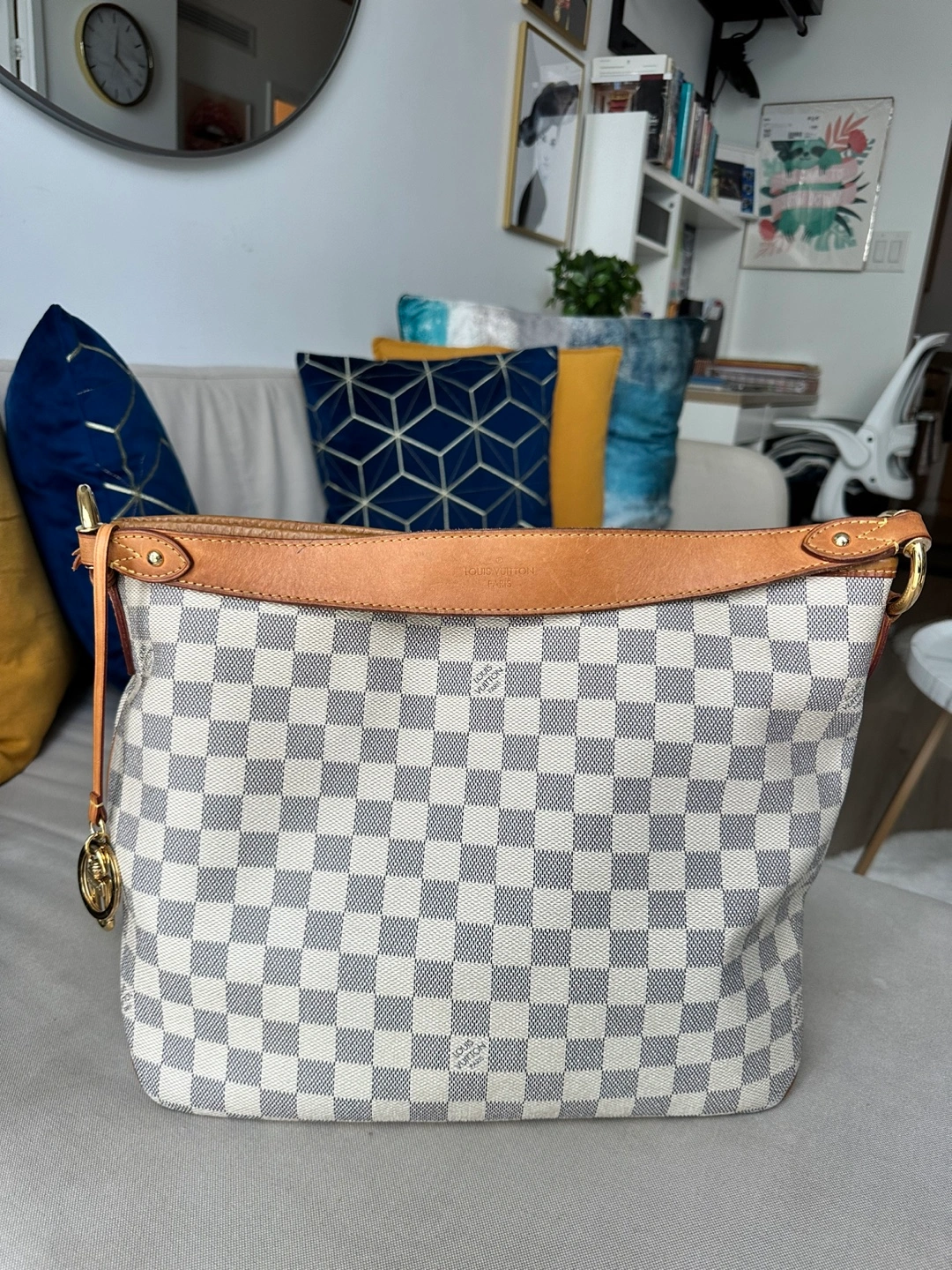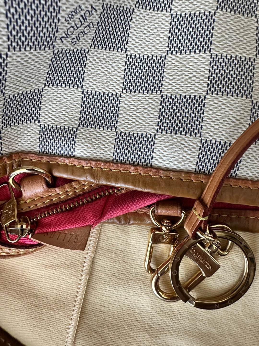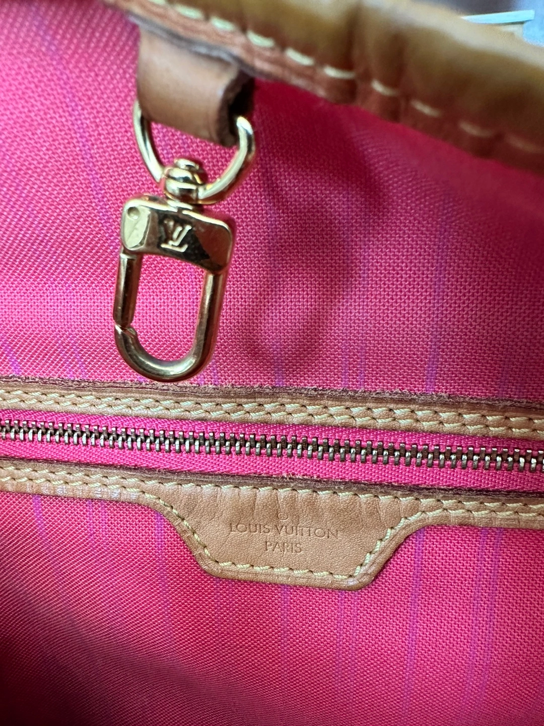 Authentic Louis Vuitton Delightful PM tote bag. Inside has 1 zipper pocket. Comes with the ring inside to attach small pouches or keys. Has a very spacious pink interior. Can be comfortably carried on the shoulder. Pre-Loved. Moderate Signs of Wear Throughout. Significant Wear on Leather Trim and Some Scratching on Handle. Minor Spots on Canvas Lining. Made in France Manufacturing made : SD 1175 Handle Drop: 6.25" Height: 11.25" Width: 14.75" Depth: 5.25" Dust bag included.