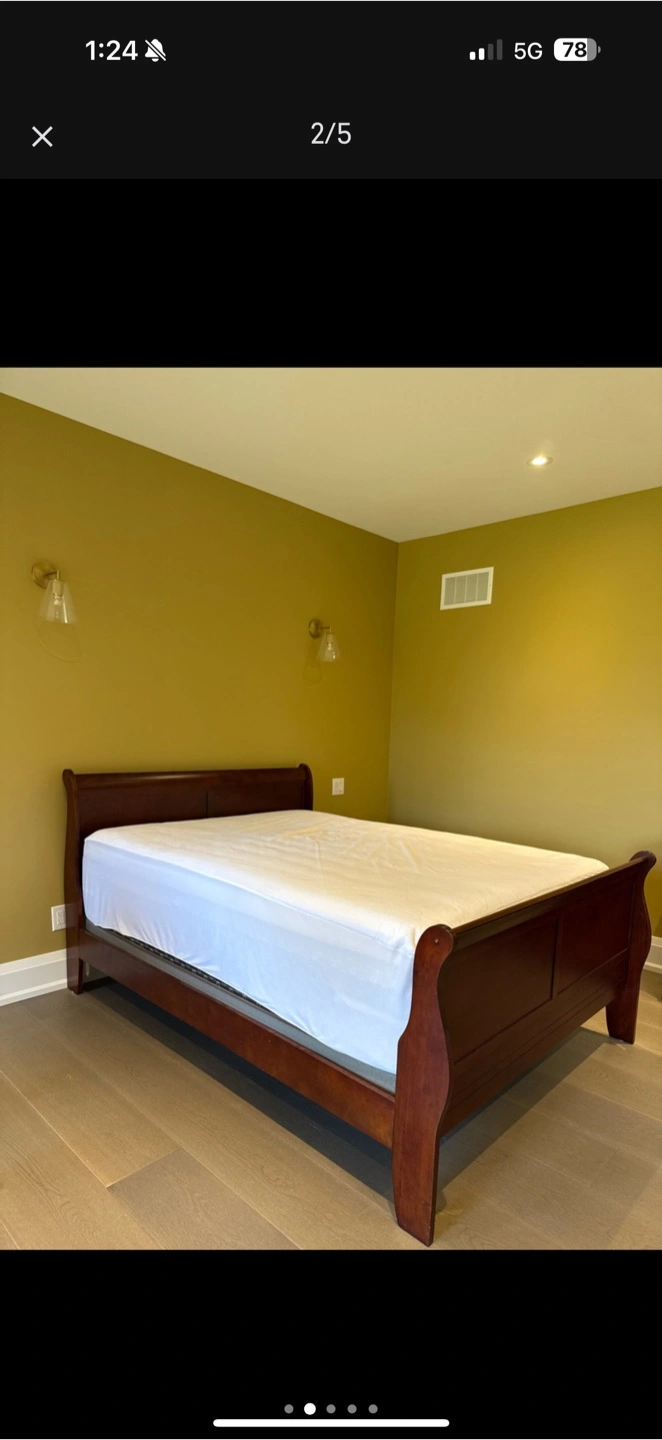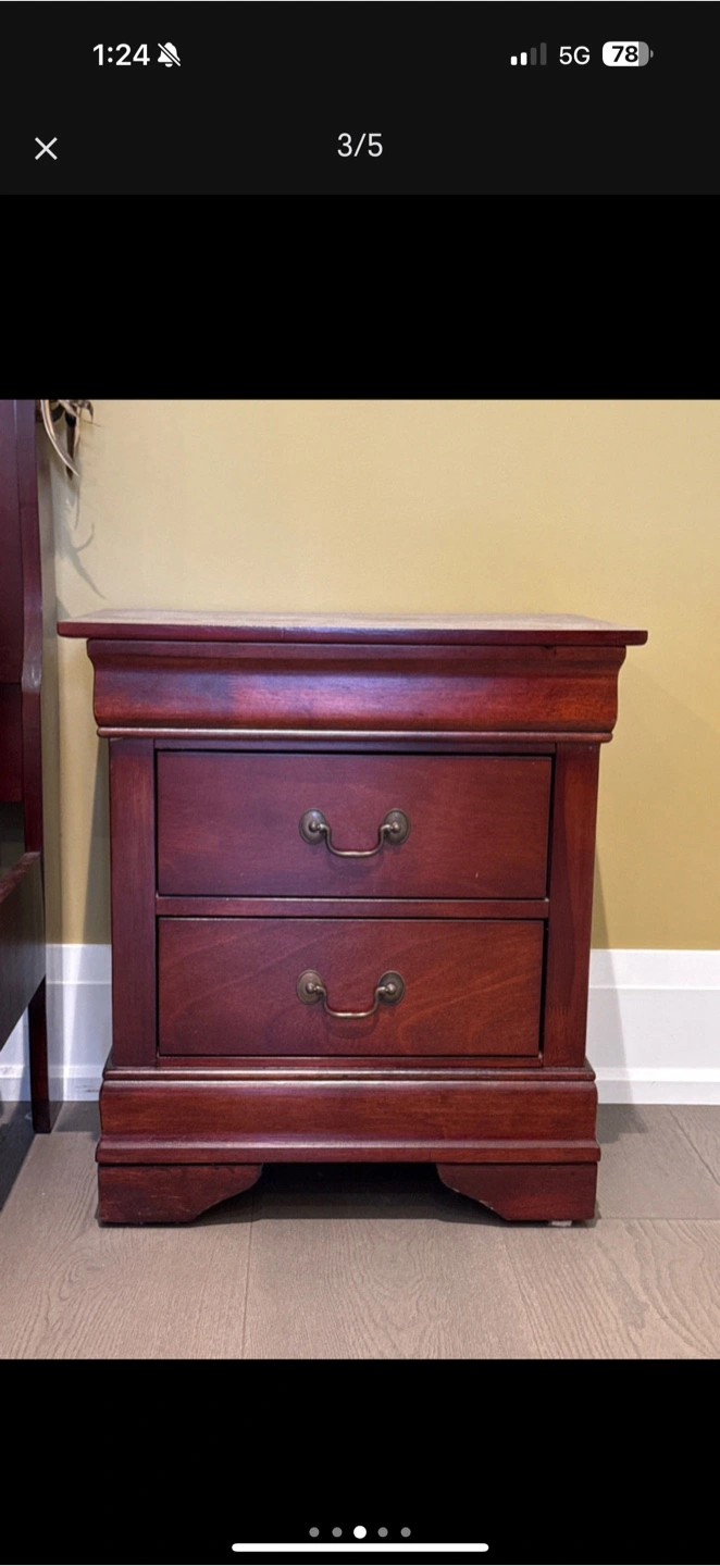 Beautiful dark wood bedroom set. Includes a queen sleigh bed, a nightstand with three drawers, and a six-drawer dresser. Solid wood construction. Excellent condition.