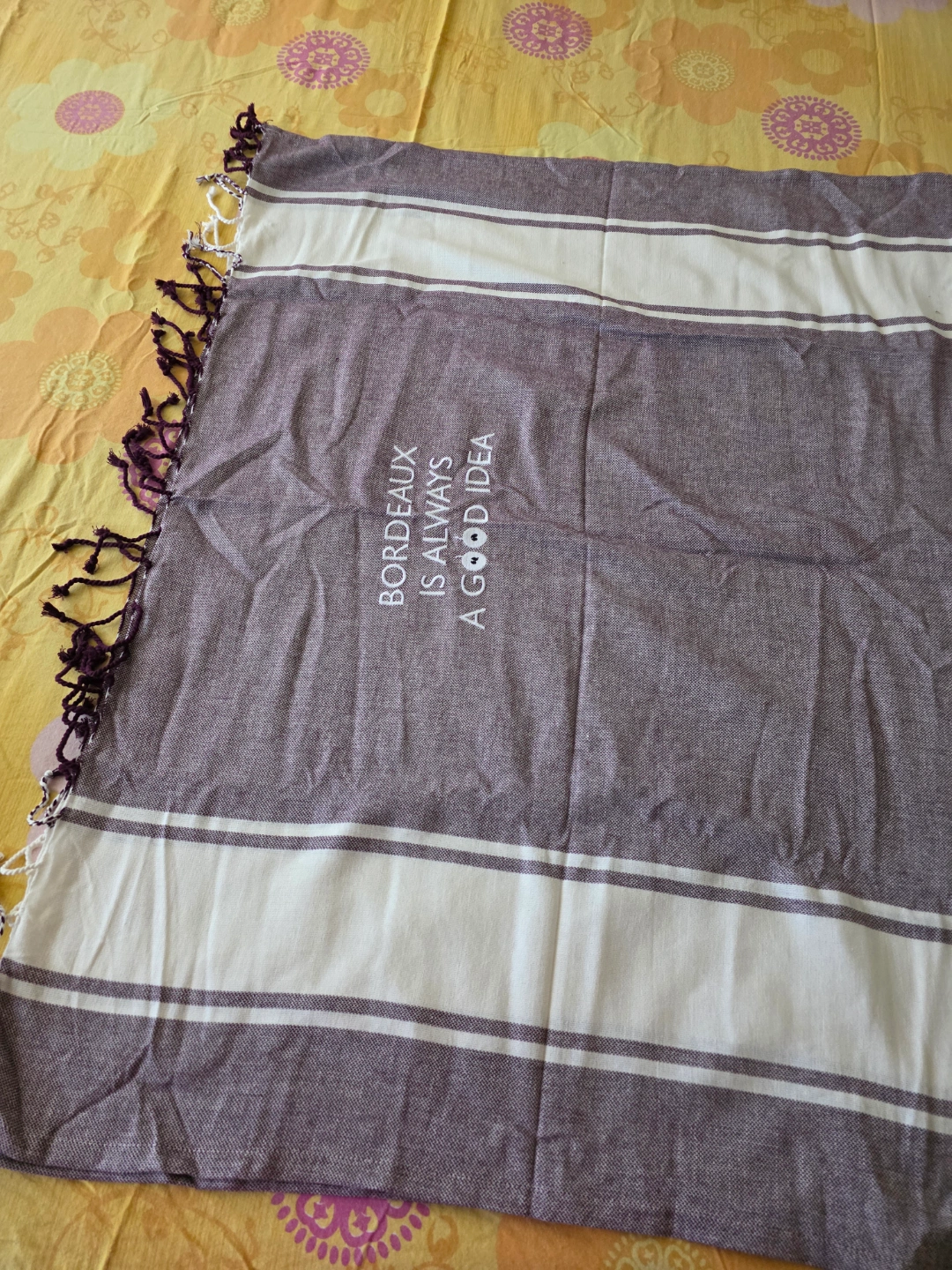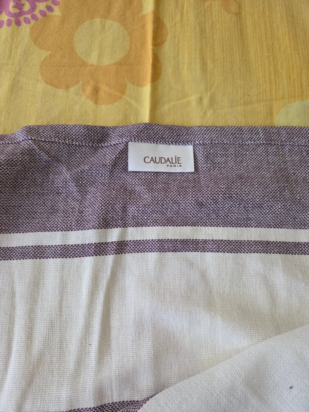 Large purple and white striped beach towel from Caudalie. (Also referred to as Fouta) Features embroidered text and purple fringe. Perfect for the beach or pool. Cotton material. New, never used.