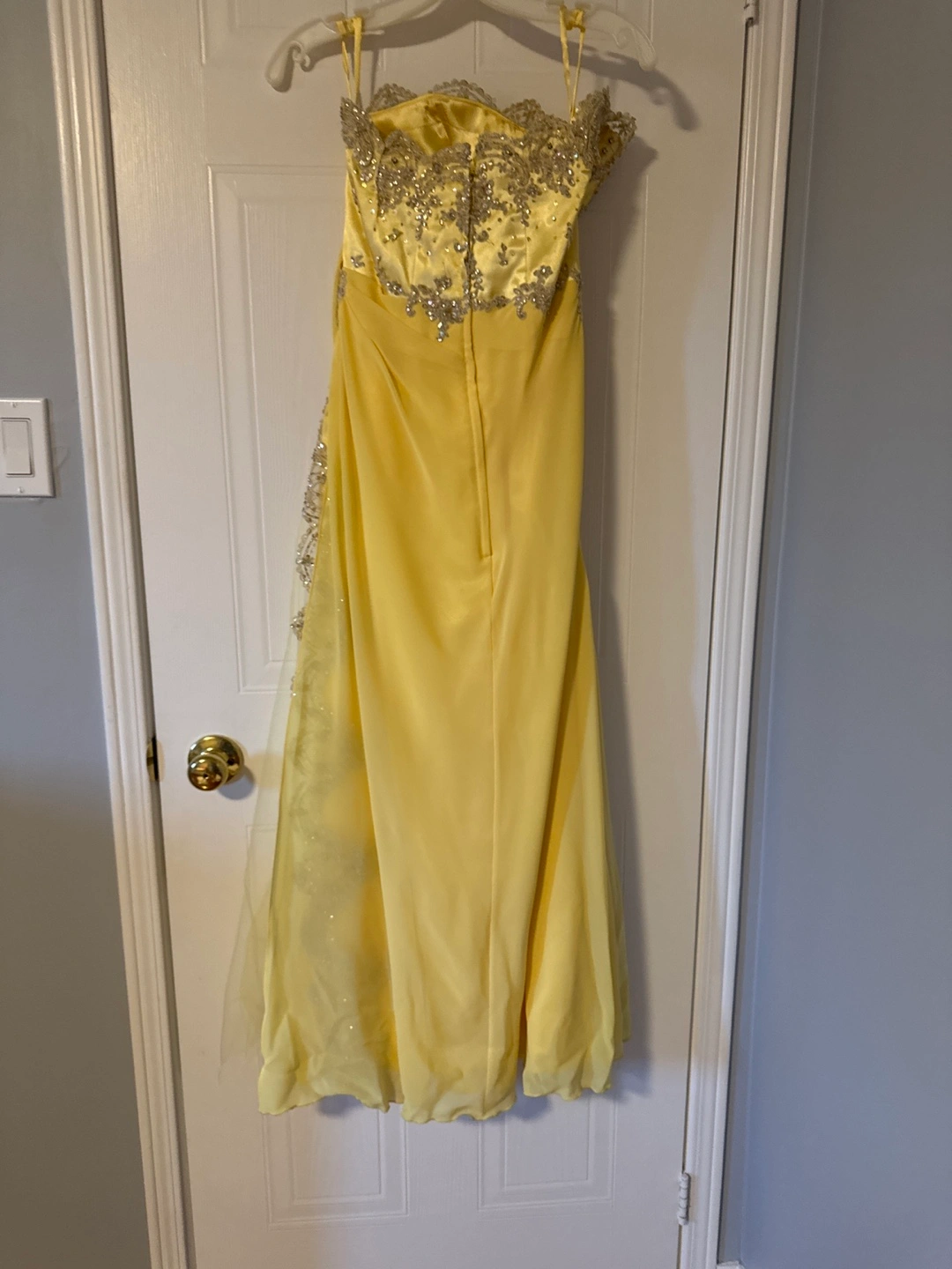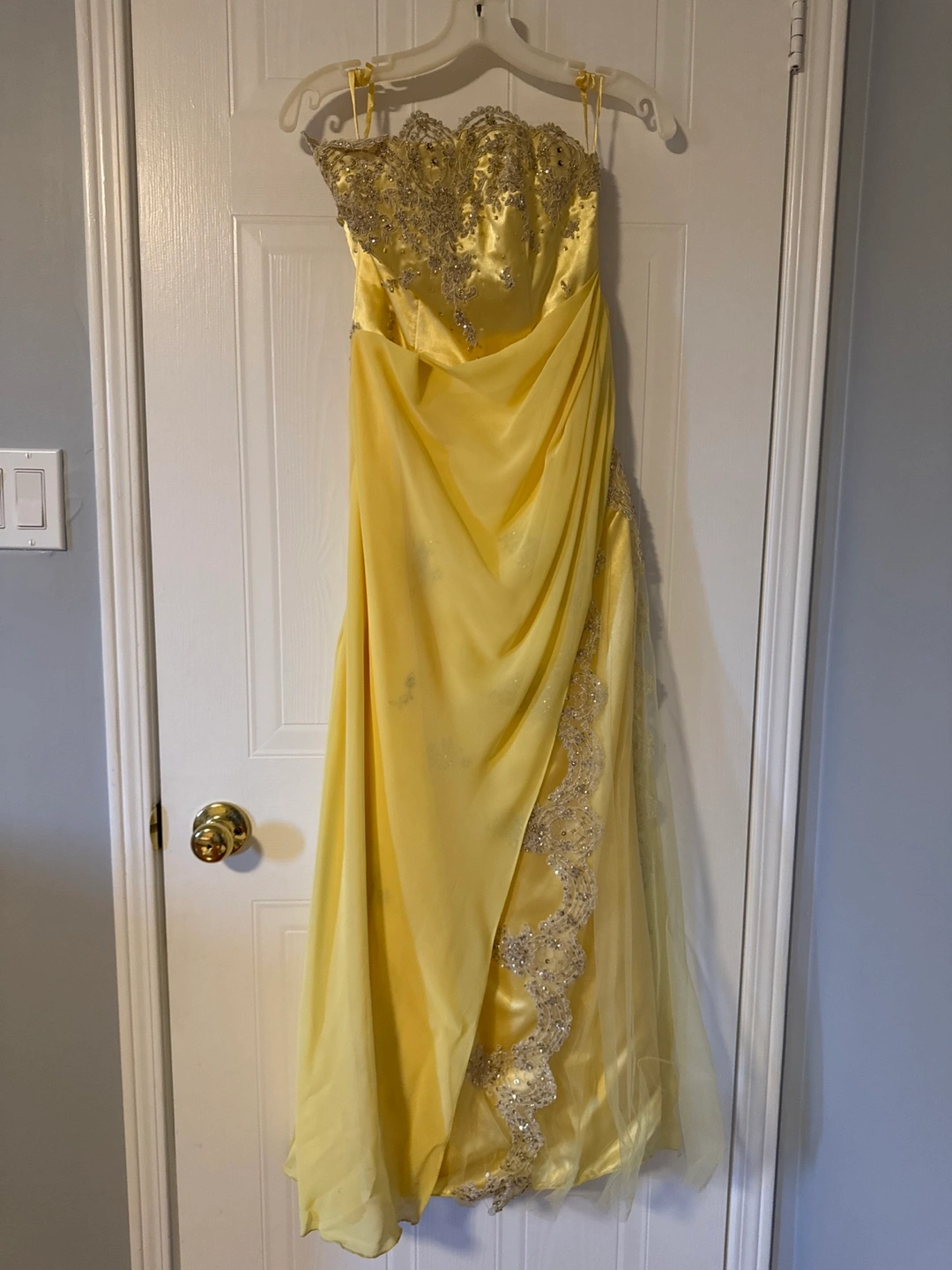 Beautiful yellow formal dress. Strapless bodice with intricate beading. Flowing chiffon skirt. Perfect for prom.